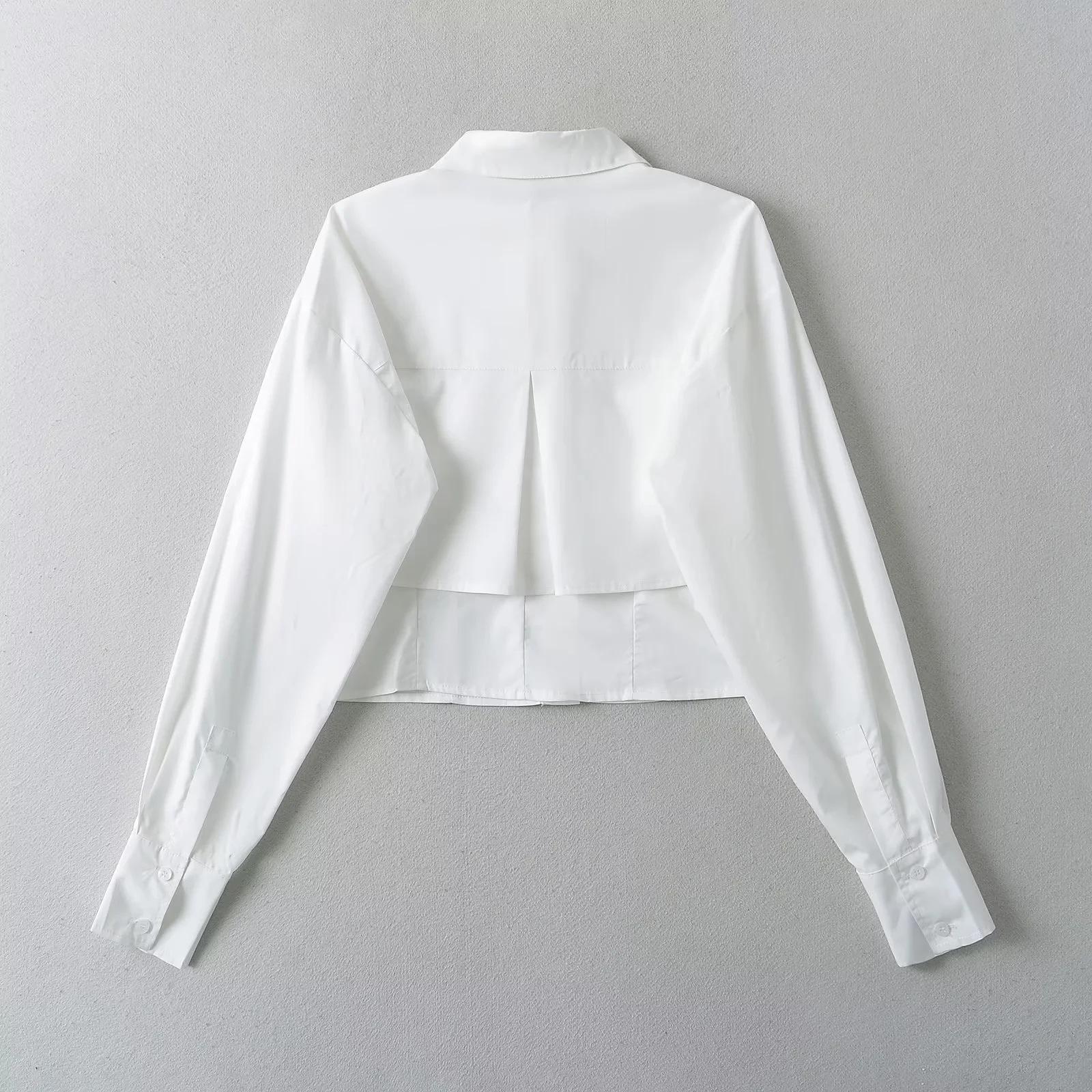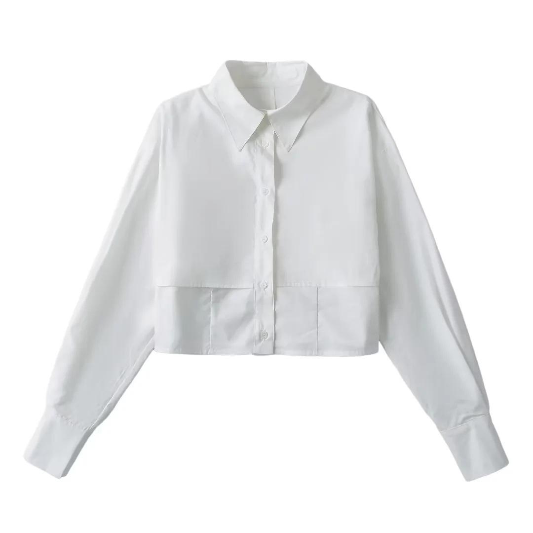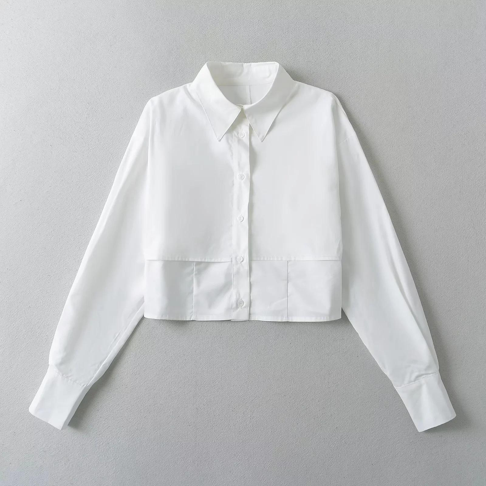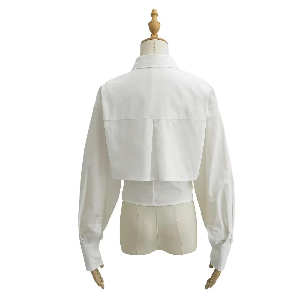 Camisa sencilla y fresca de estilo coreano para mujer, blusa informal de manga larga con solapa corta, botonadura sencilla, cintura alta y hombros descubiertos.