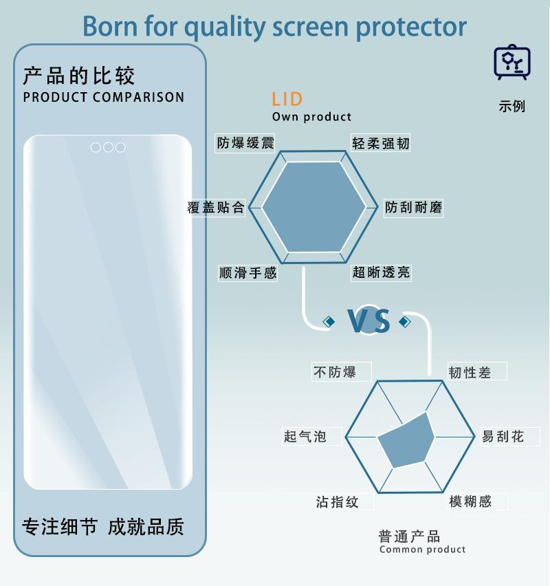 1. Las películas de alta definición, esmeriladas y antideflagrantes están hechas de PET, un material altamente transparente. La película nanoflexible está hecha de TPU.