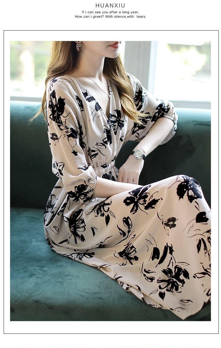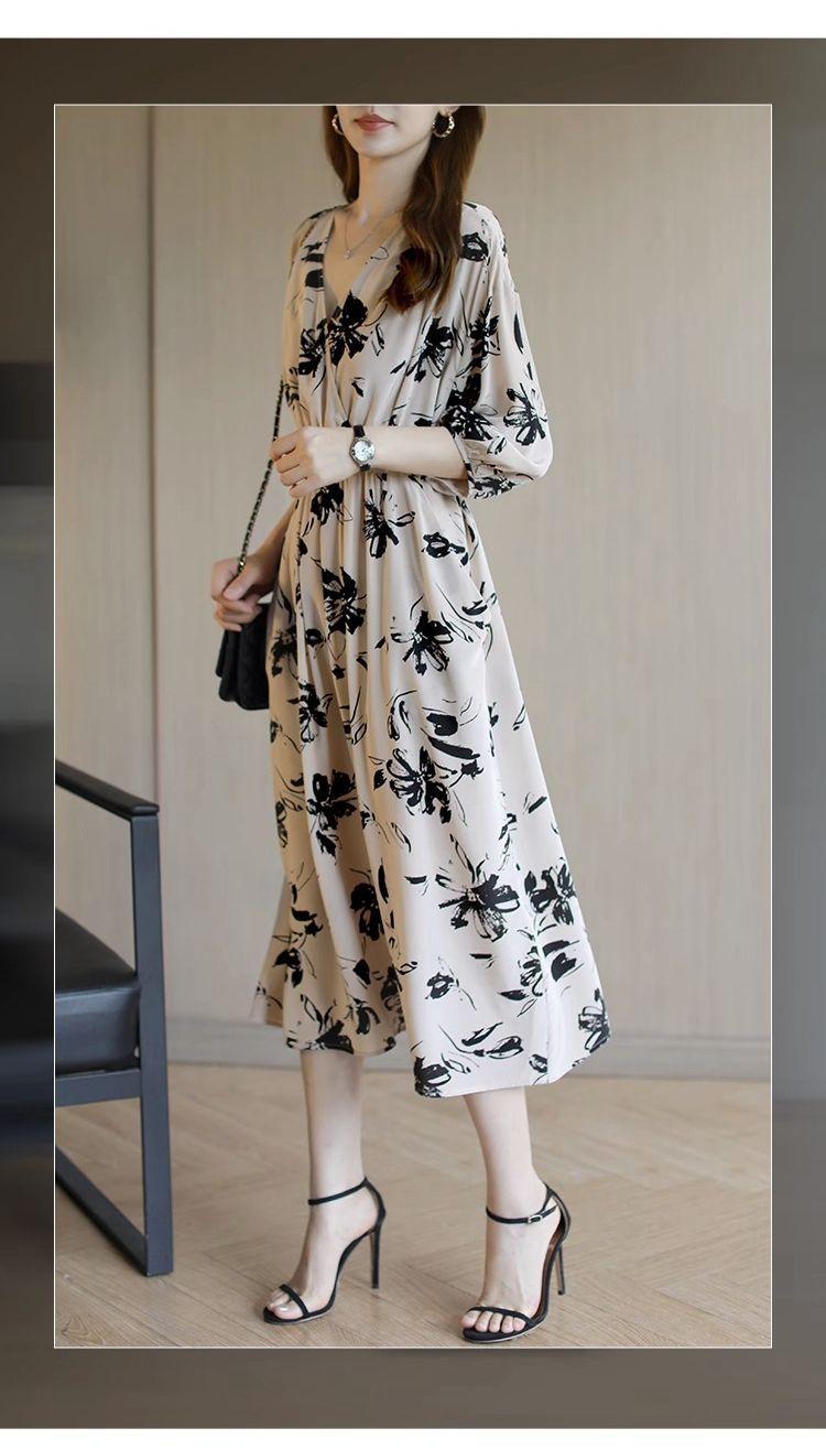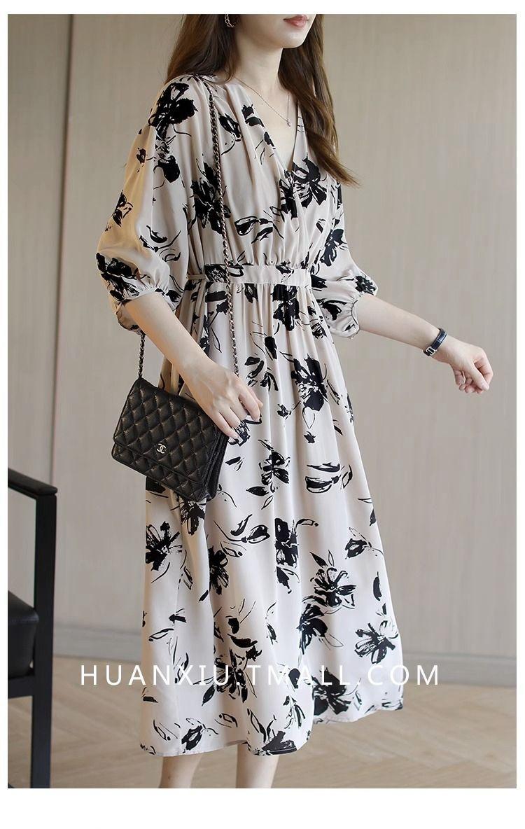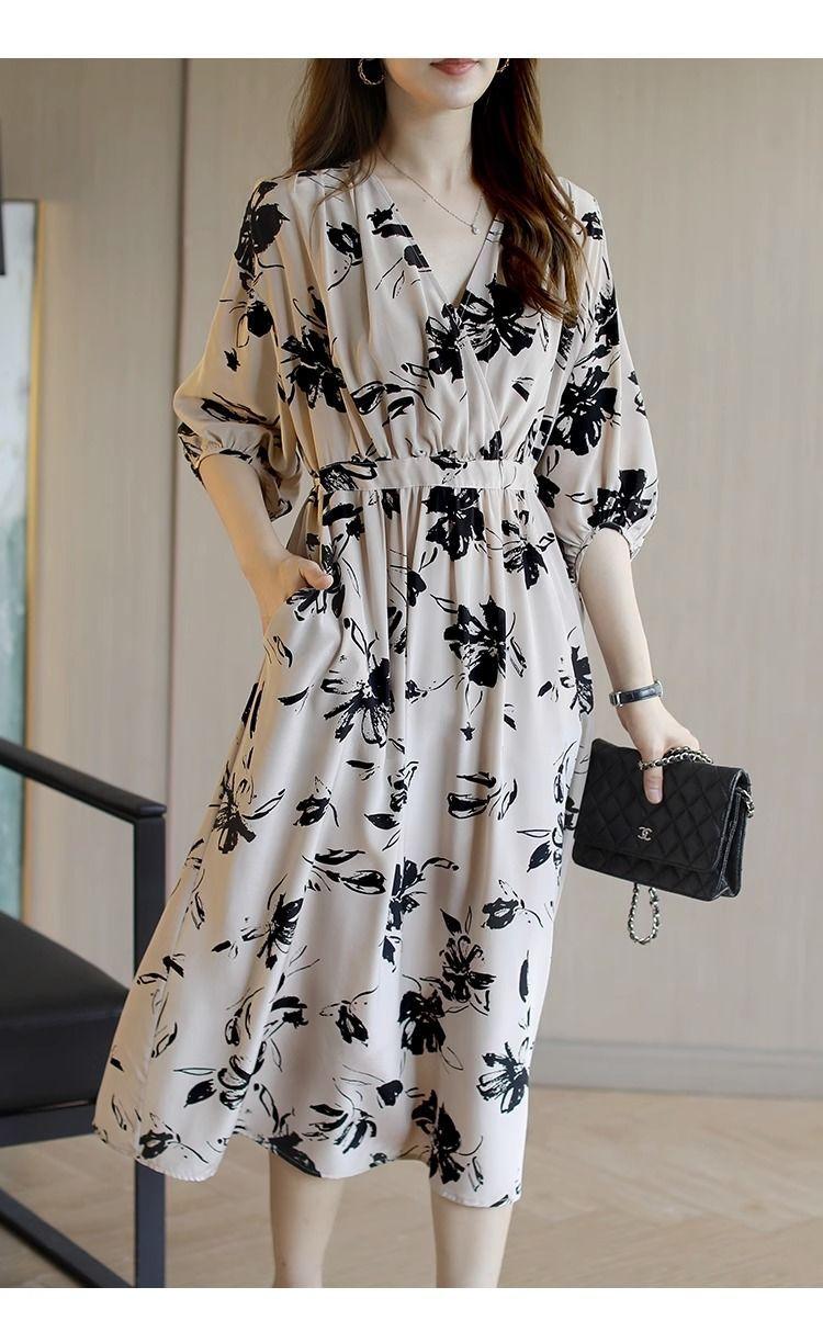 Nuevo vestido de mujer de primavera y verano estilo coreano con cuello en V estampado cintura ajustada temperamento adelgazante vestido de longitud media