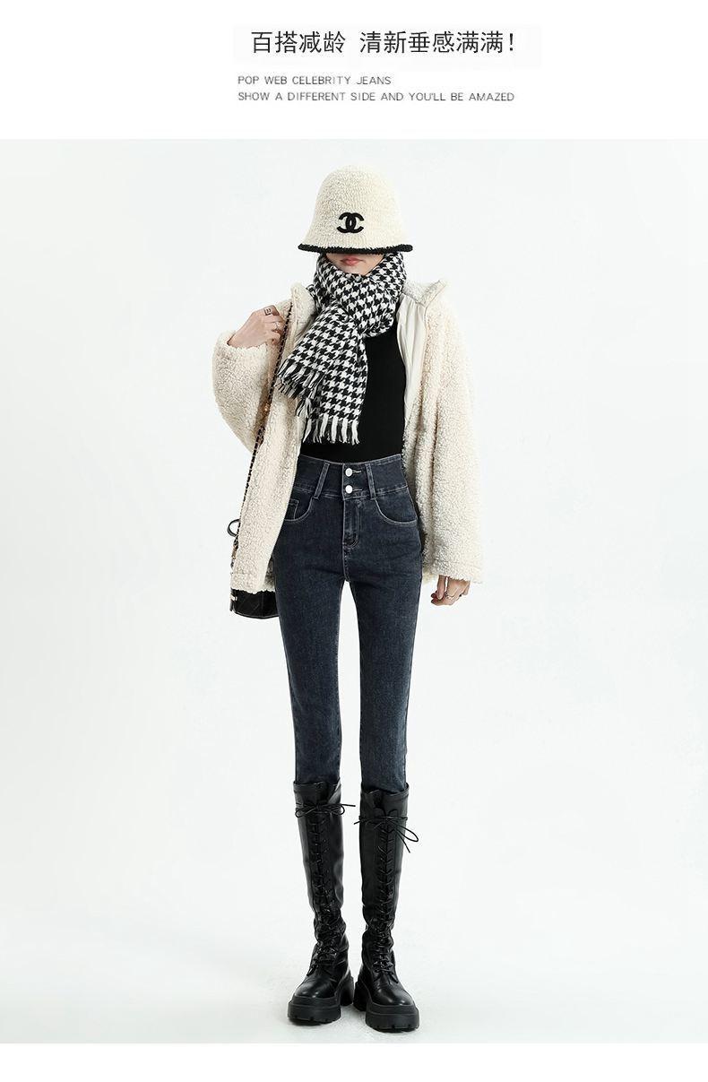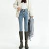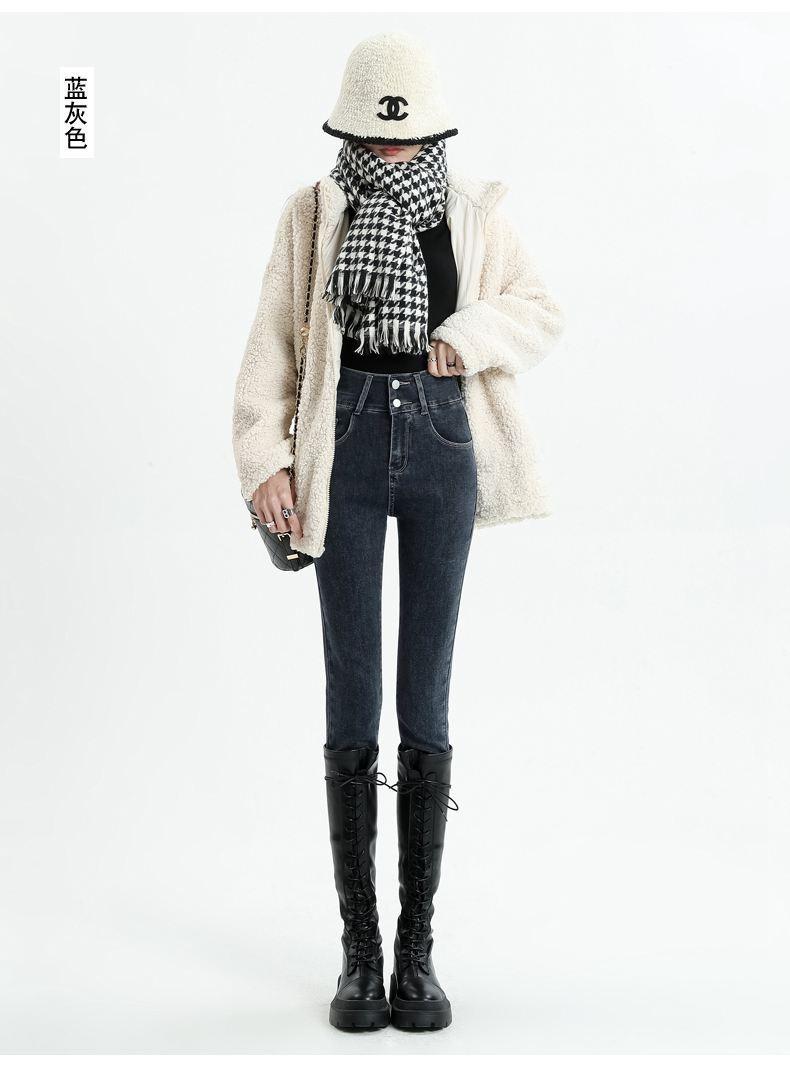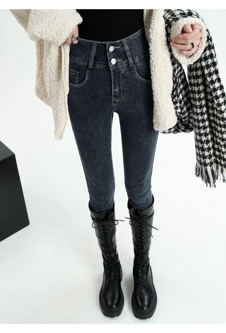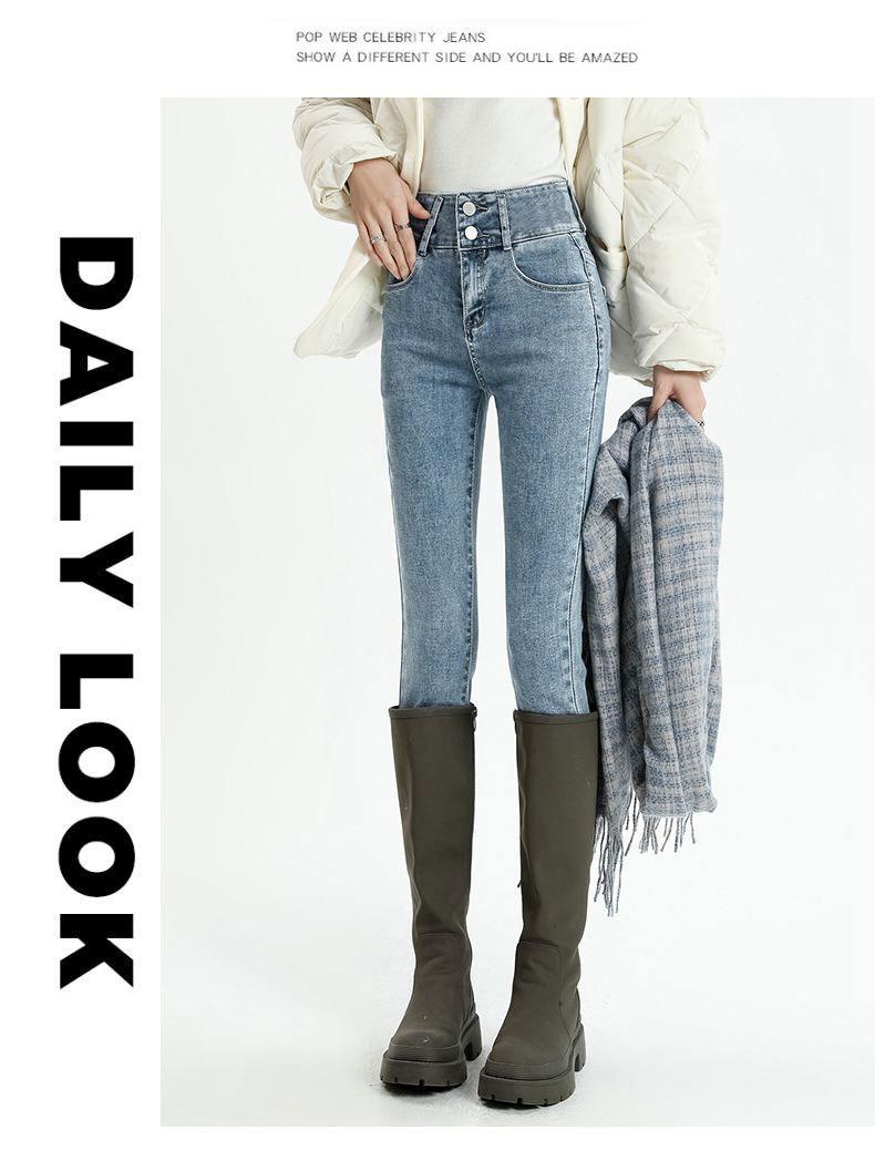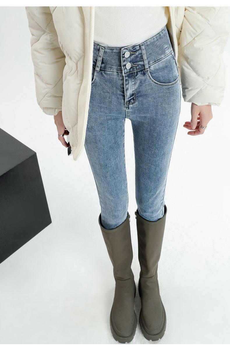 Pantalones vaqueros azul grisáceos para mujer, otoño e invierno, cintura alta, doble hebilla, corte entallado, nueve puntos elásticos, ajustados, combinables con todo.