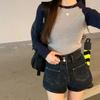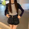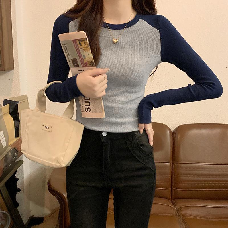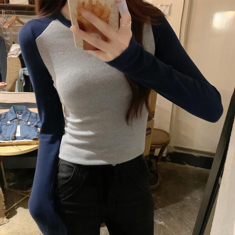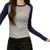 Camiseta de manga larga estilo americano retro con contraste de color para mujer, nueva camiseta de otoño ajustada con hombros descubiertos de estilo Spice Girl, top con base de hilo de estilo simple