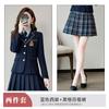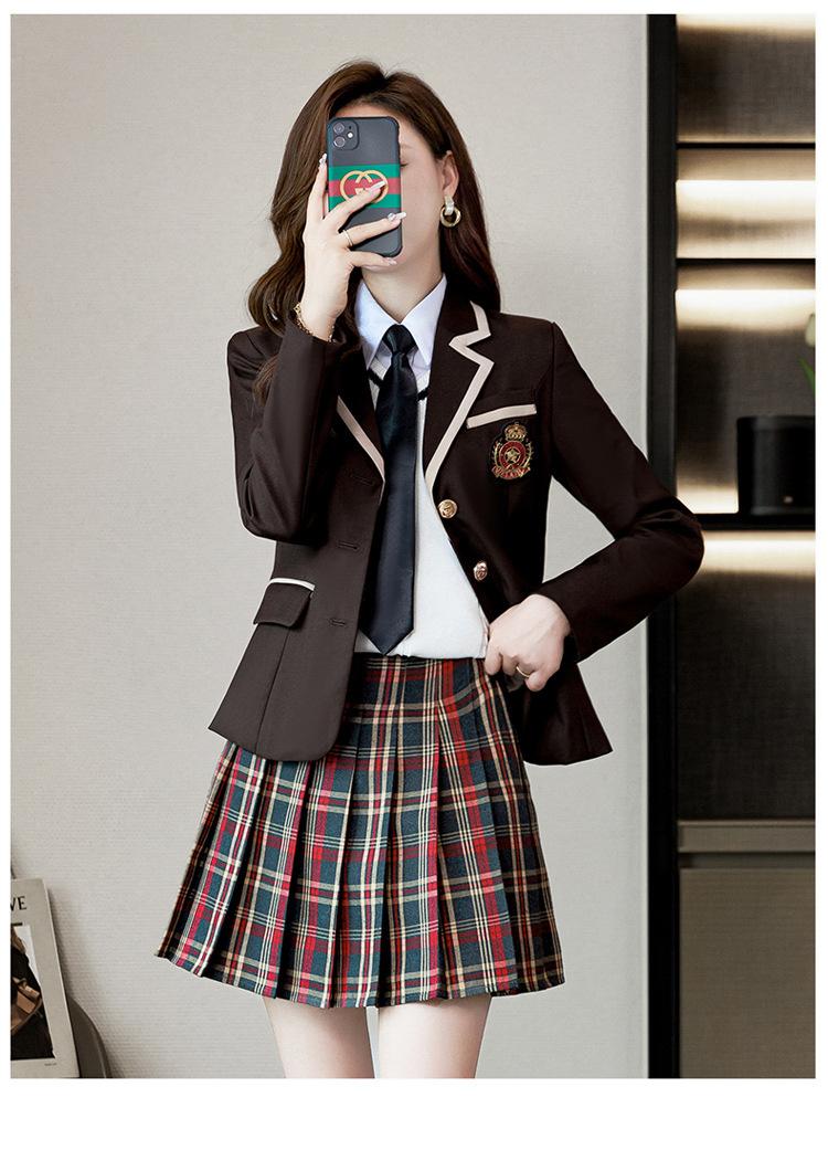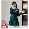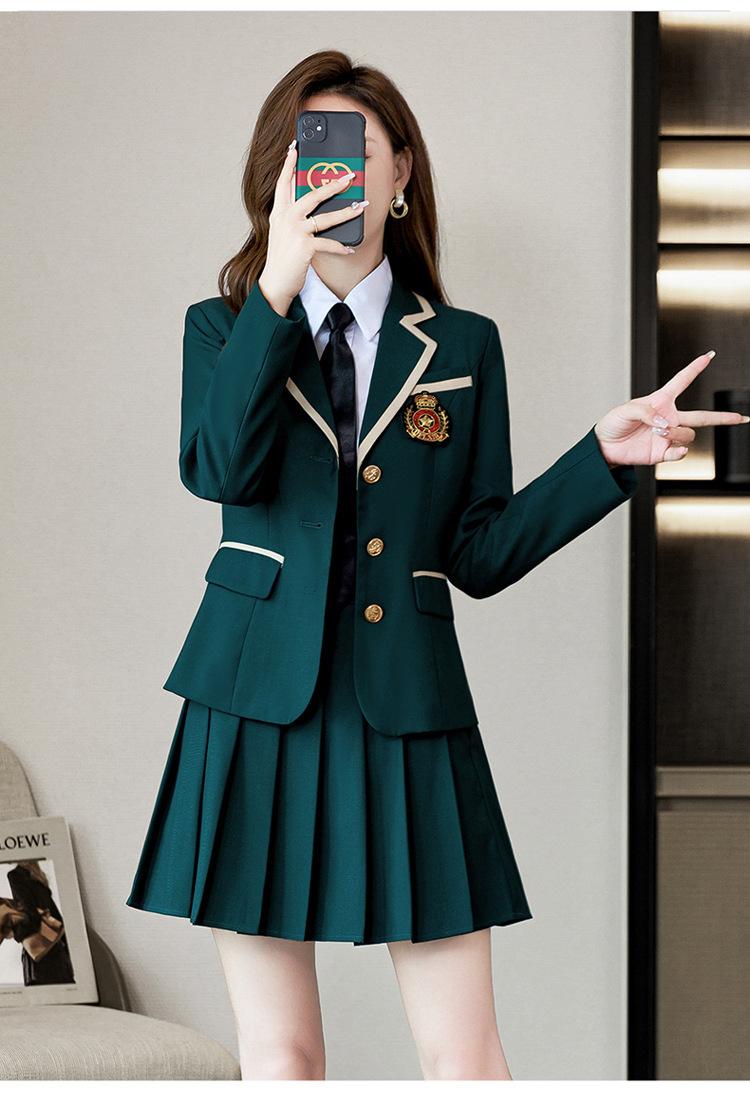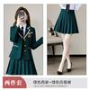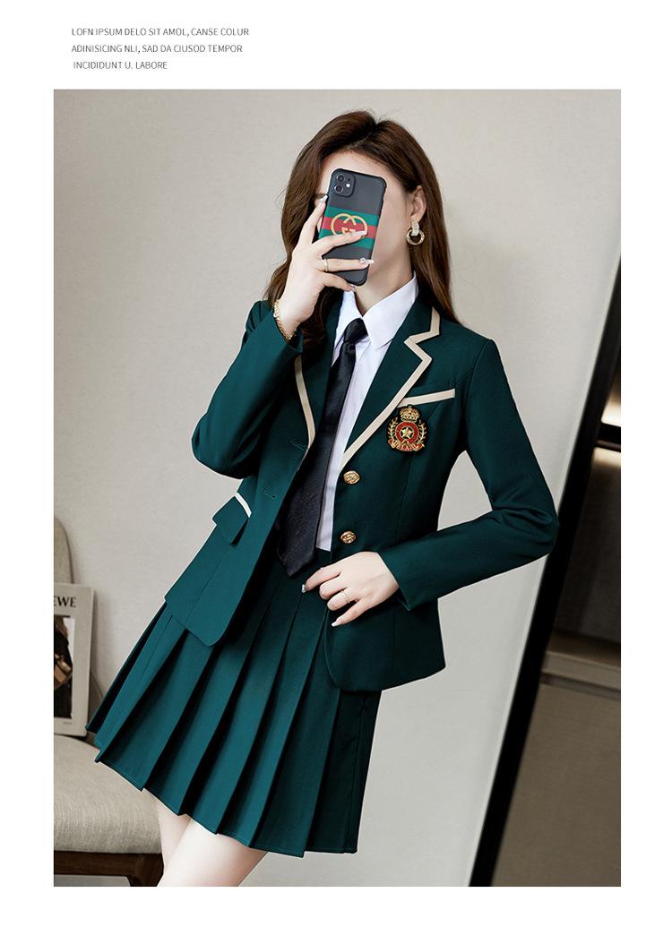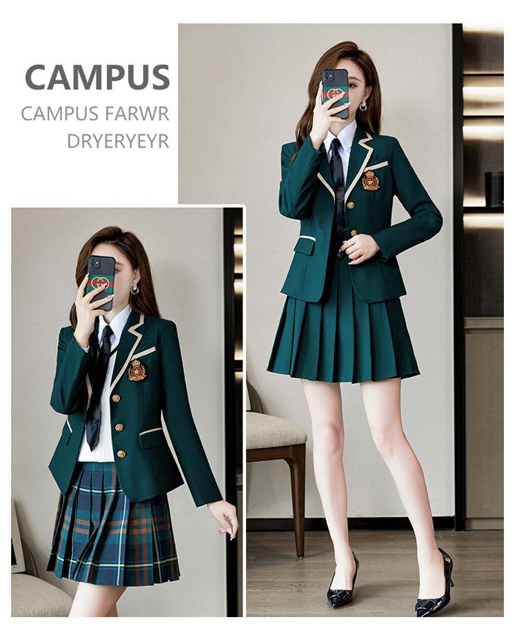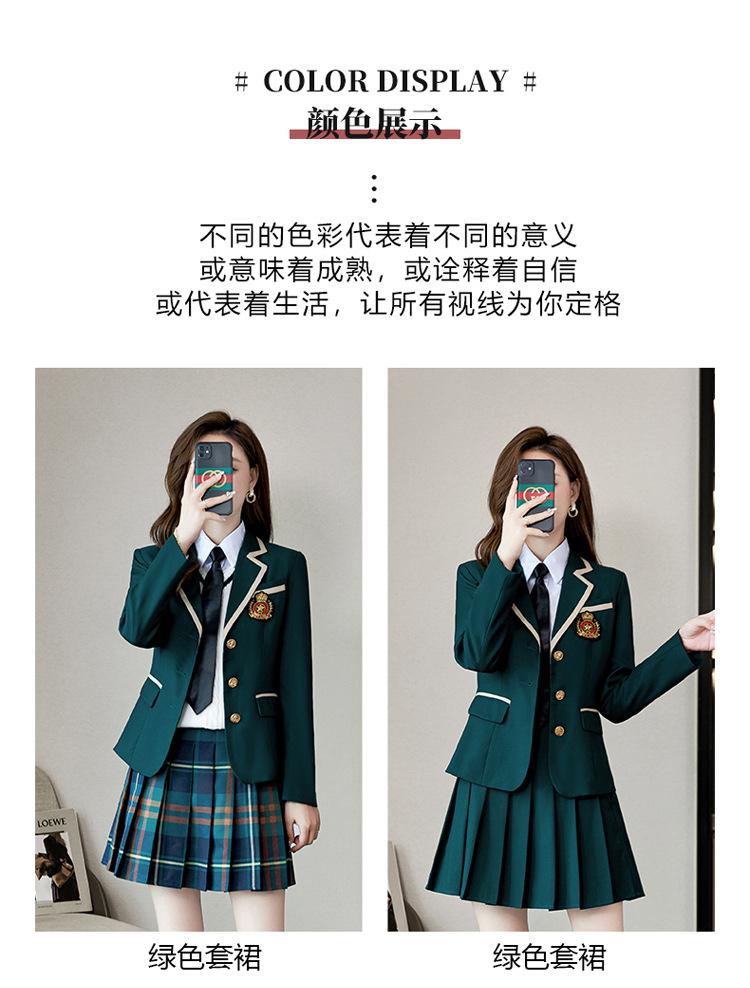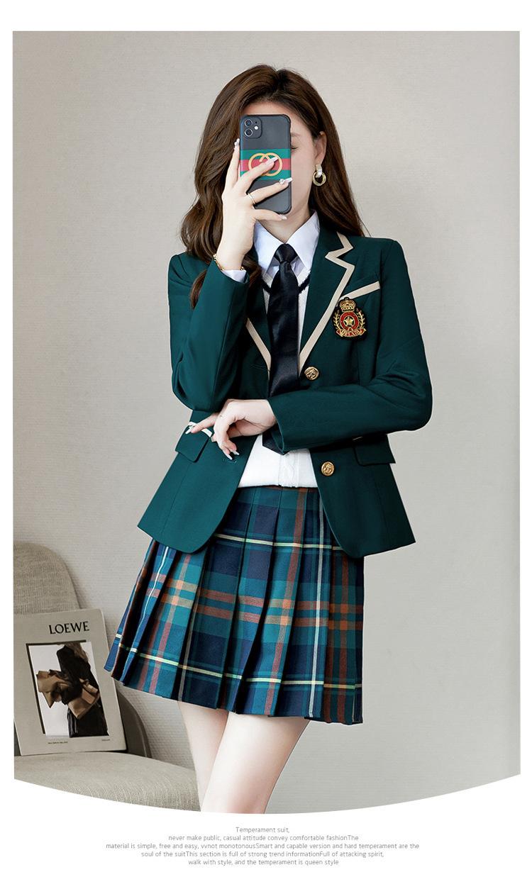Green suit + green pleated skirt, Blue suit + blue pleated skirt, Blue suit + black plaid pleated skirt, Brown...