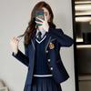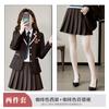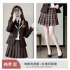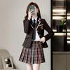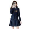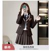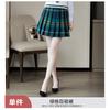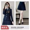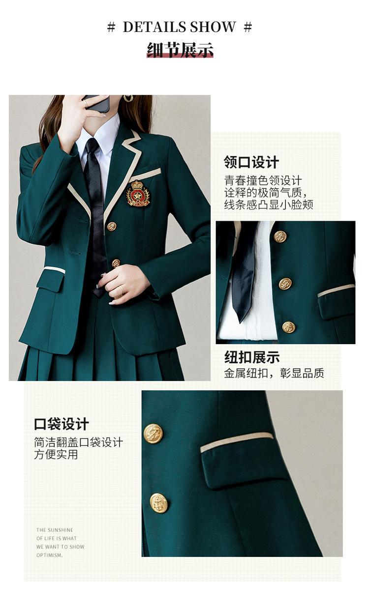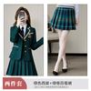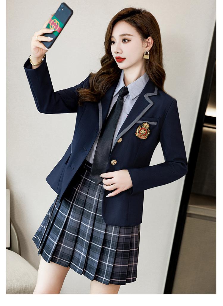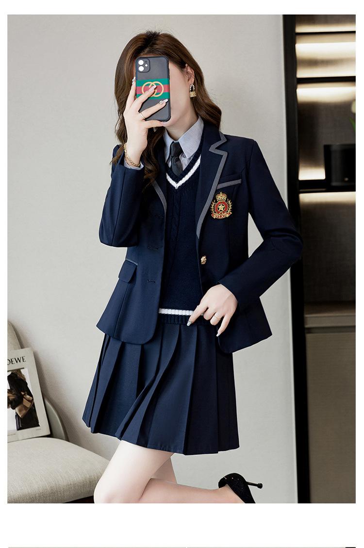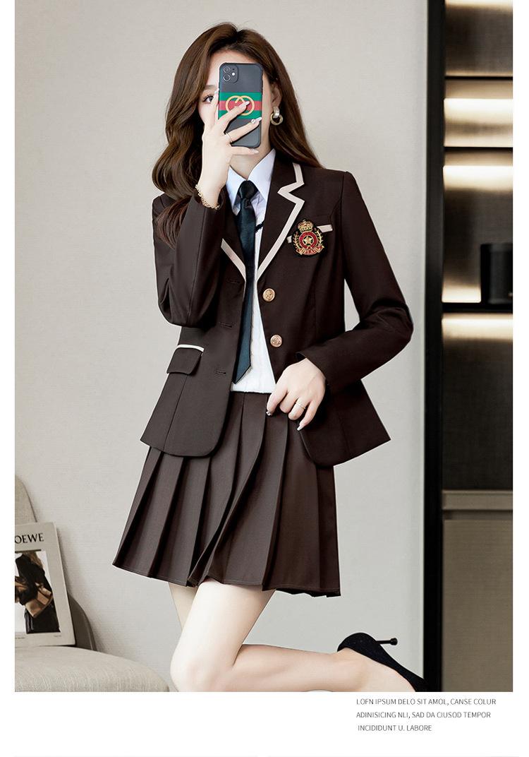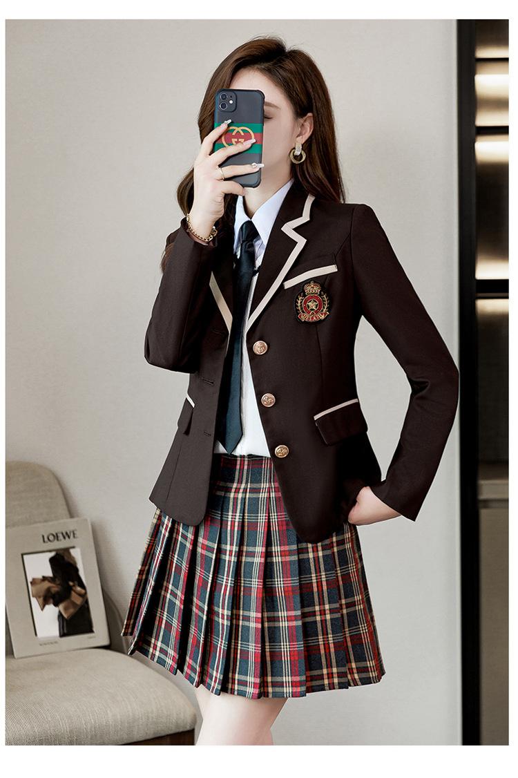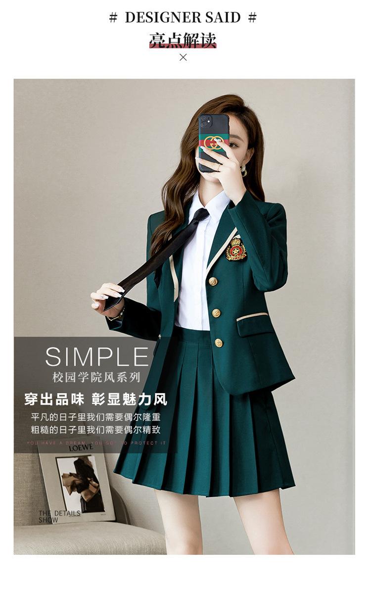 Green suit + green pleated skirt, Blue suit + blue pleated skirt, Blue suit + black plaid pleated skirt, Brown...