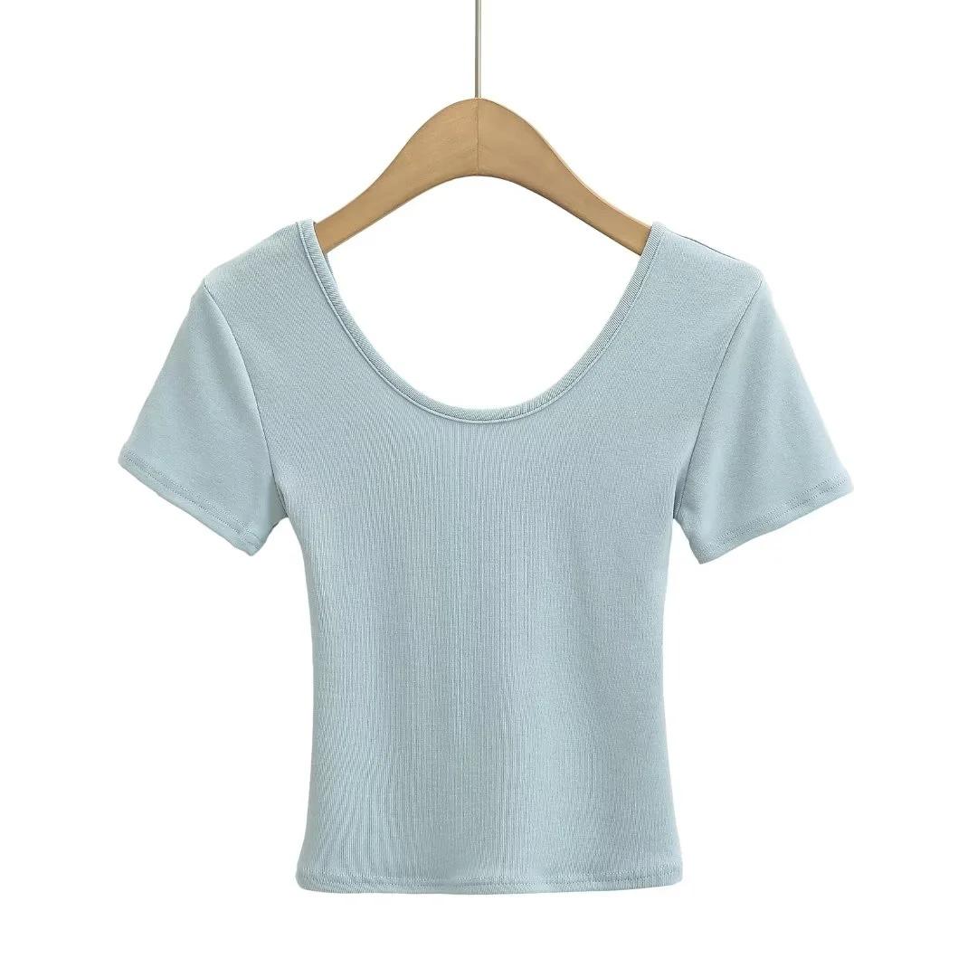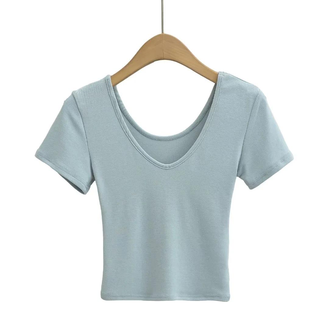 Camiseta básica de manga corta con escote en V delantero y trasero para mujer, estilo sexy de verano, ajustada, de cintura alta y hombros descubiertos, de color liso.
