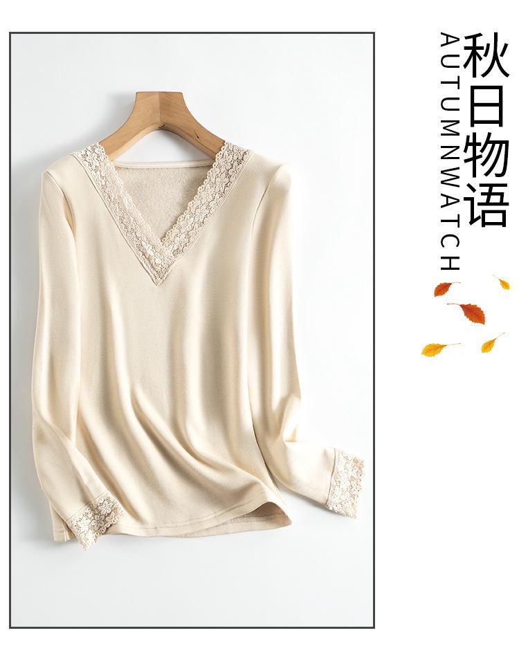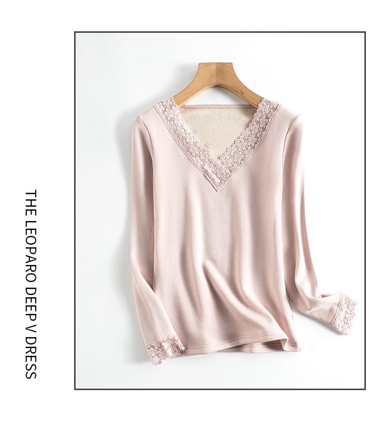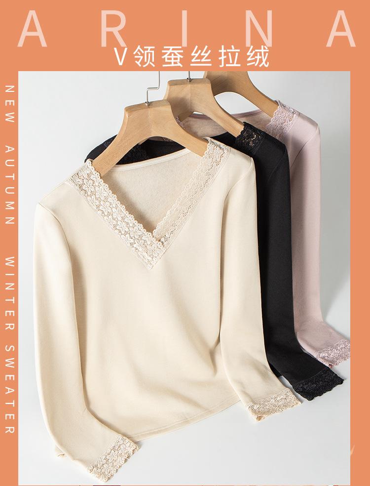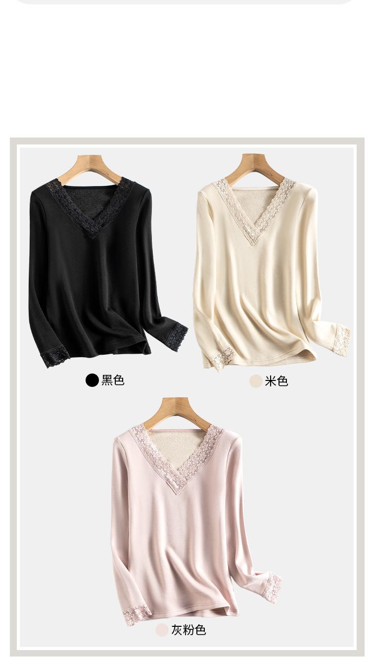 Ropa Interior Térmica de Seda para Mujer, Nueva Camiseta Base de Otoño e Invierno con Cuello en V y Forro Polar, Top Térmico Ajustado con Encaje y Forro Polar