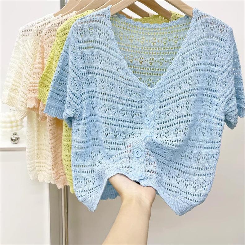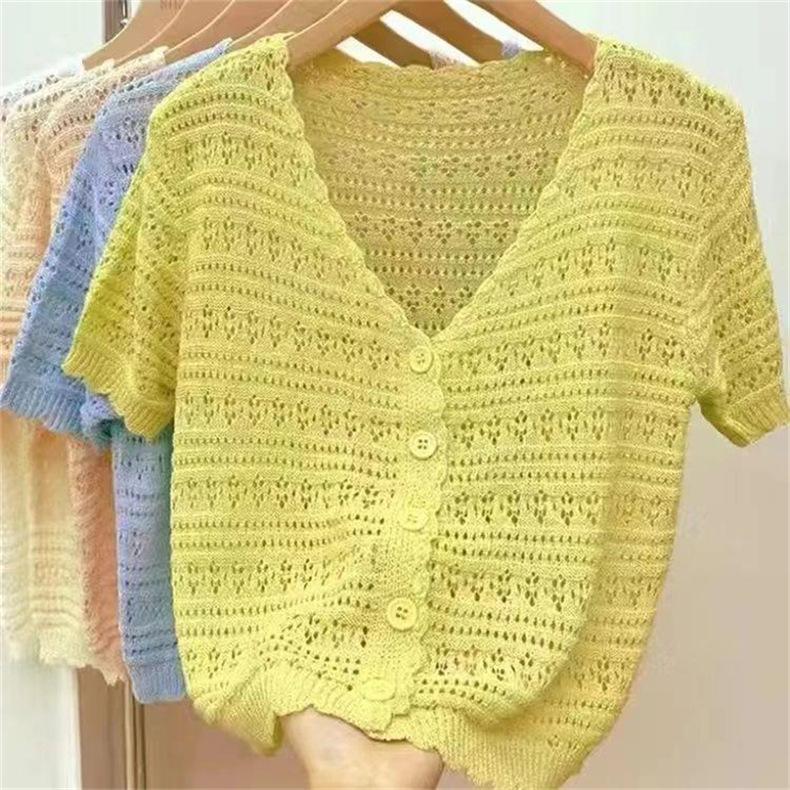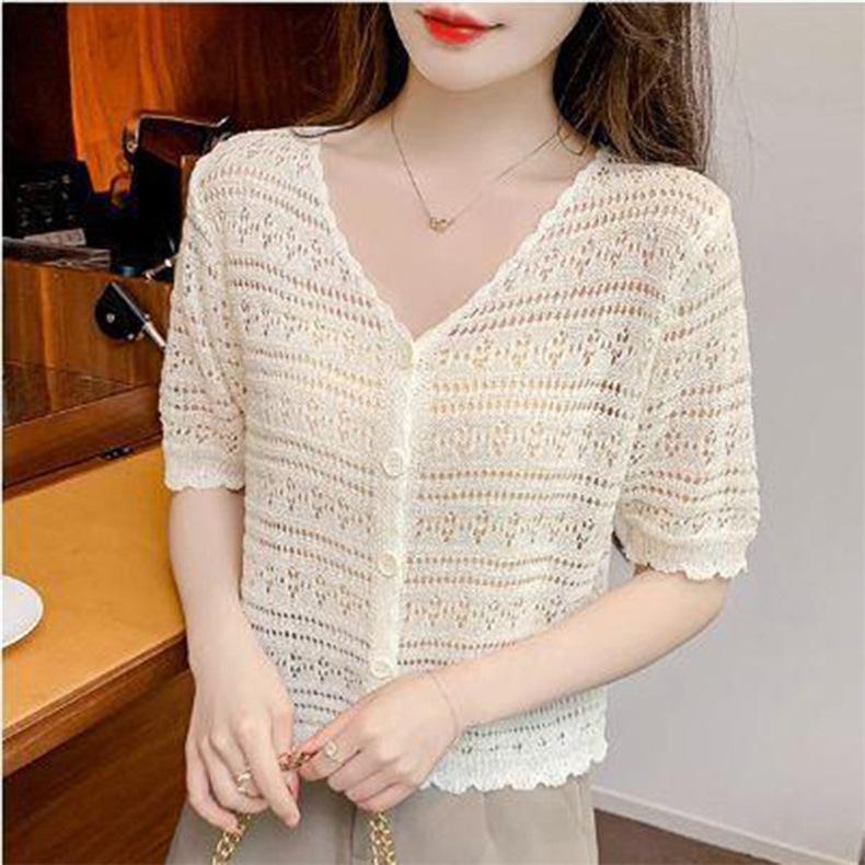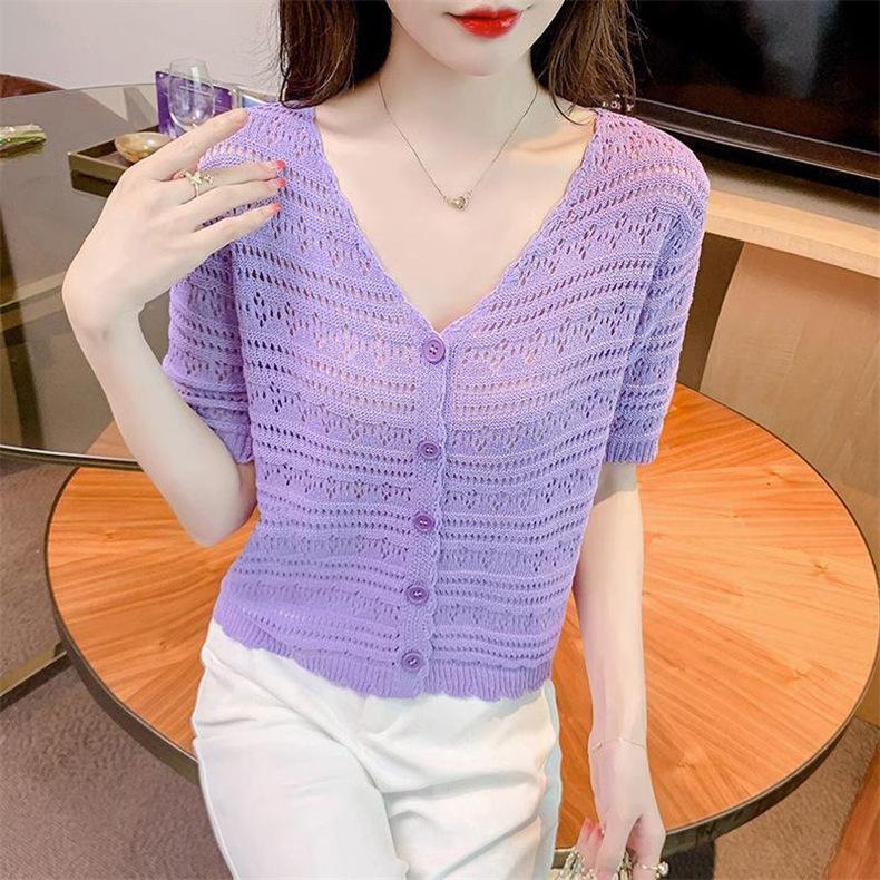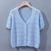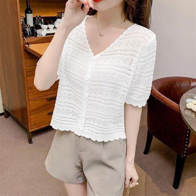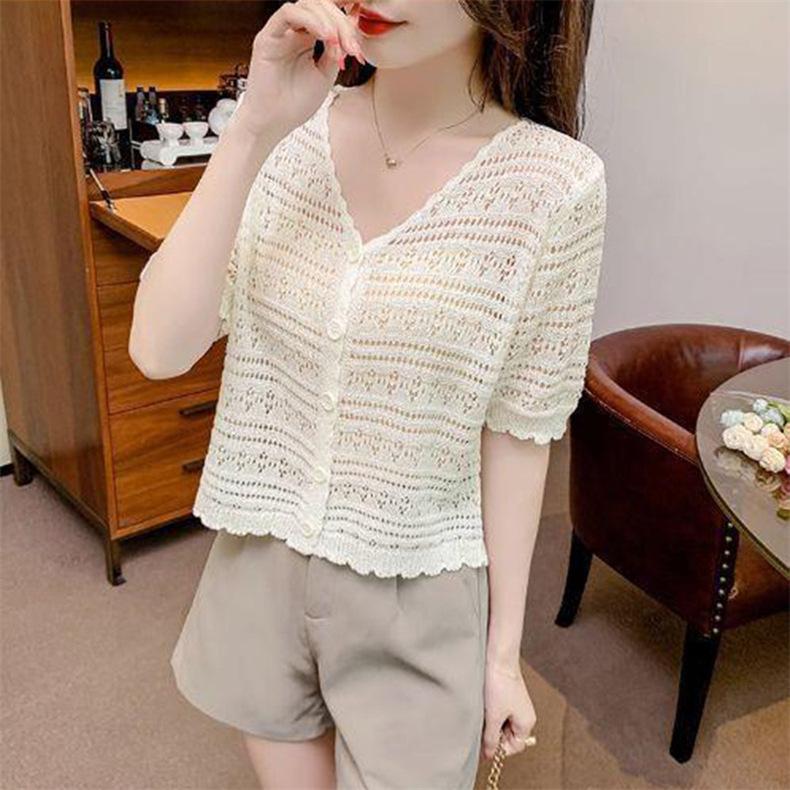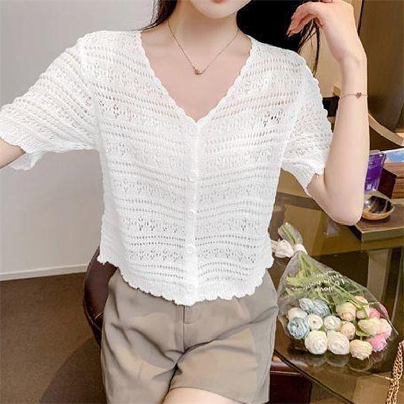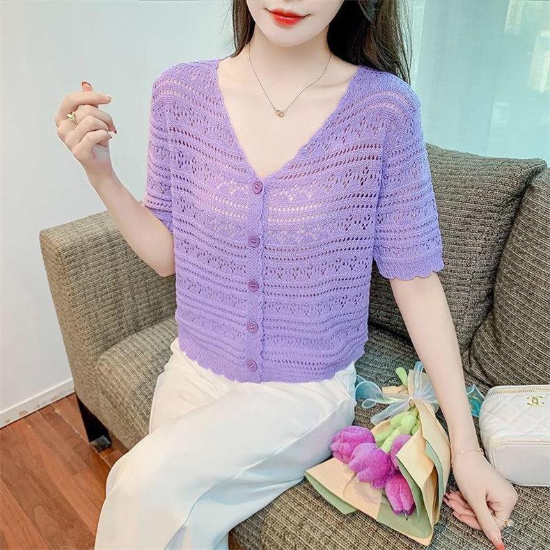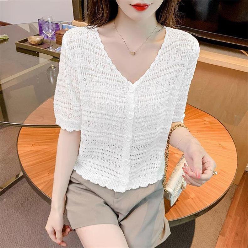 Blusa de Verano con Aberturas 2024 Camiseta de Manga Corta para Mujer Nuevo Cárdigan Tejido de Seda de Hielo Protección Solar Top Corto Versátil