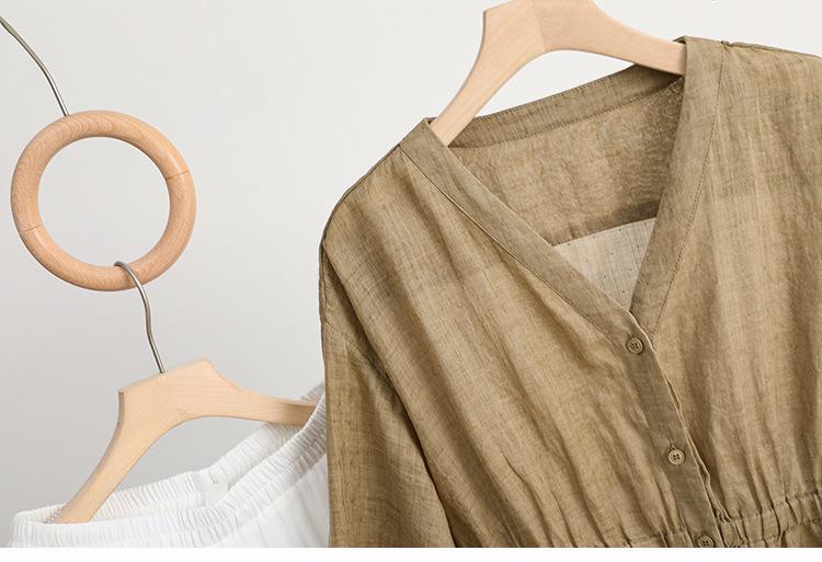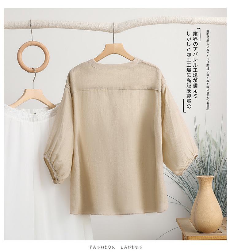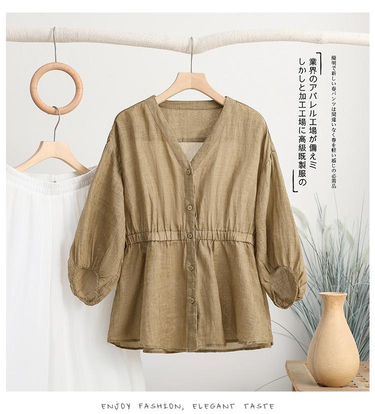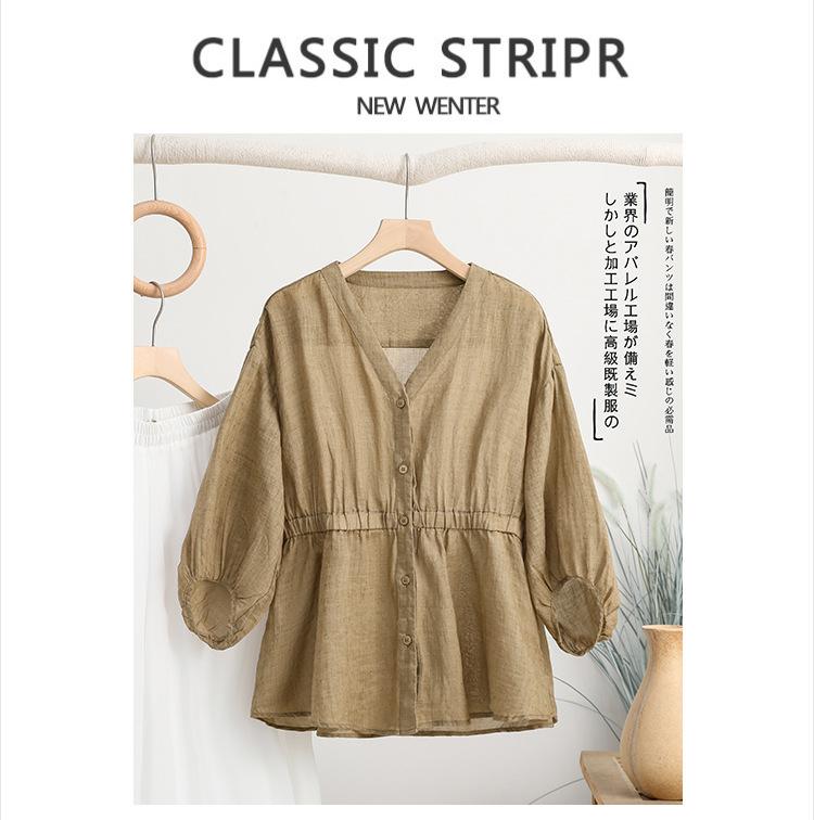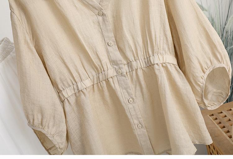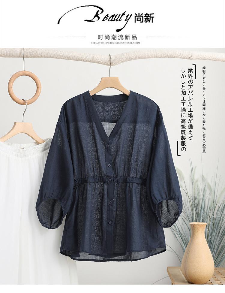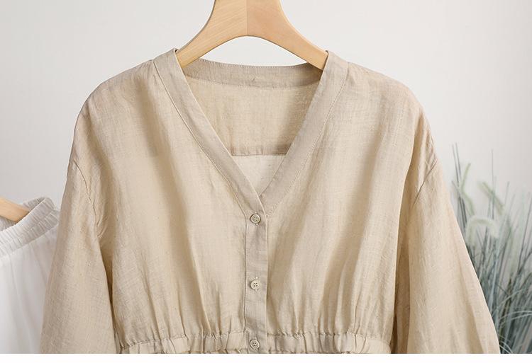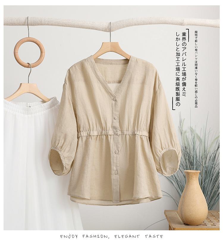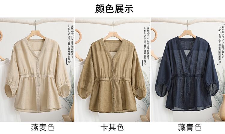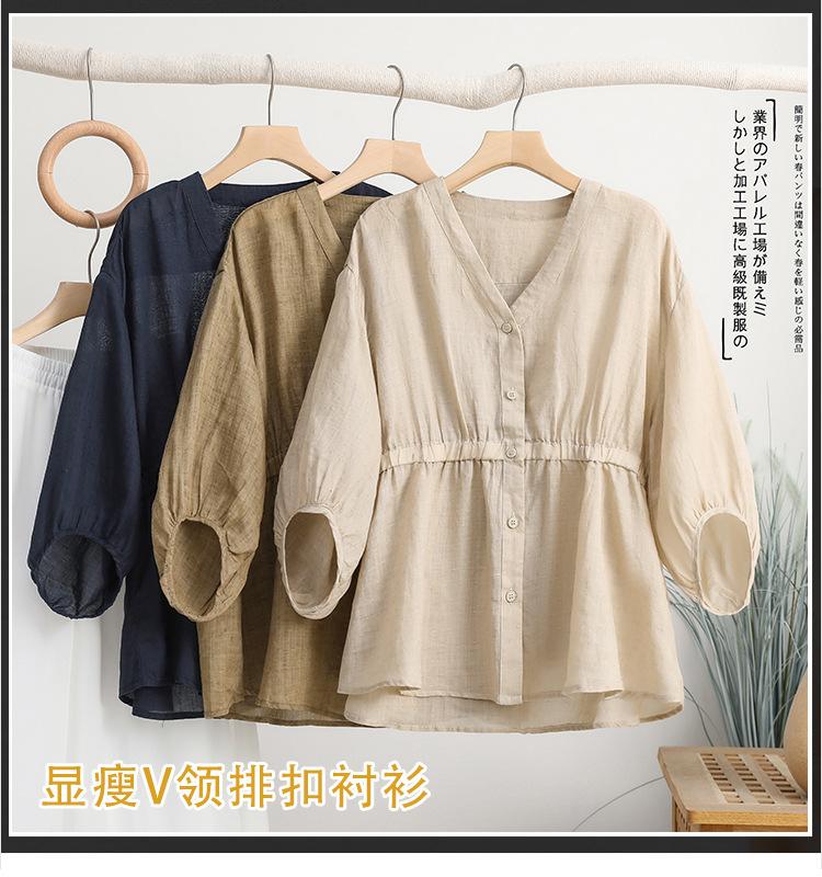 2024 Nuevo Estilo de Verano Algodón y Lino Cuello en V Cintura Camisa de Punto de Cinco Puntos para Mujer, Suelta, Ajustada y Versátil Top de Algodón y Lino