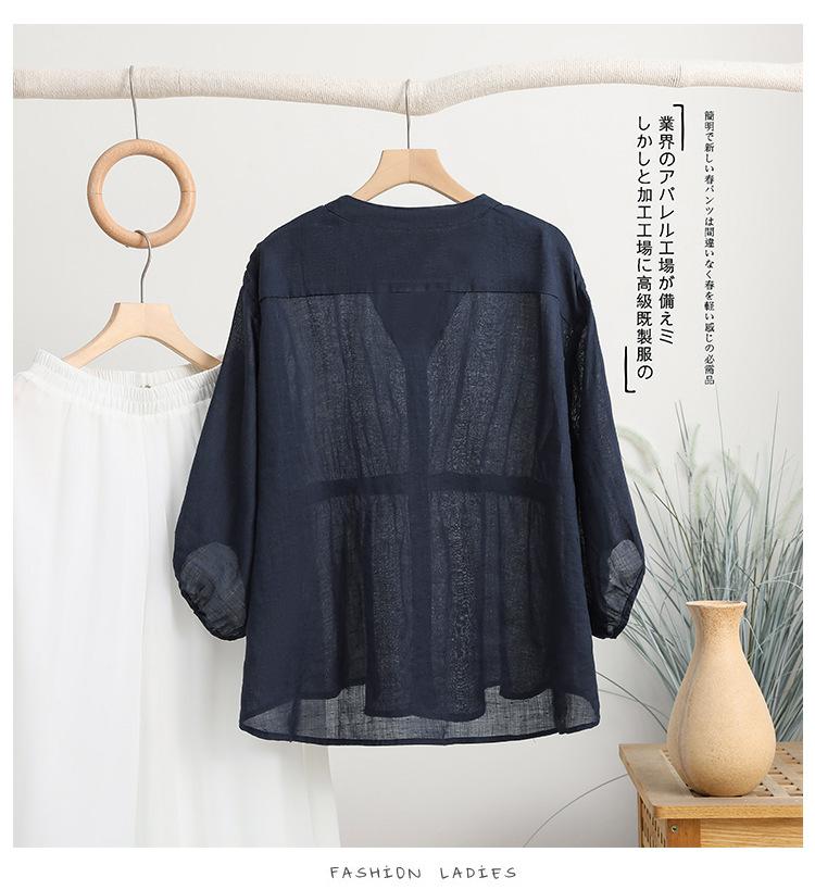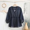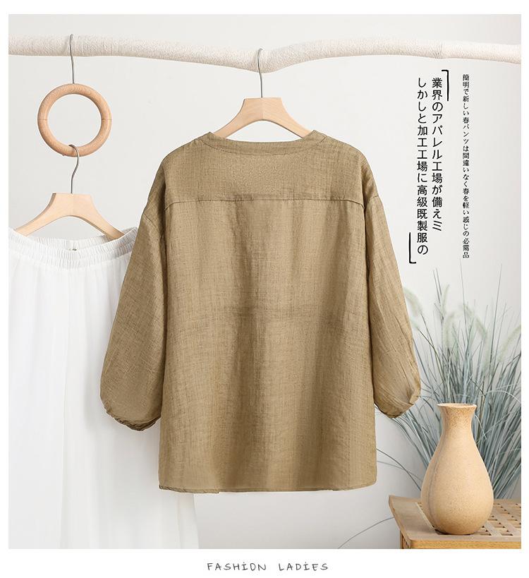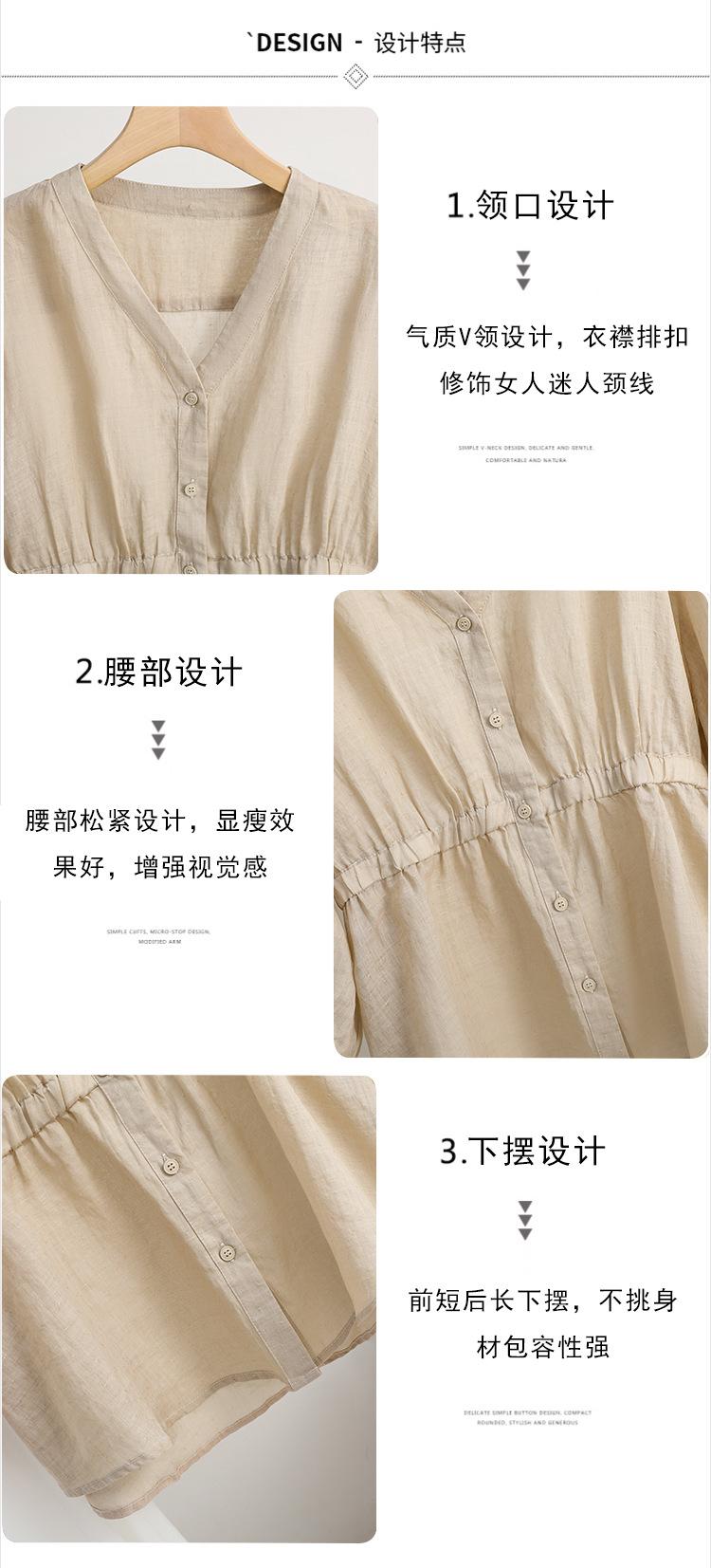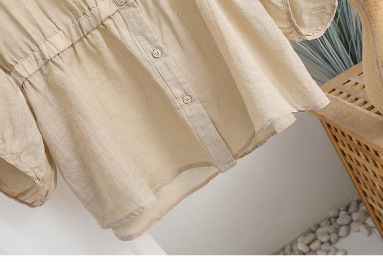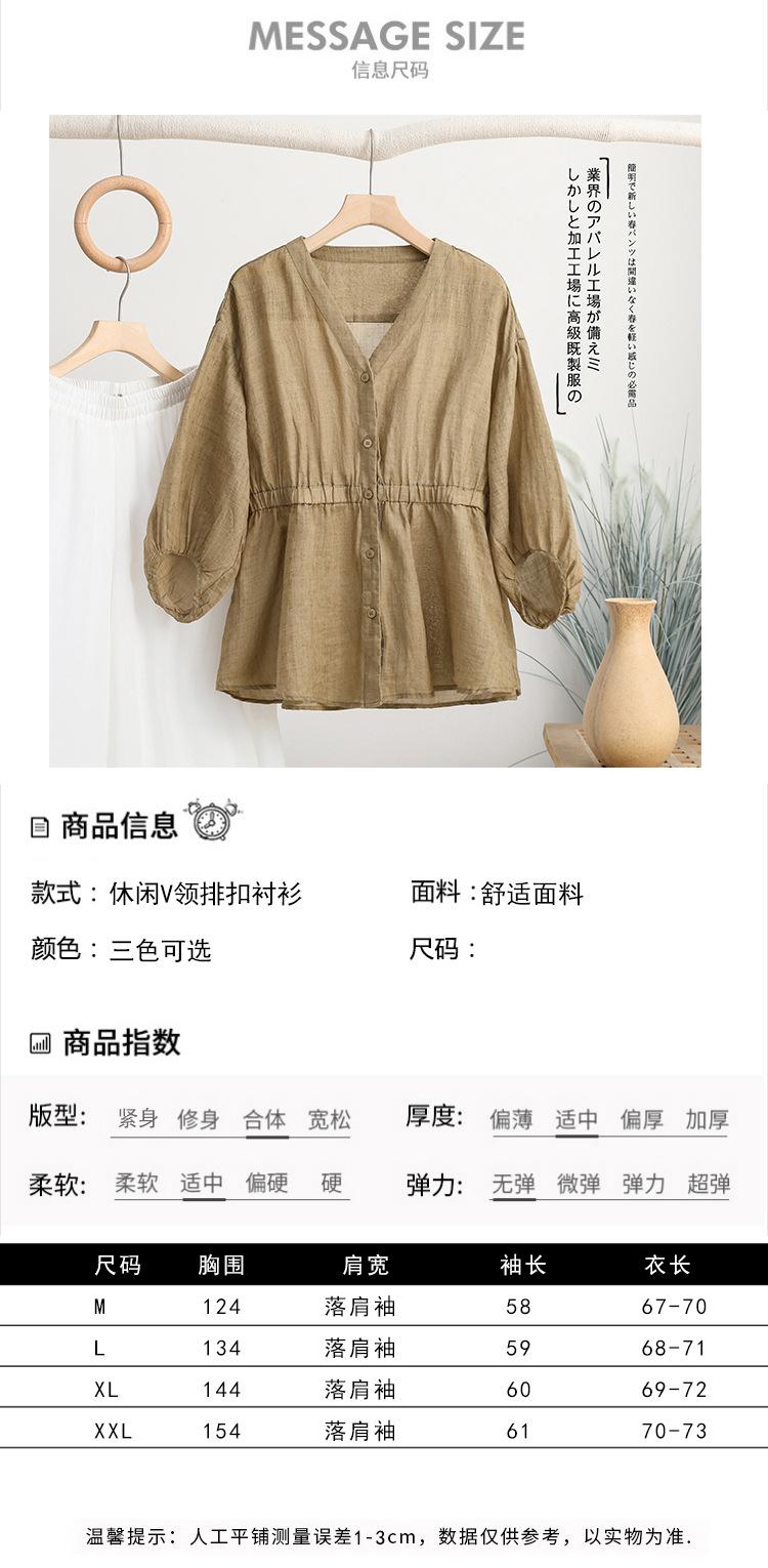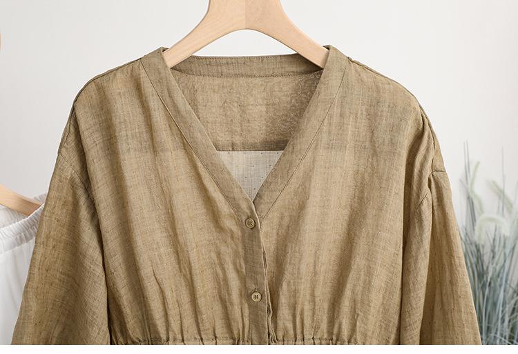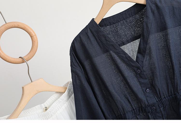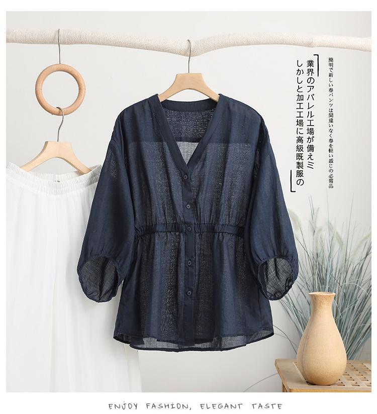 2024 Nuevo Estilo de Verano Algodón y Lino Cuello en V Cintura Camisa de Punto de Cinco Puntos para Mujer, Suelta, Ajustada y Versátil Top de Algodón y Lino