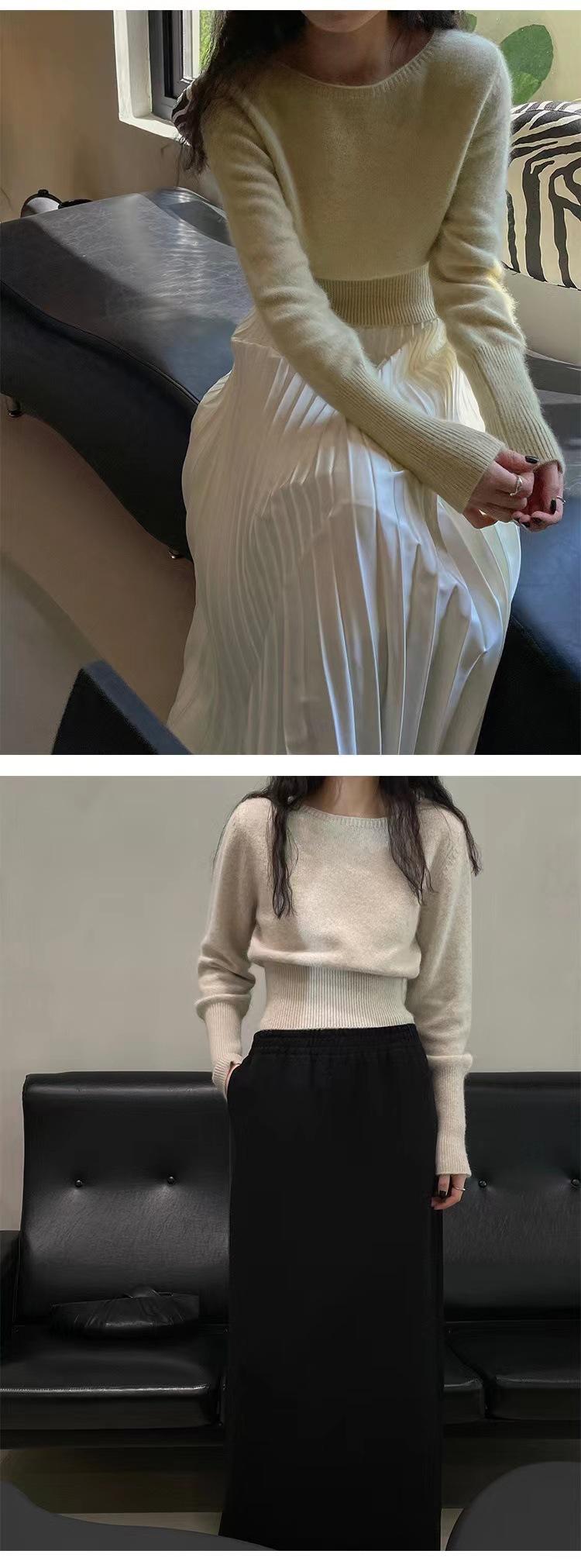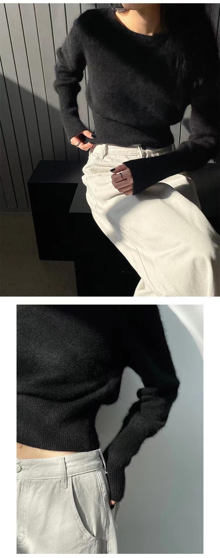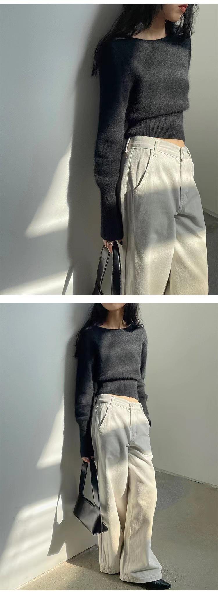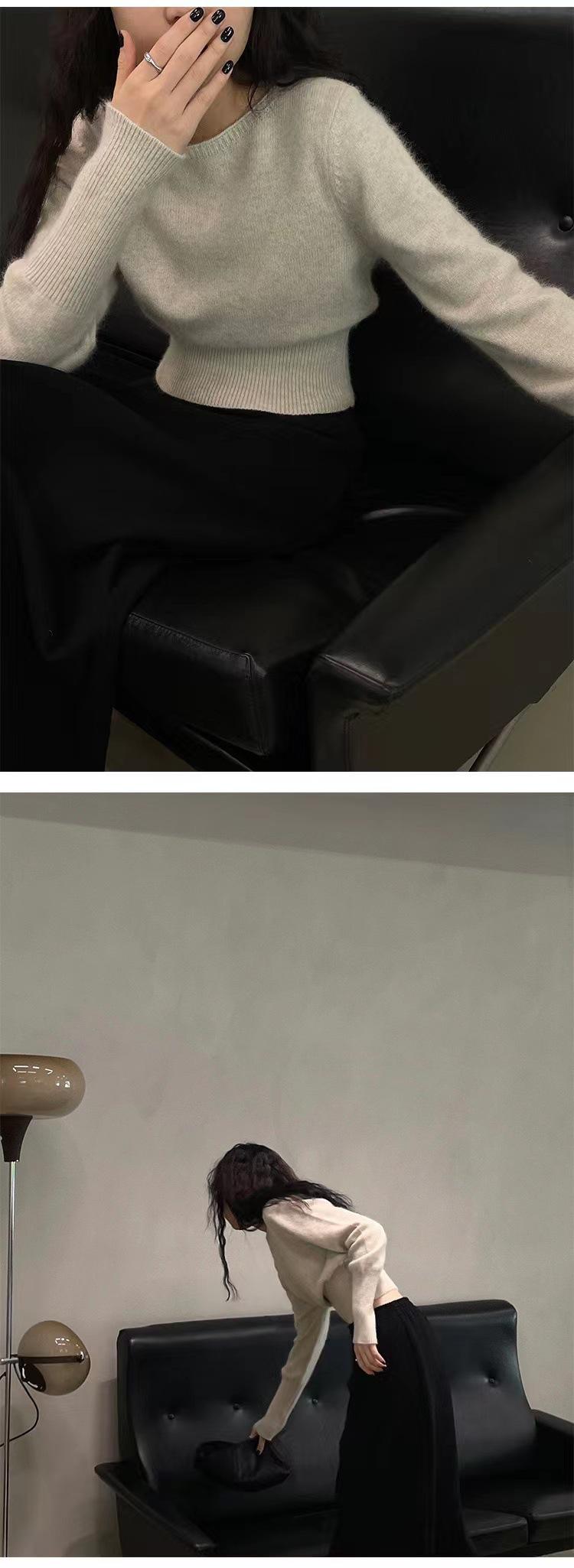 Elegante Suéter Corto de Lana 100% de Punto para Mujer Otoño e Invierno Holgado Adelgazante Cuello Redondo Camiseta Base de Lana