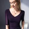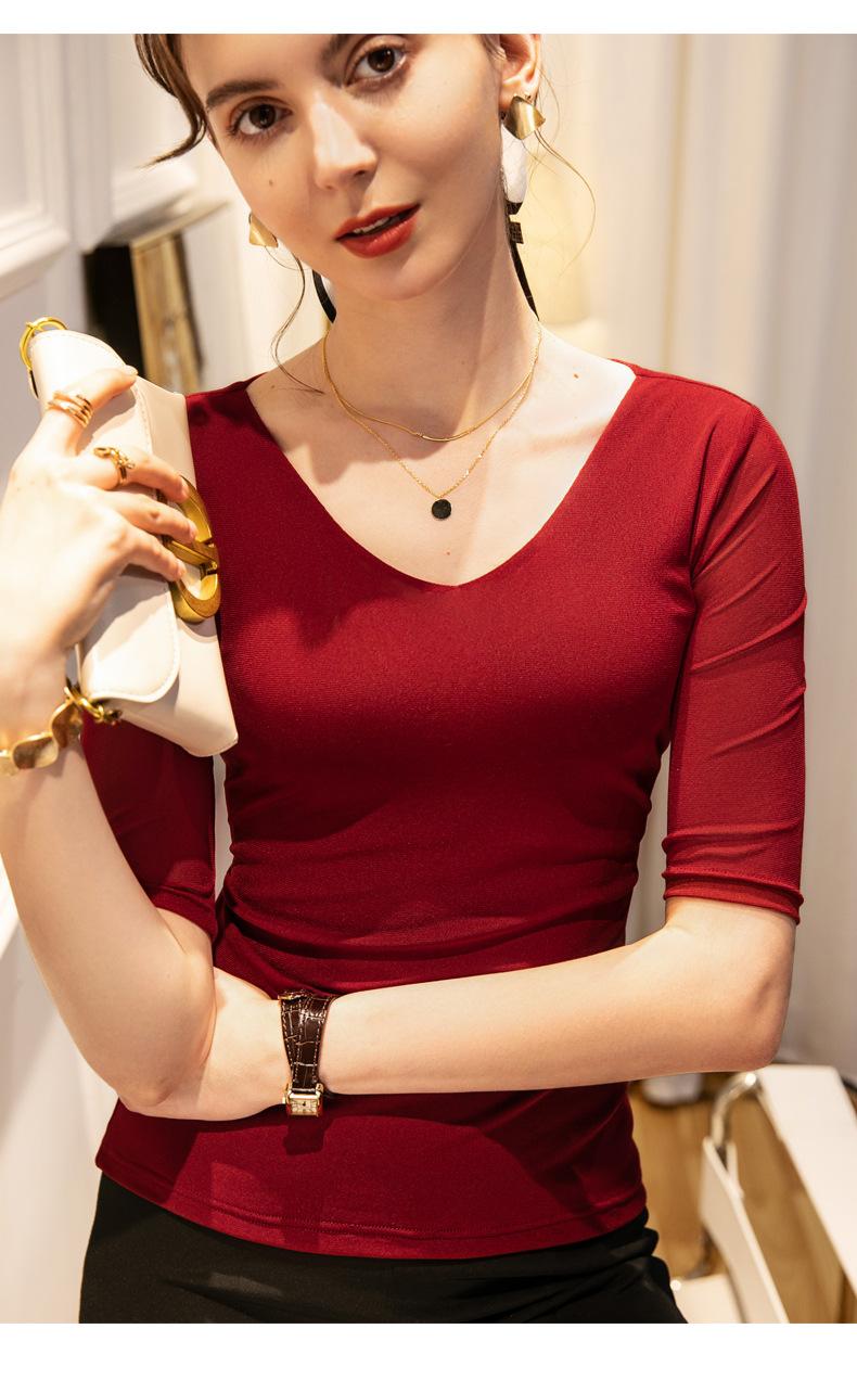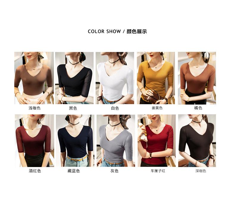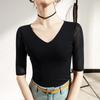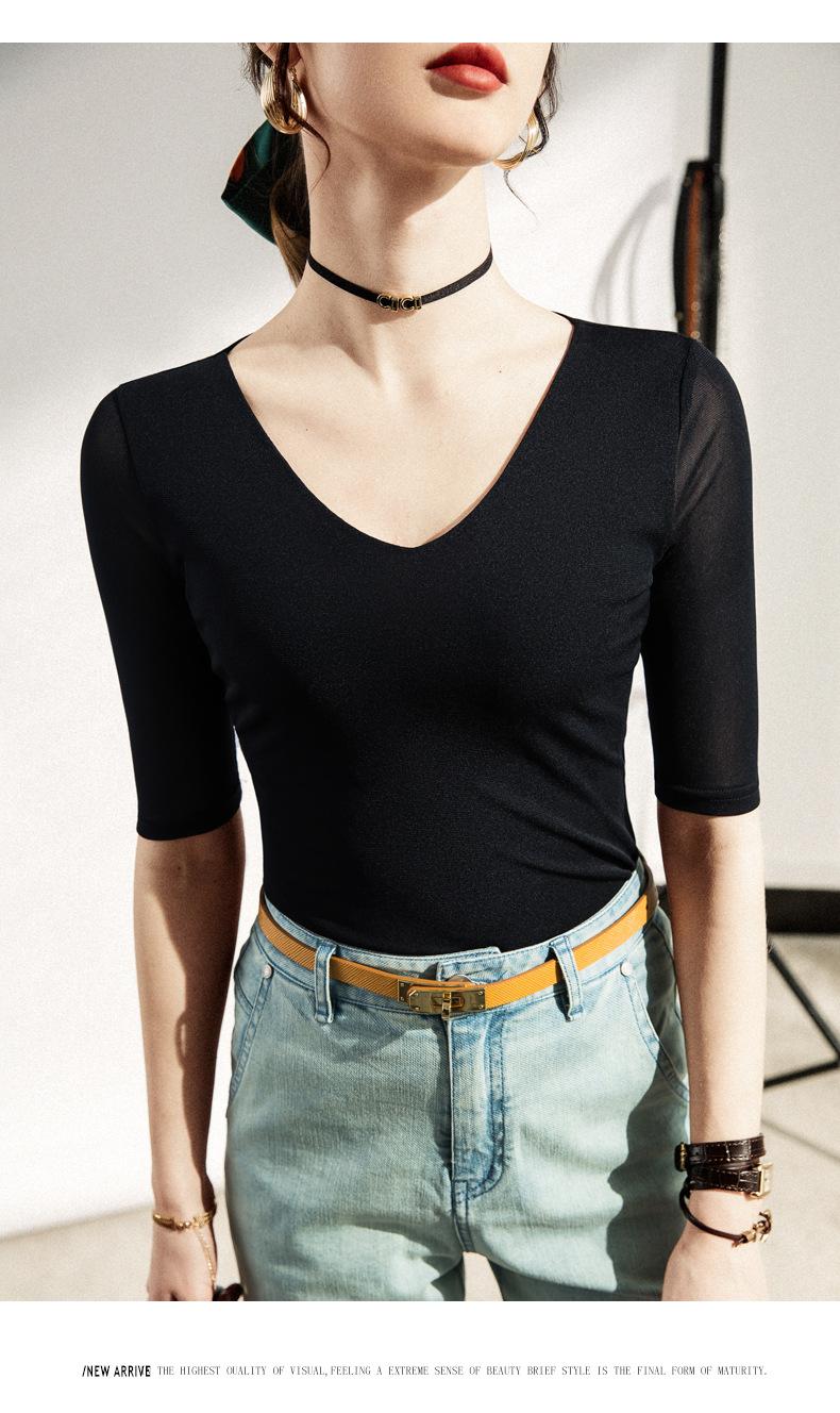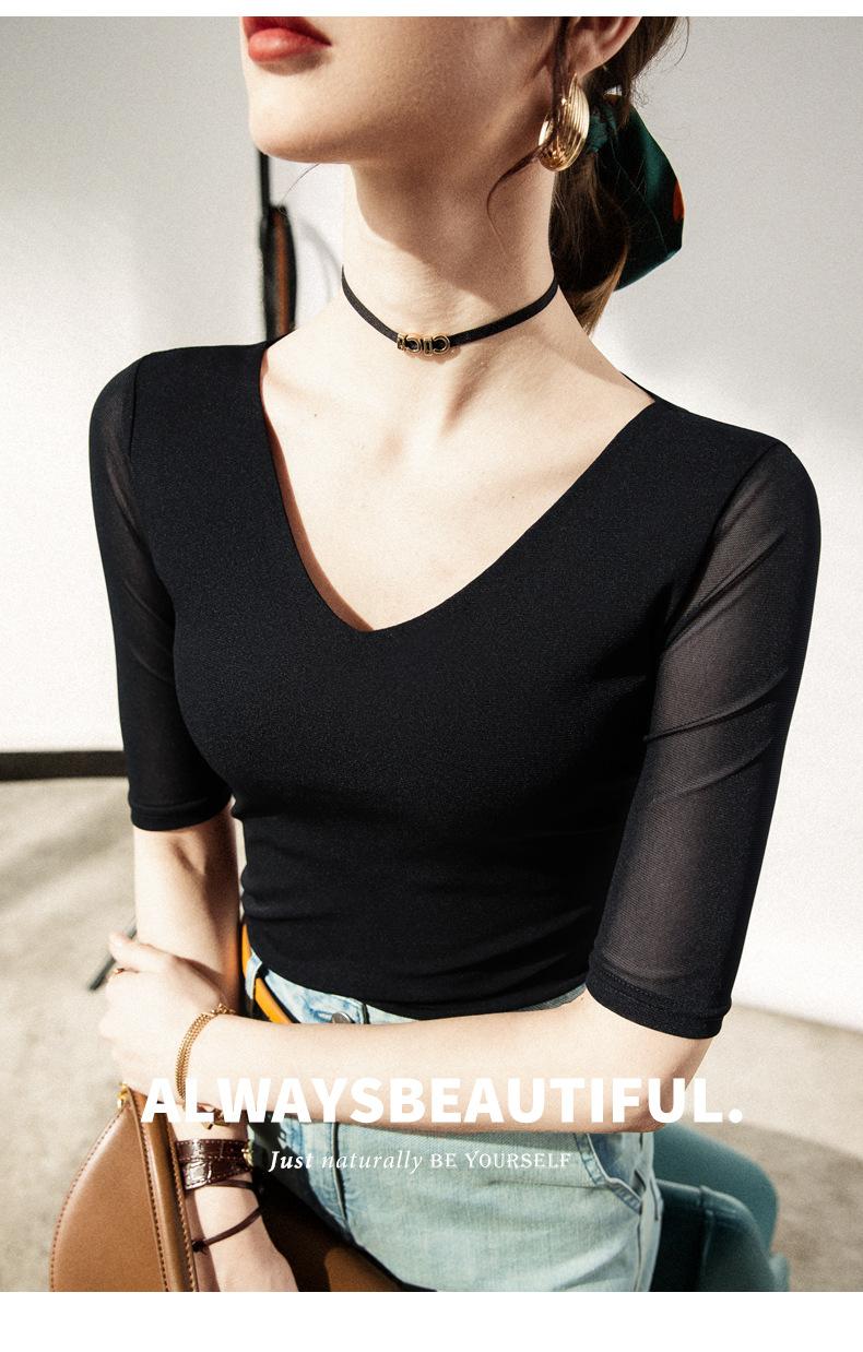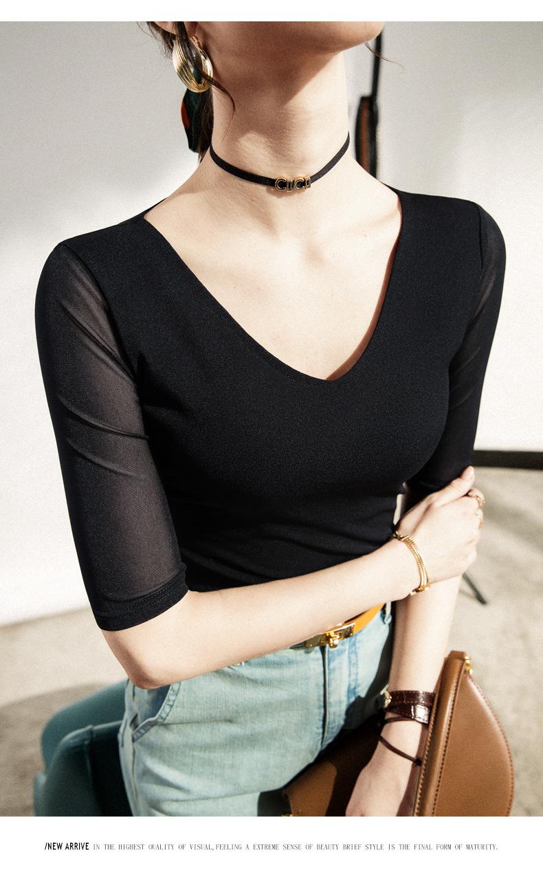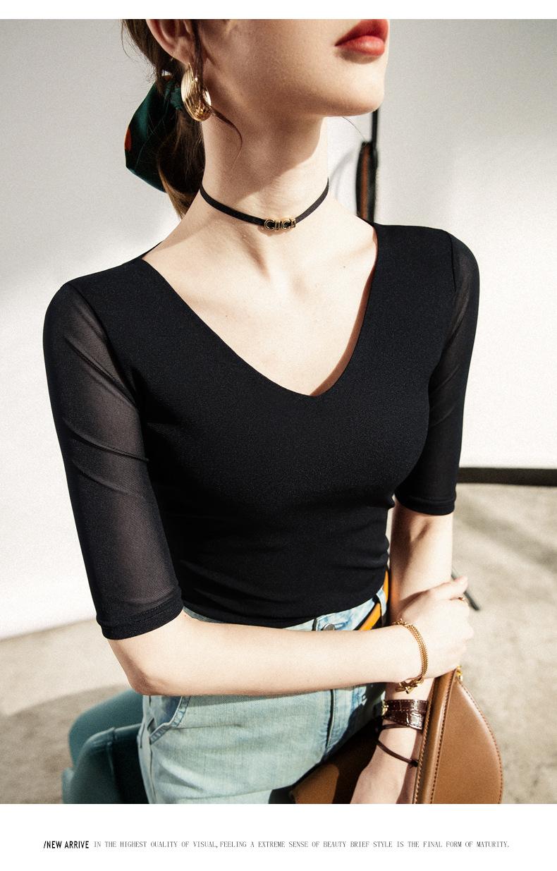 Primavera y Verano Nueva Camiseta Cuello en V Manga Media Camiseta Base con Top de Malla Estilo Extranjero Camiseta Pequeña Hecha en Europa