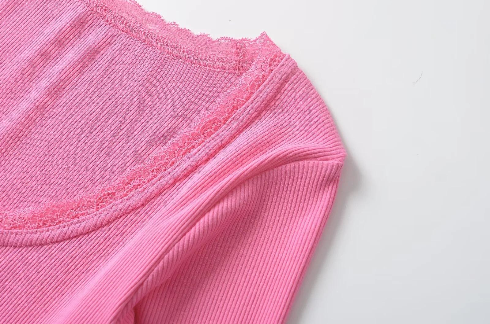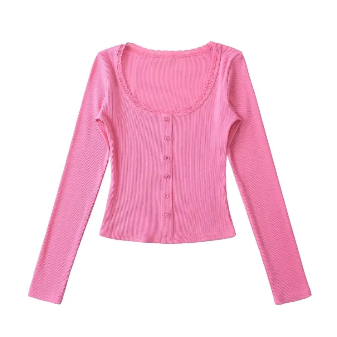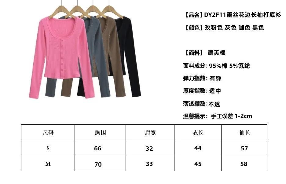 DY2F11-24 Primavera Nueva Camiseta de Manga Larga con Encaje y Cuello Redondo Sexy para Chicas Calientes de Estilo Europeo y Americano