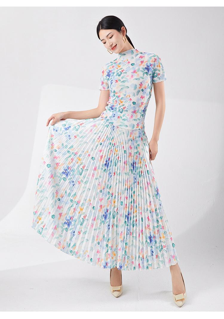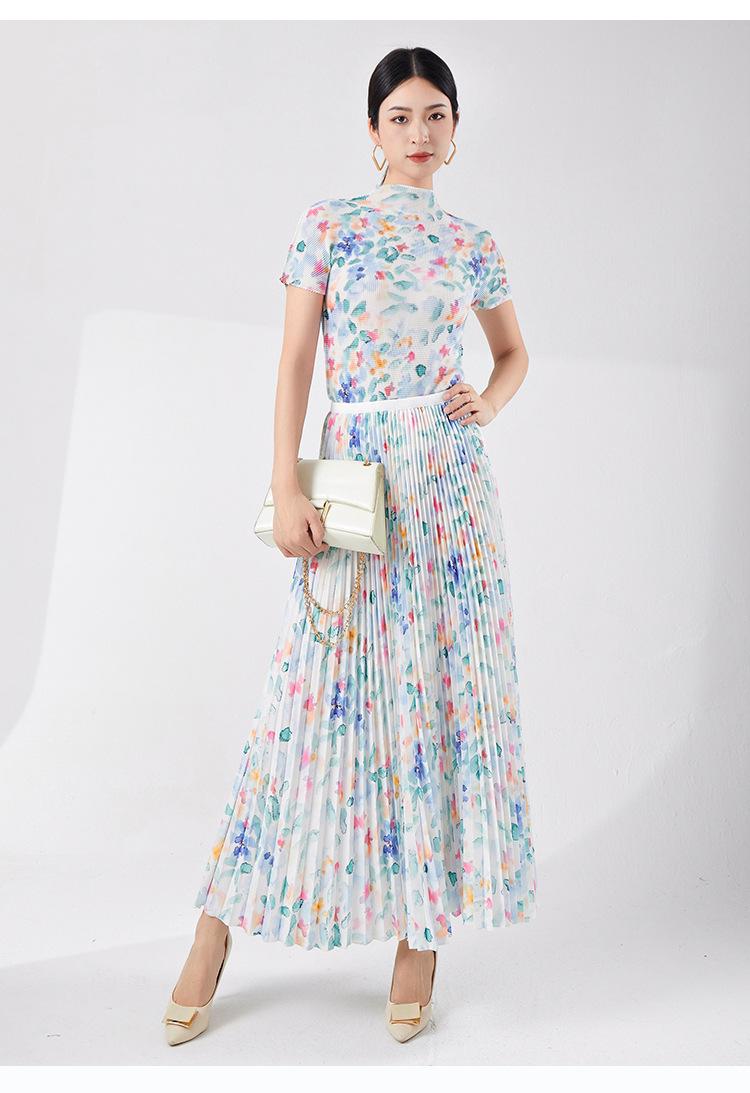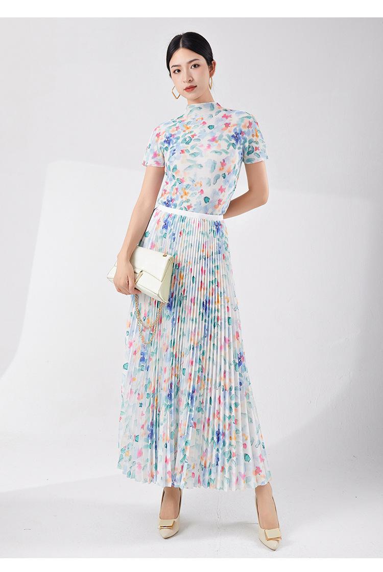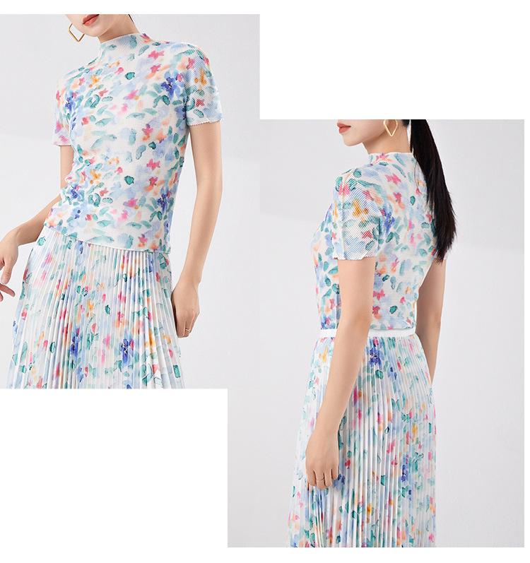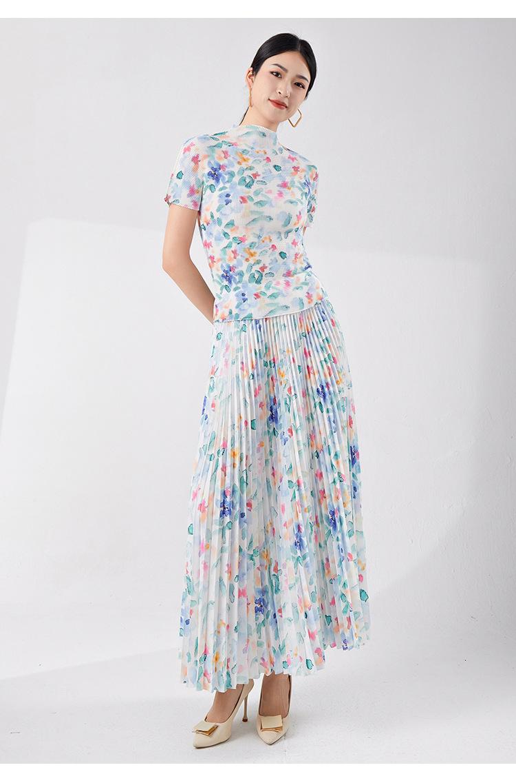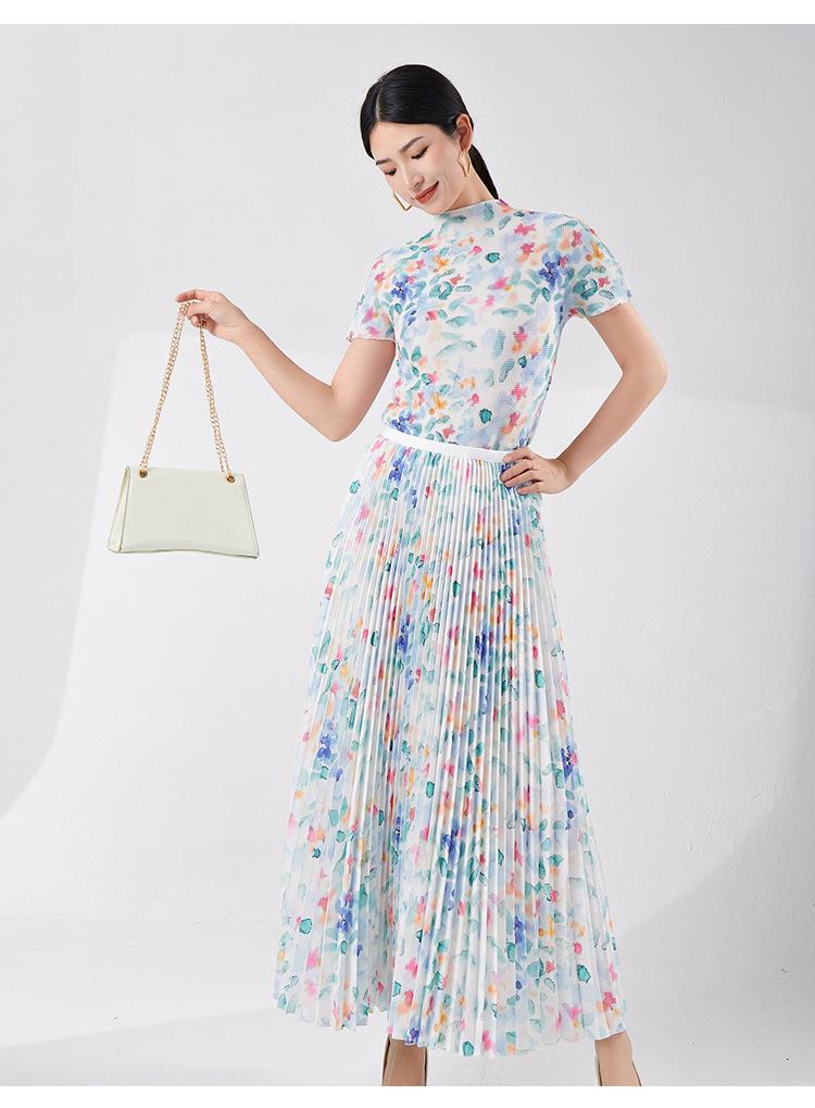Traje Miyake Transfronterizo para Mujer Verano Dos Piezas Elegante Nuevo Floral Camiseta de Manga Corta Look Adelgazante Cintura Elástica Falda de Bajo Ancho