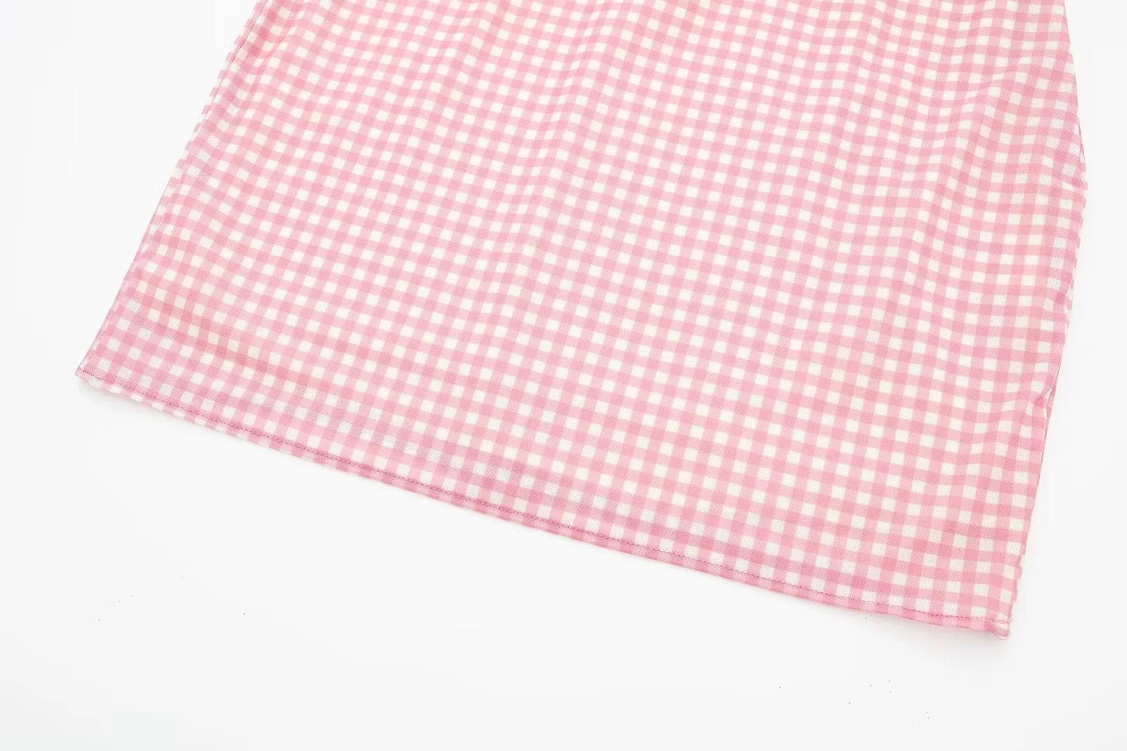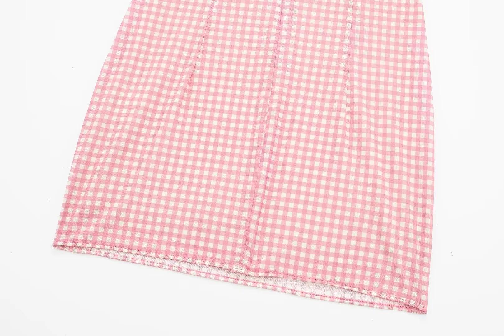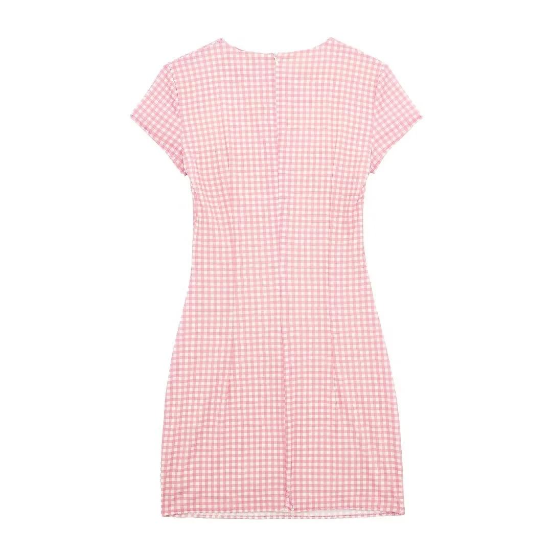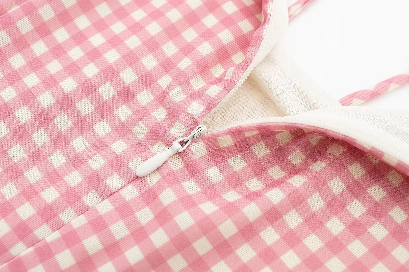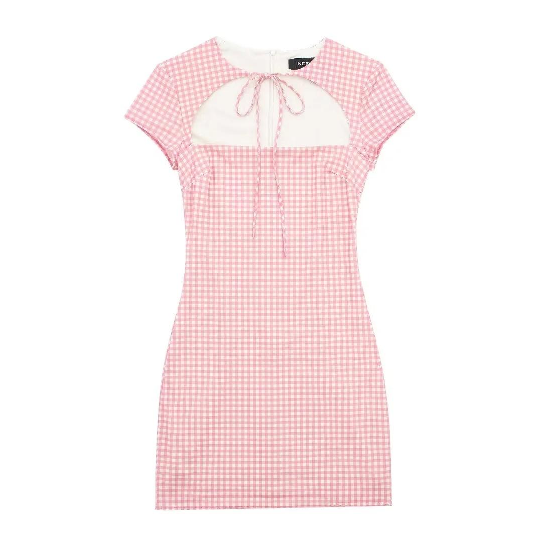 Ropa de Mujer Estilo Europeo y Americano Exportación Verano Nuevo Rosa Dulce Diseño Cut Out Vestido Decorado con Lazo de Cuadros Pequeños