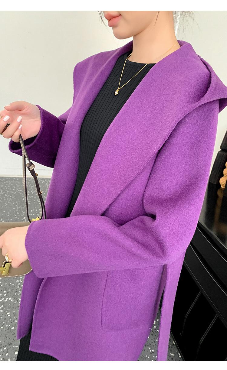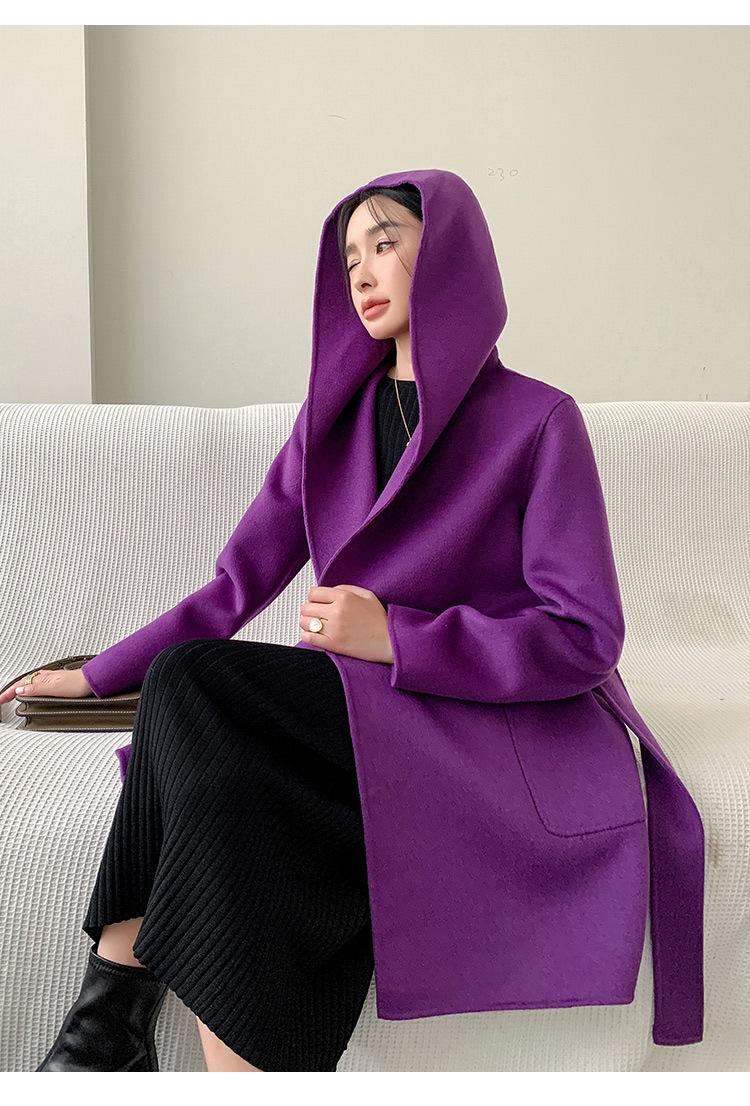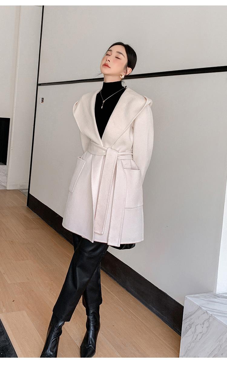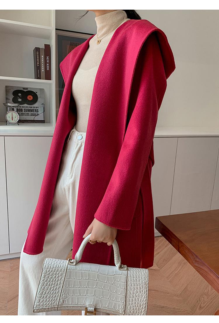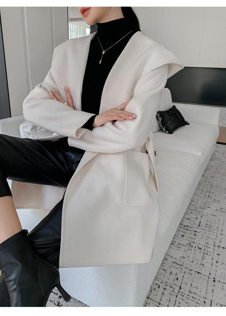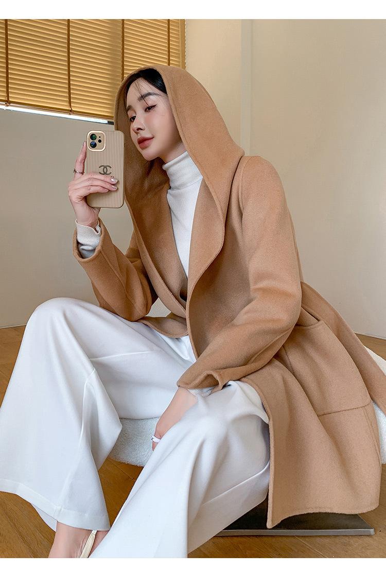 Abrigo de Lana Hecho a Mano de Largo Medio con Cordones, Exterior de Lana de Doble Cara, Fresco y Moderno Estilo Coreano para Mujer, Abrigo con Capucha de Color Puro
