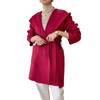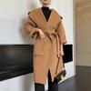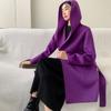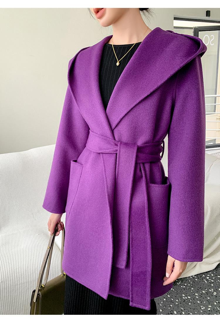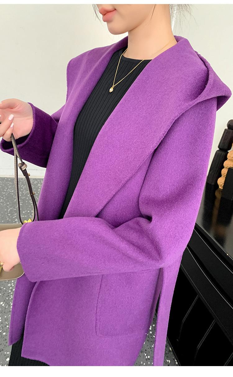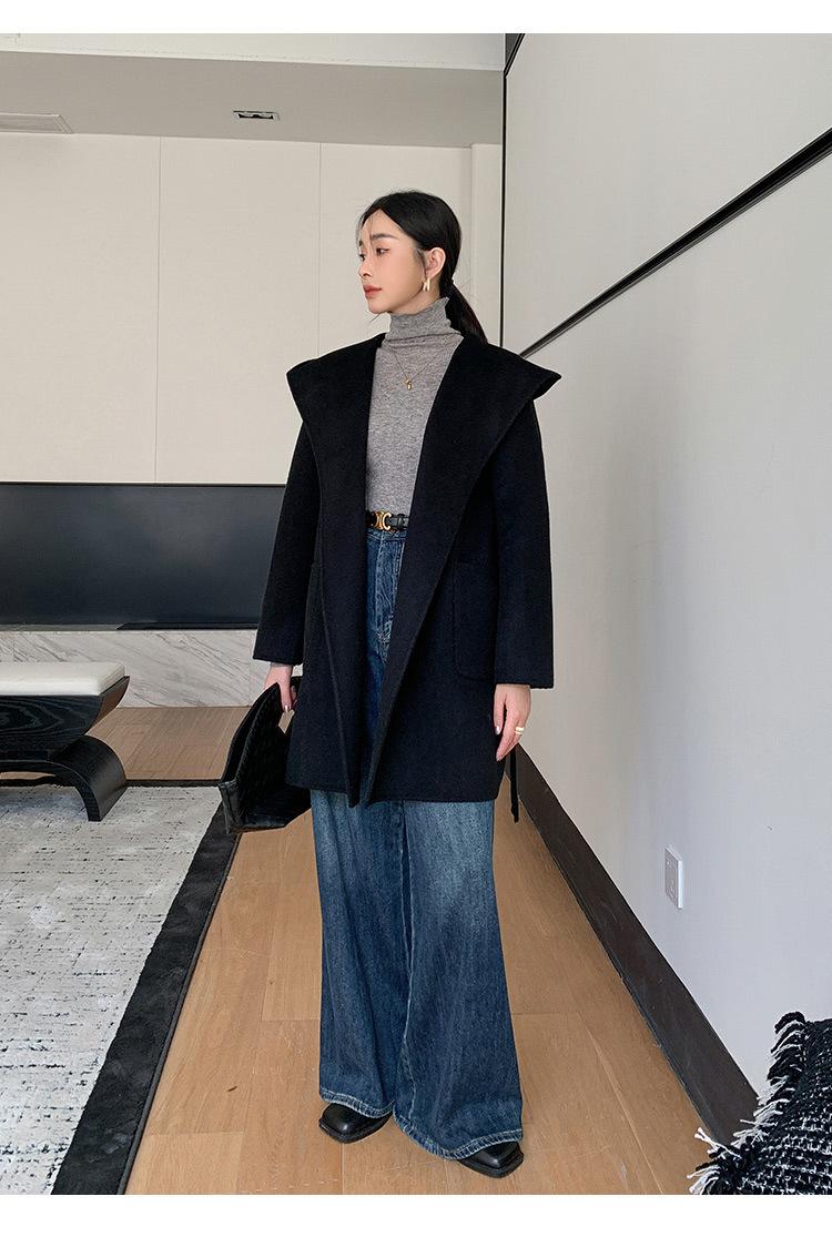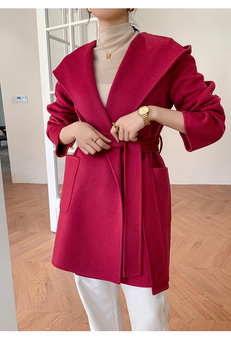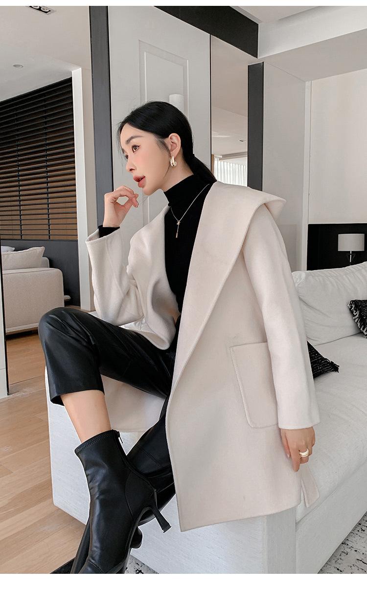 Abrigo de Lana Hecho a Mano de Largo Medio con Cordones, Exterior de Lana de Doble Cara, Fresco y Moderno Estilo Coreano para Mujer, Abrigo con Capucha de Color Puro
