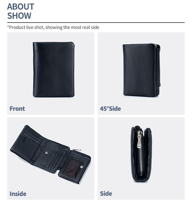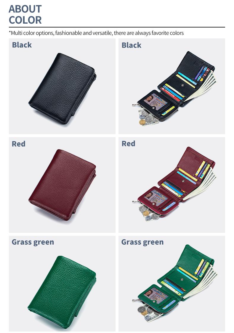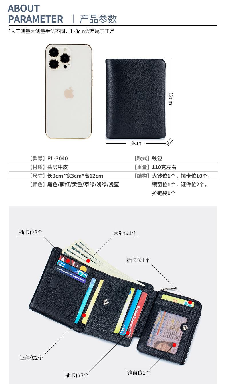 Estructura: 1 ranura para billetes, 10 ranuras para tarjetas, 1 ranura para espejo, 2 ranuras para identificación, 1 bolsillo con cremallera