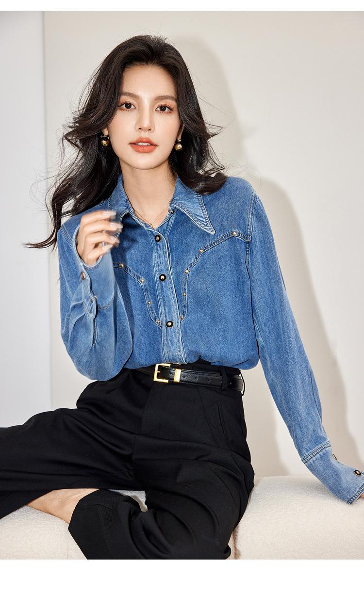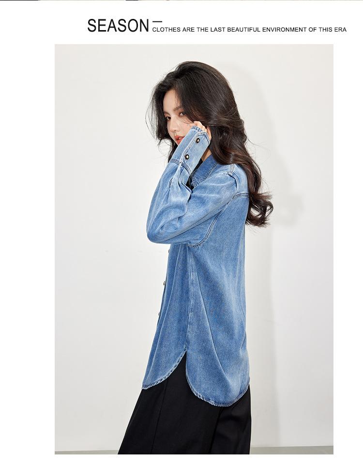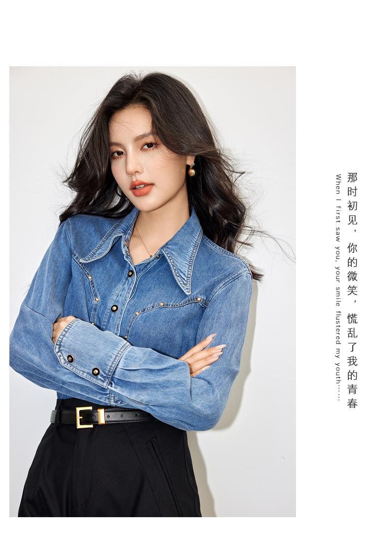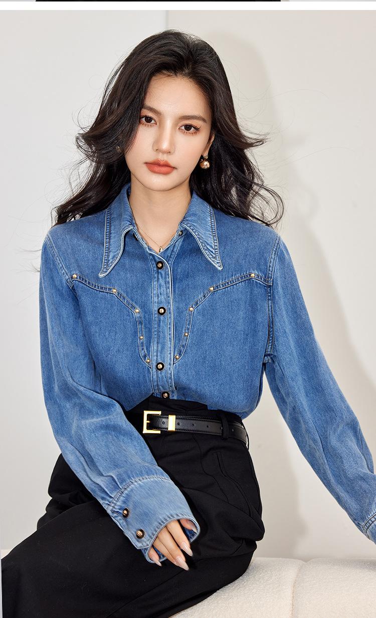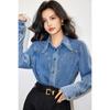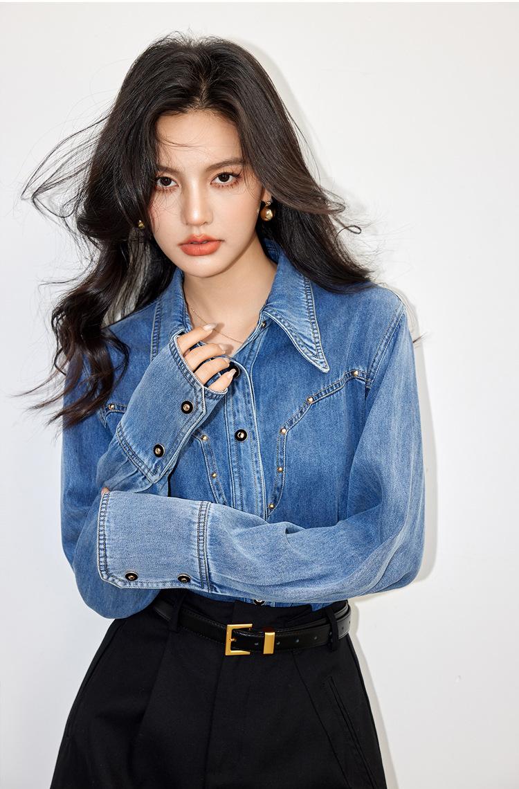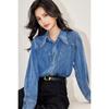 Foto Real de Camisa Petite en Capas Estilo Retro Hong Kong de Mezclilla Versátil Holgada de Manga Larga para Mujer