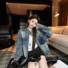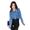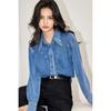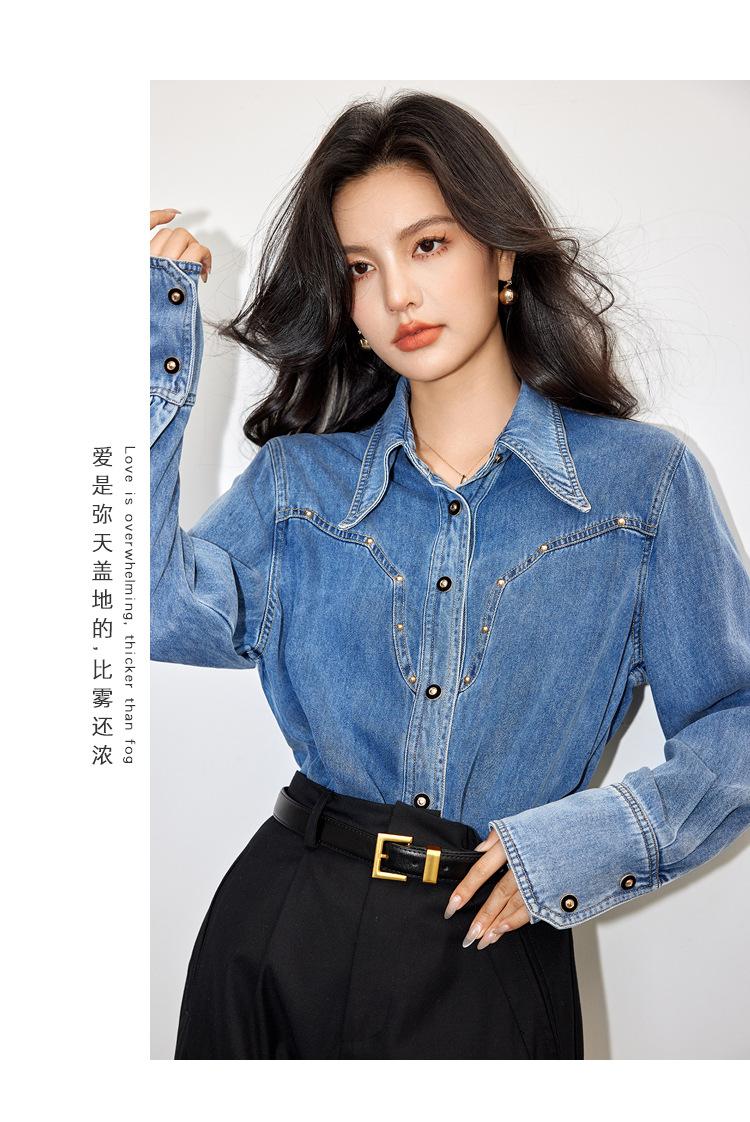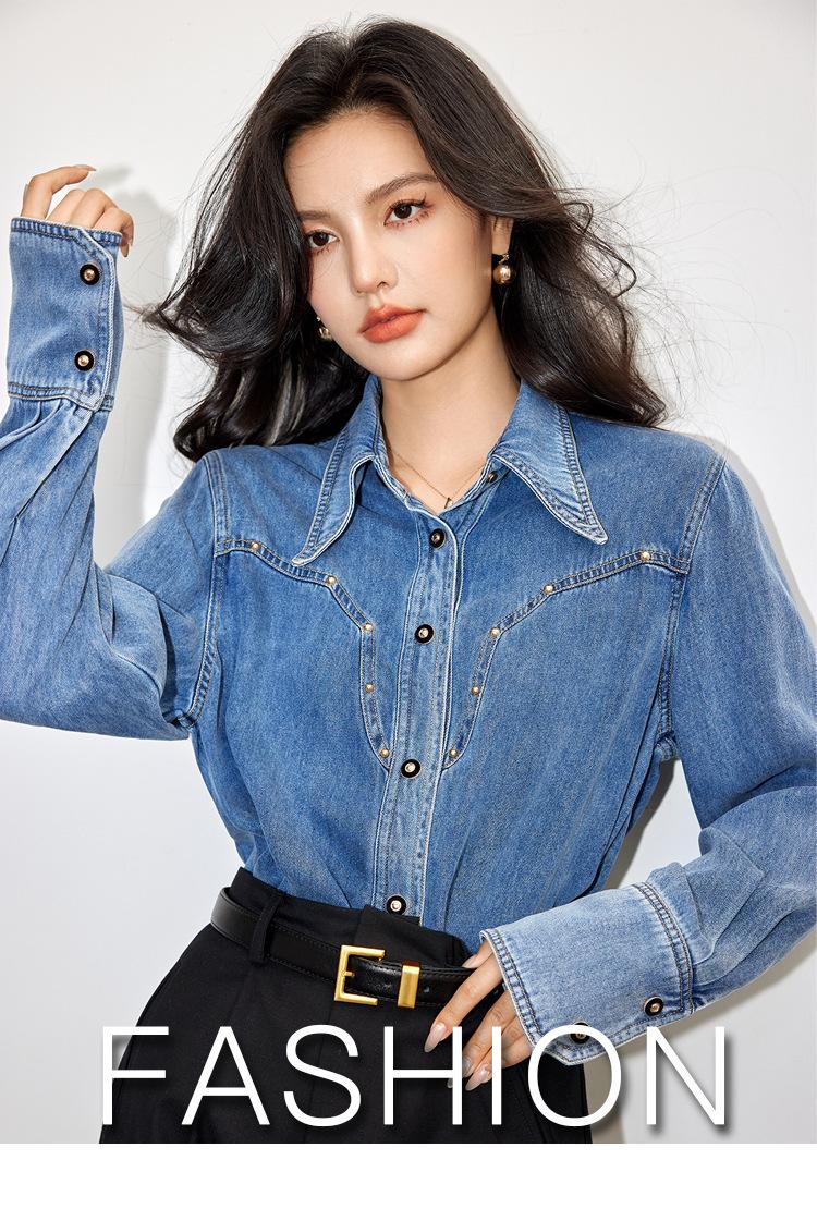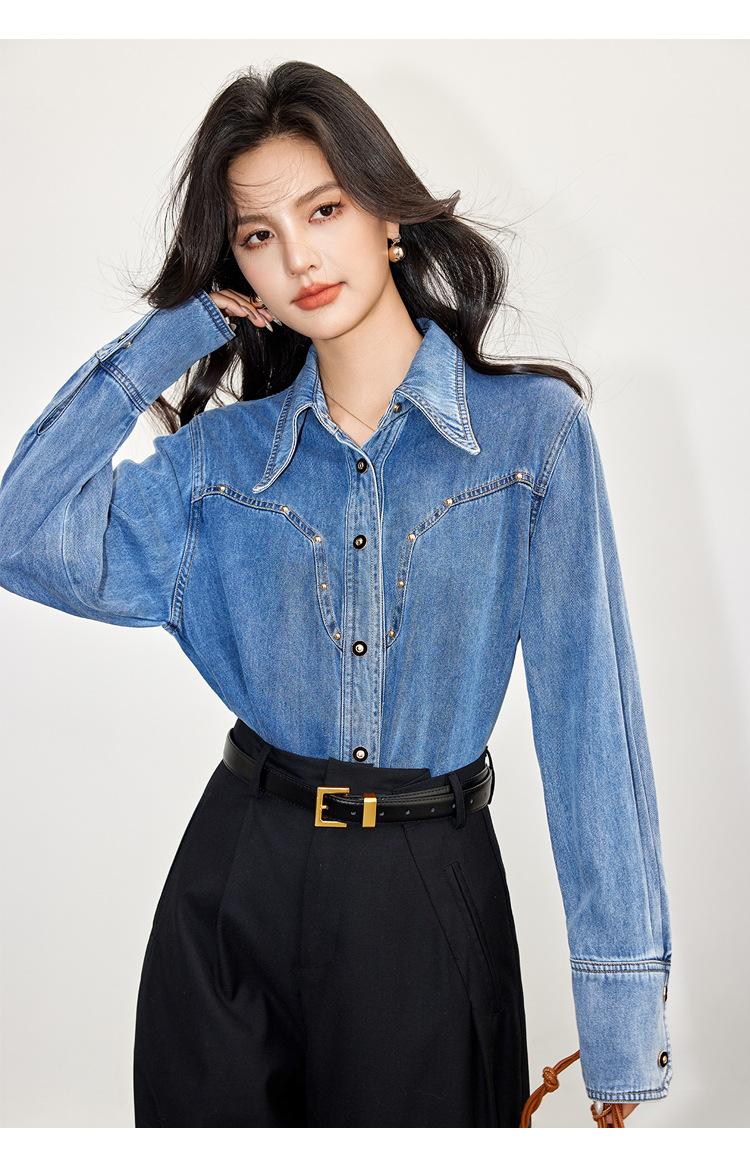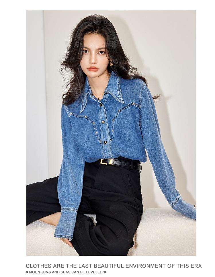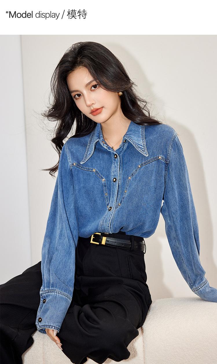 Foto Real de Camisa Petite en Capas Estilo Retro Hong Kong de Mezclilla Versátil Holgada de Manga Larga para Mujer