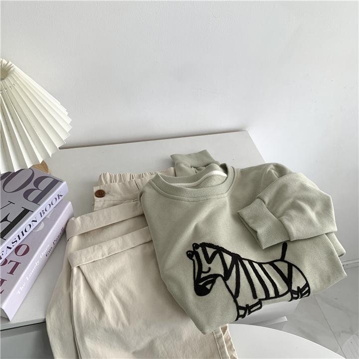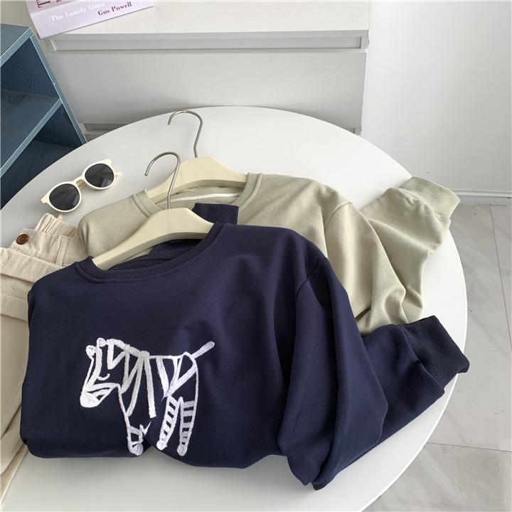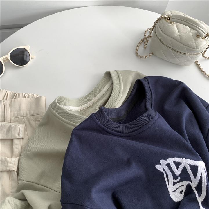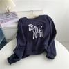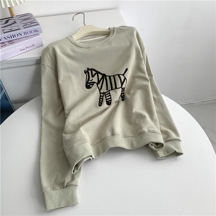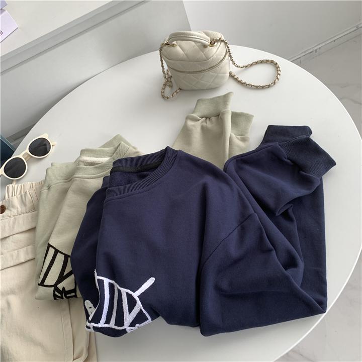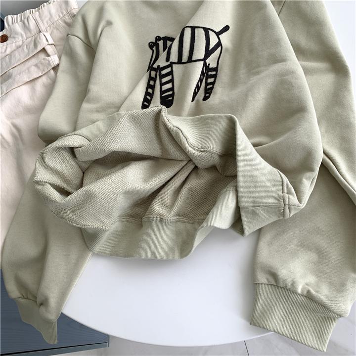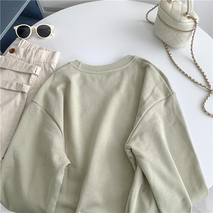Suéter de cuello redondo de manga larga con bordado de dibujos animados de algodón Terry para mujer, abrigo informal holgado de cuello redondo verde guisante para mujer