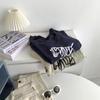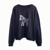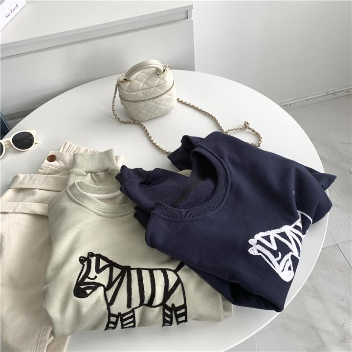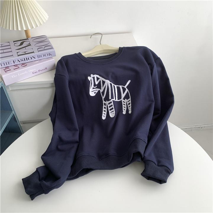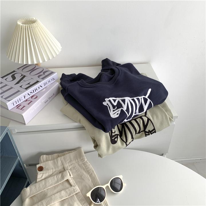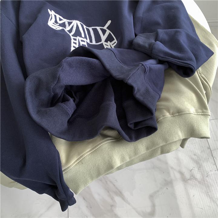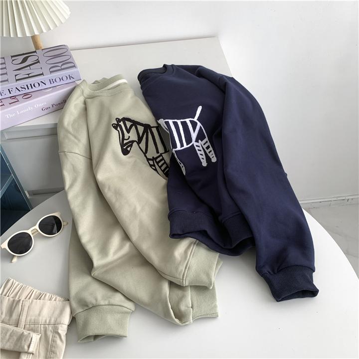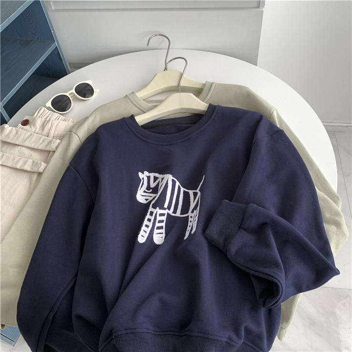 Suéter de cuello redondo de manga larga con bordado de dibujos animados de algodón Terry para mujer, abrigo informal holgado de cuello redondo verde guisante para mujer