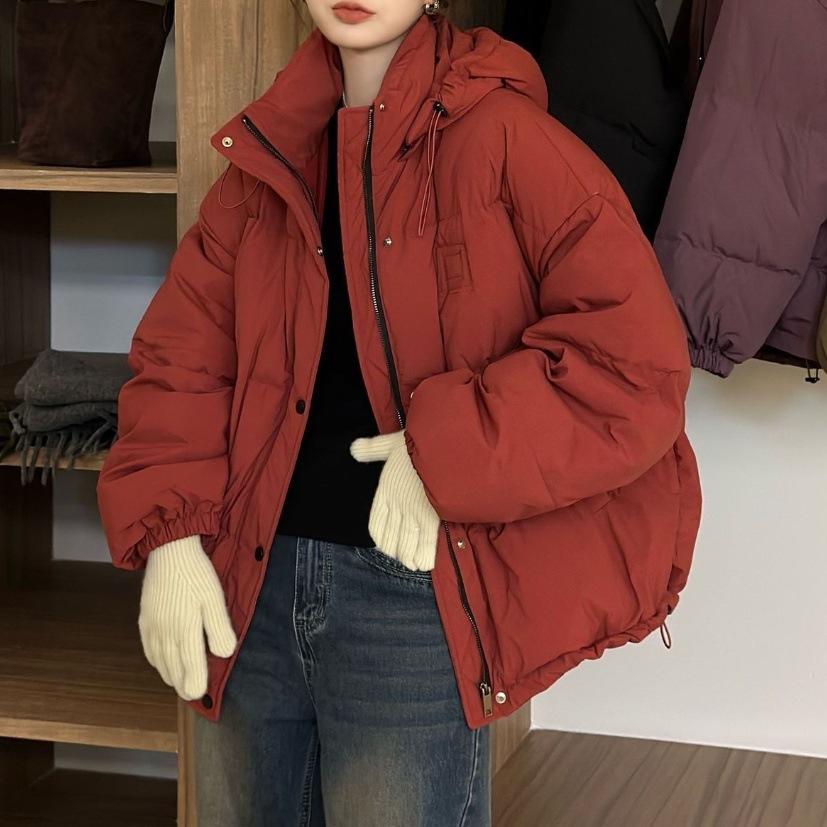 Ancolola Rojo Holgado Adelgazante Look Pan Ropa Exterior Cuello Alto Capucha Invierno Acolchado Algodón Ropa Exterior Diseño Estilo Occidental Ropa Exterior para Mujer Trendy