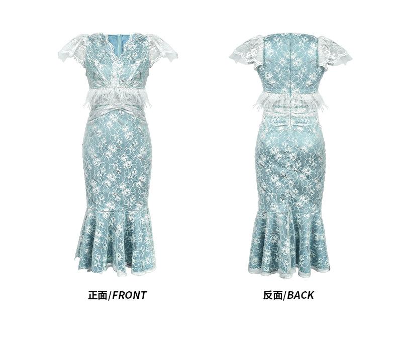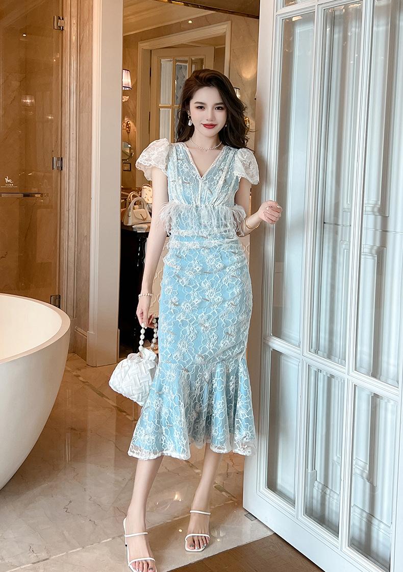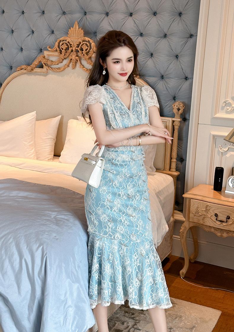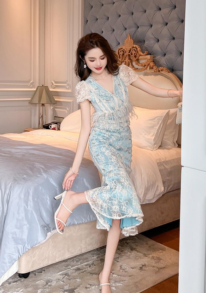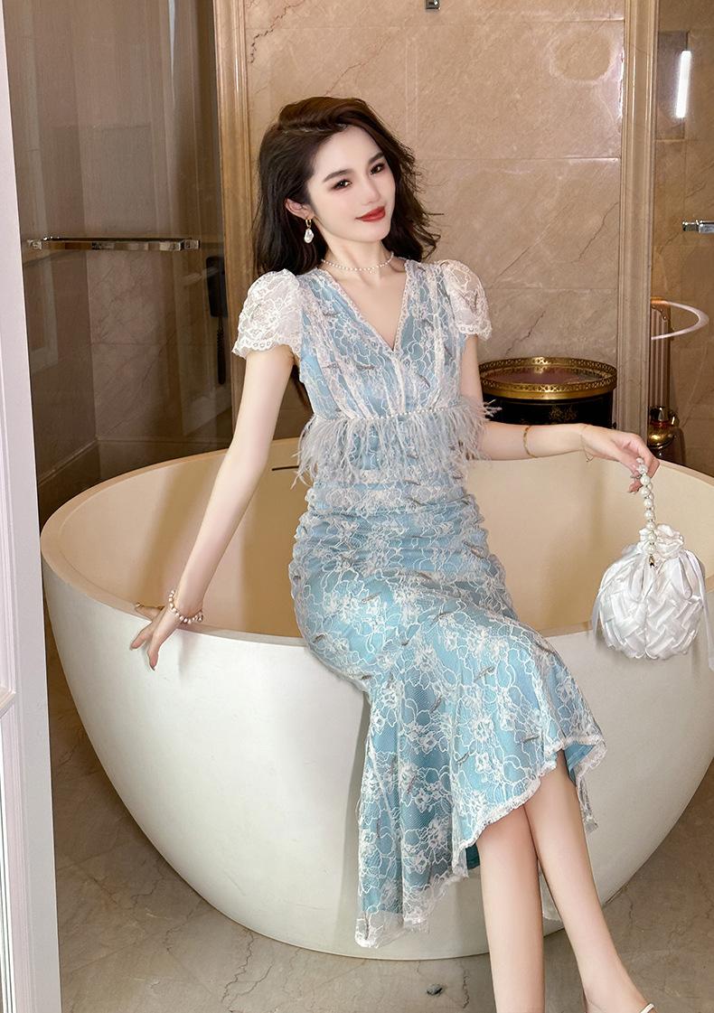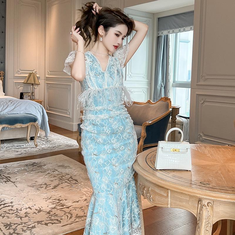 2025 Verano Nuevo Estilo Suave Cuello en V Manga Abullonada Fleco de Perlas Bodycon Encaje Sirena Vestido para Mujeres 10705
