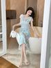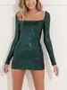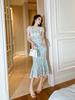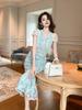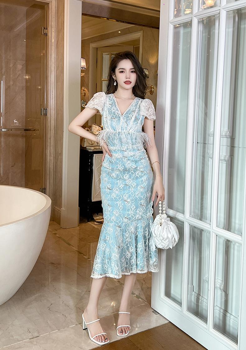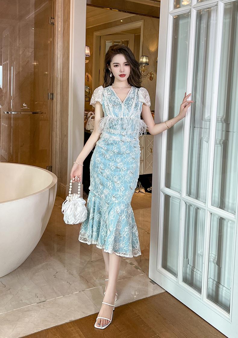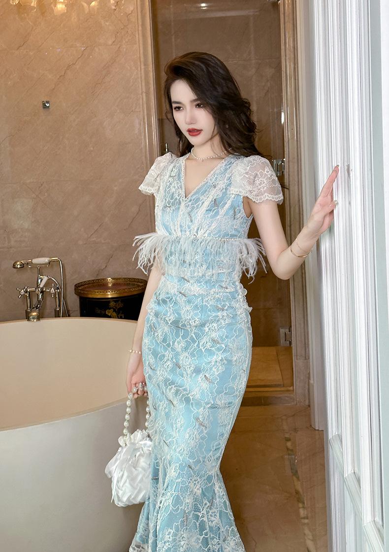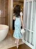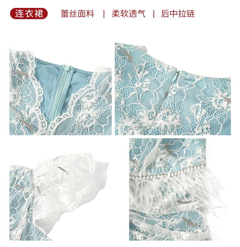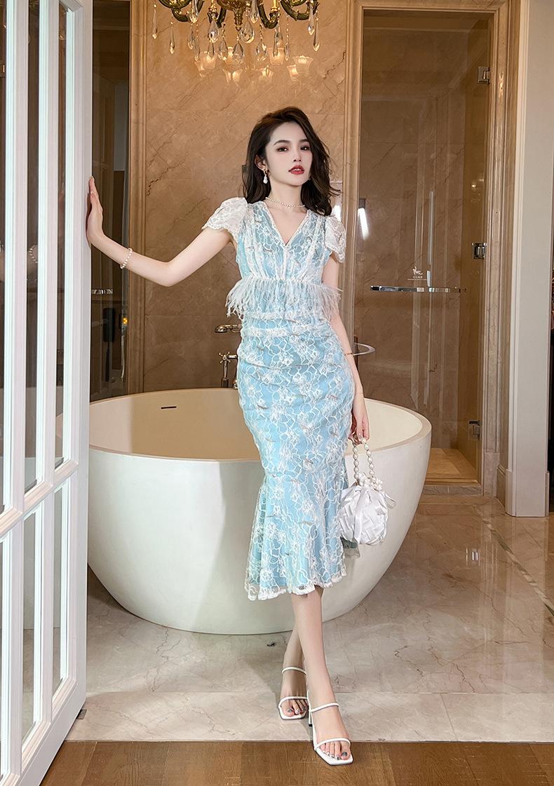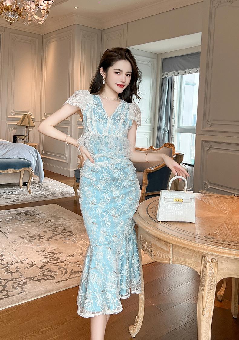 2025 Verano Nuevo Estilo Suave Cuello en V Manga Abullonada Fleco de Perlas Bodycon Encaje Sirena Vestido para Mujeres 10705