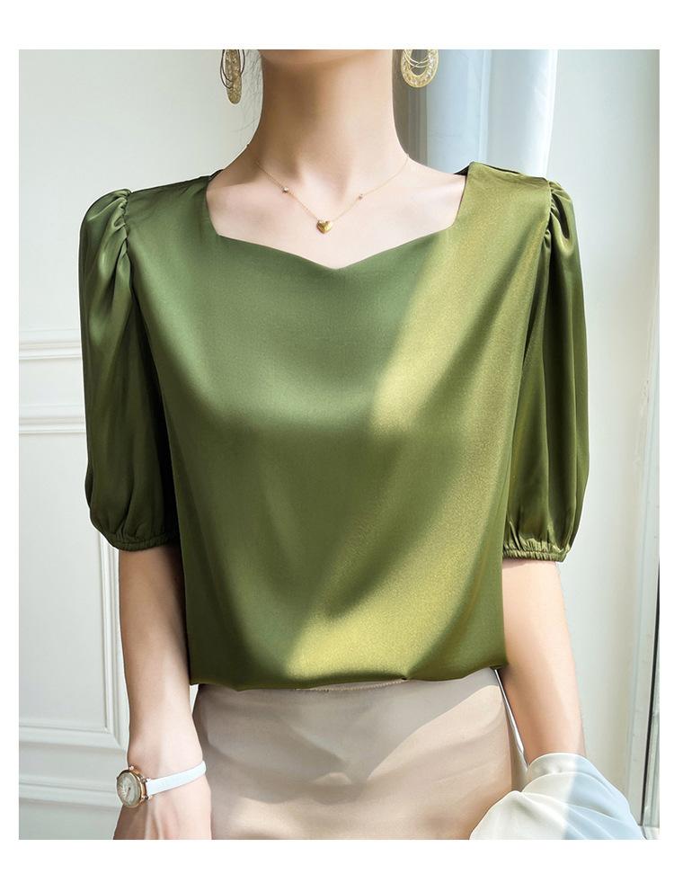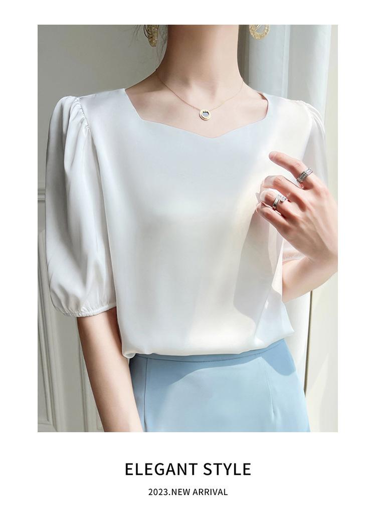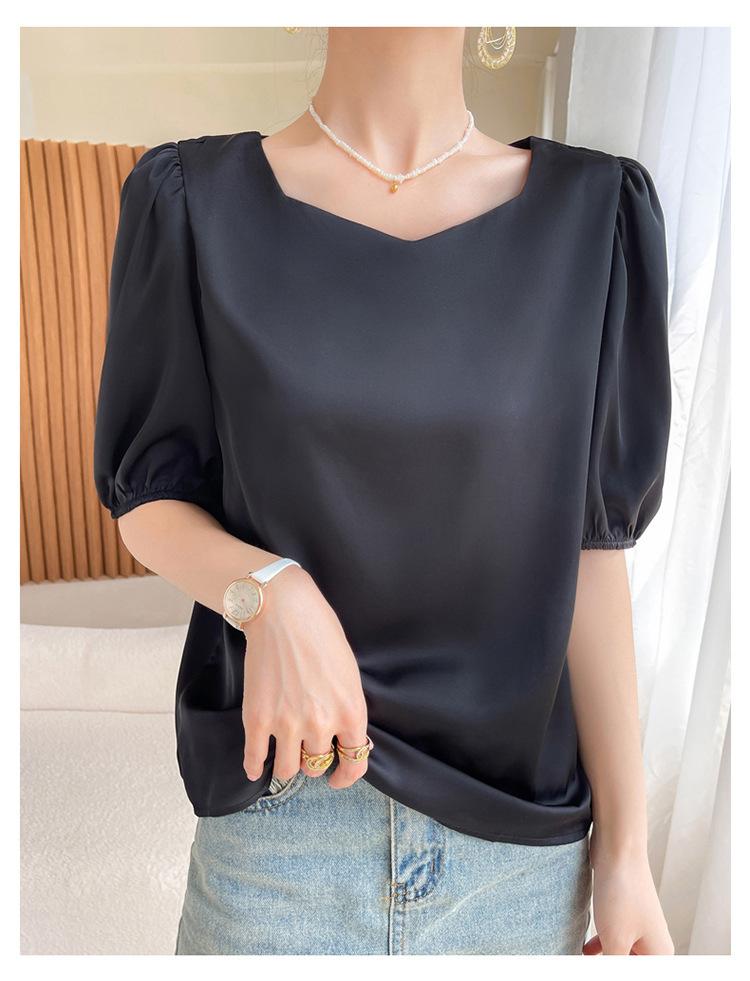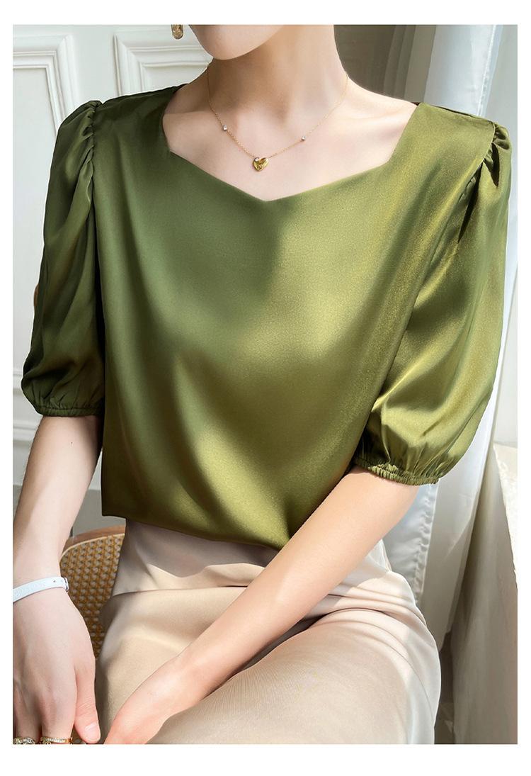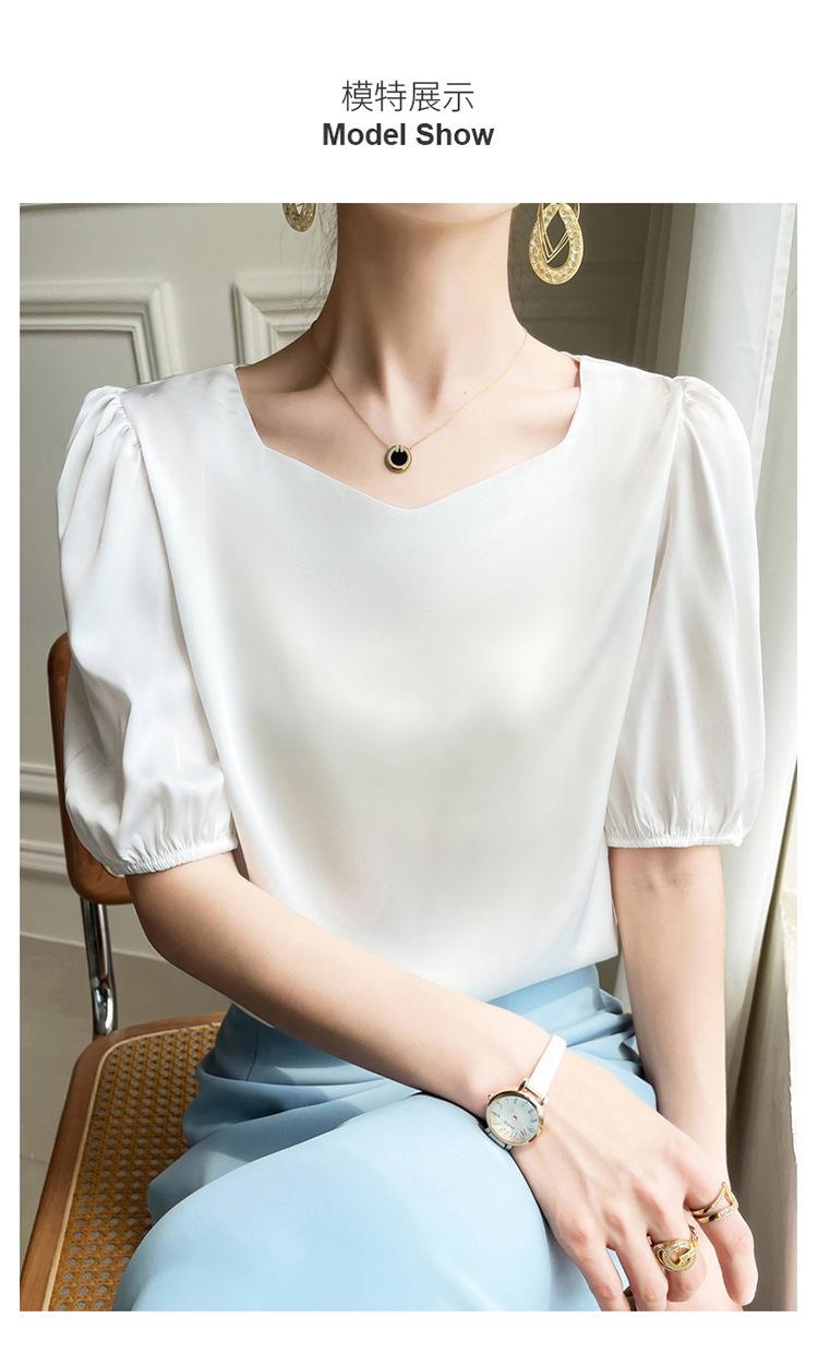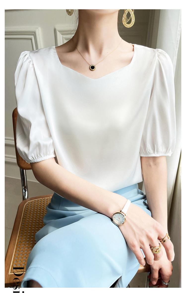 Camisa de verano con cuello melocotón y mangas abullonadas, holgada y elegante, de manga corta, con cuello de diamante para mujer