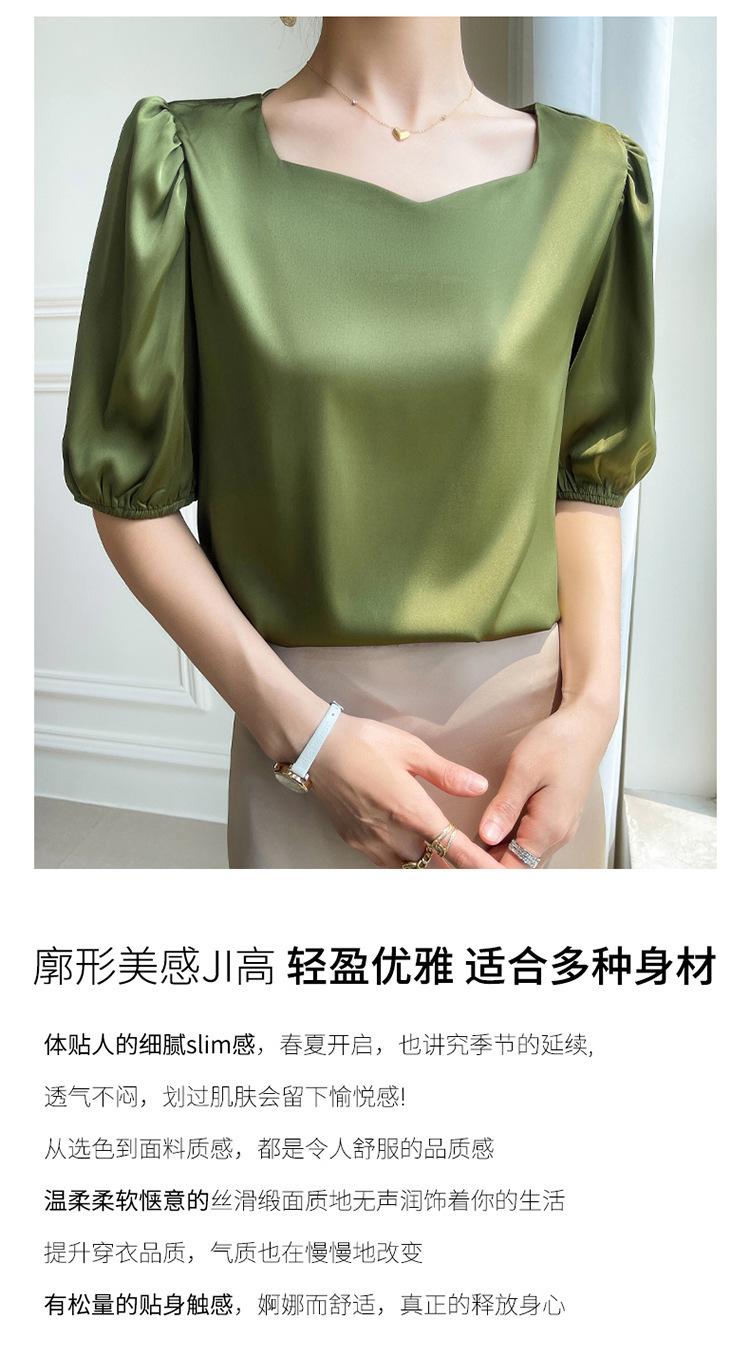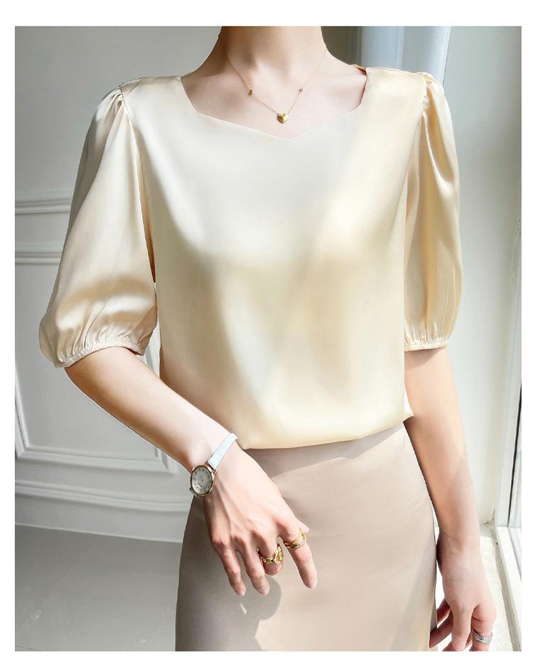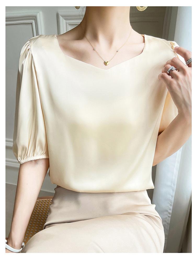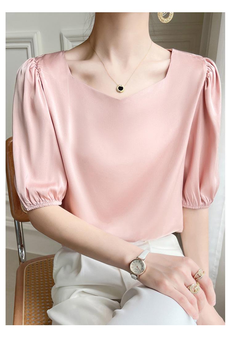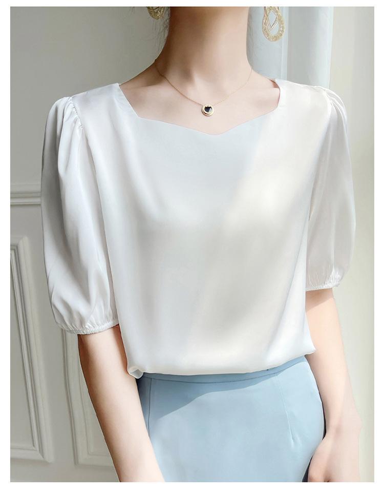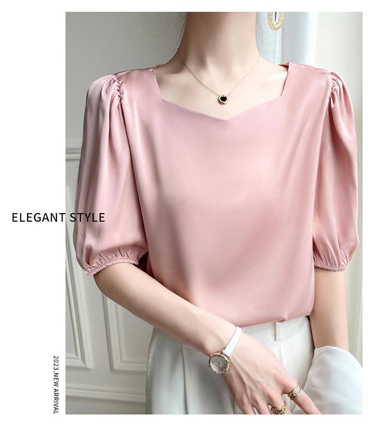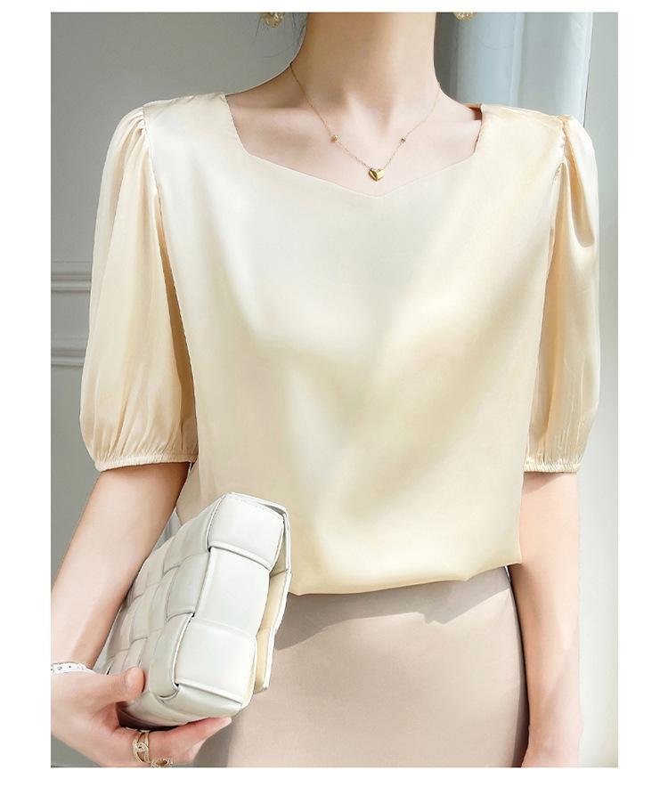 Camisa de verano con cuello melocotón y mangas abullonadas, holgada y elegante, de manga corta, con cuello de diamante para mujer