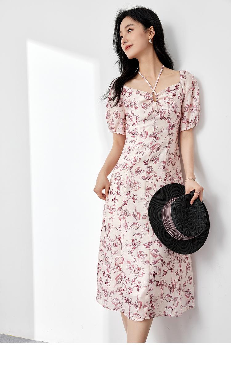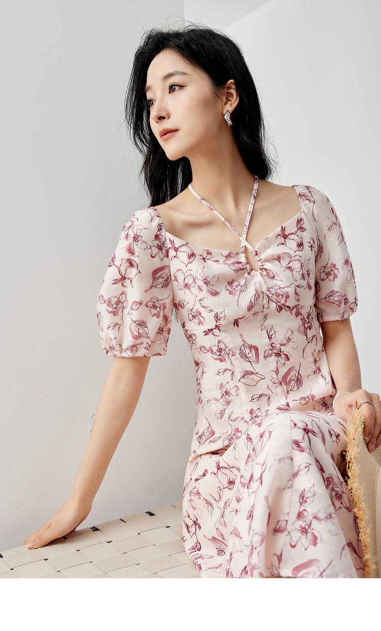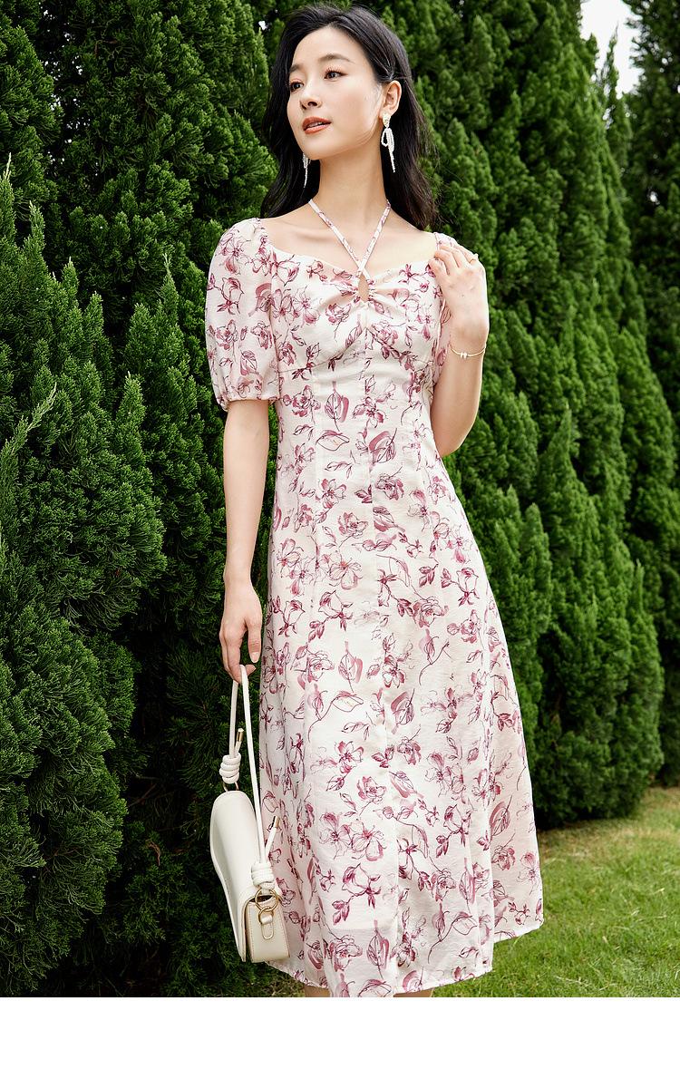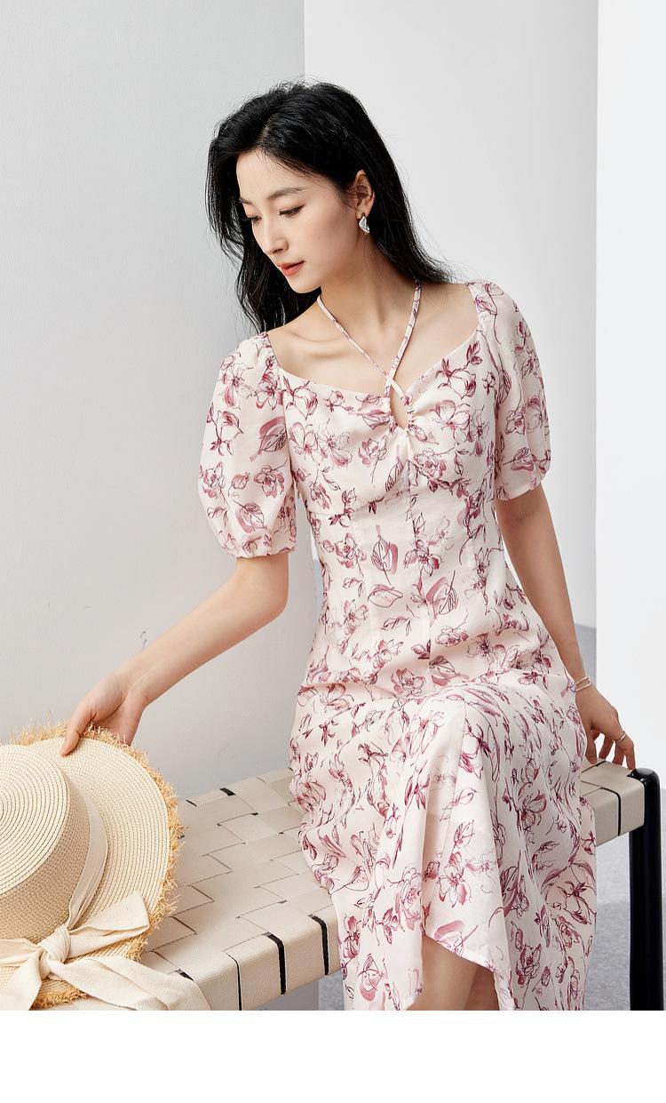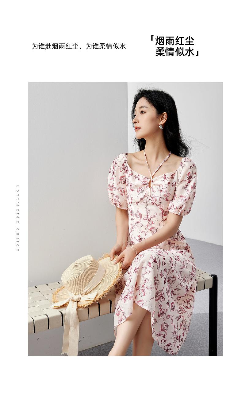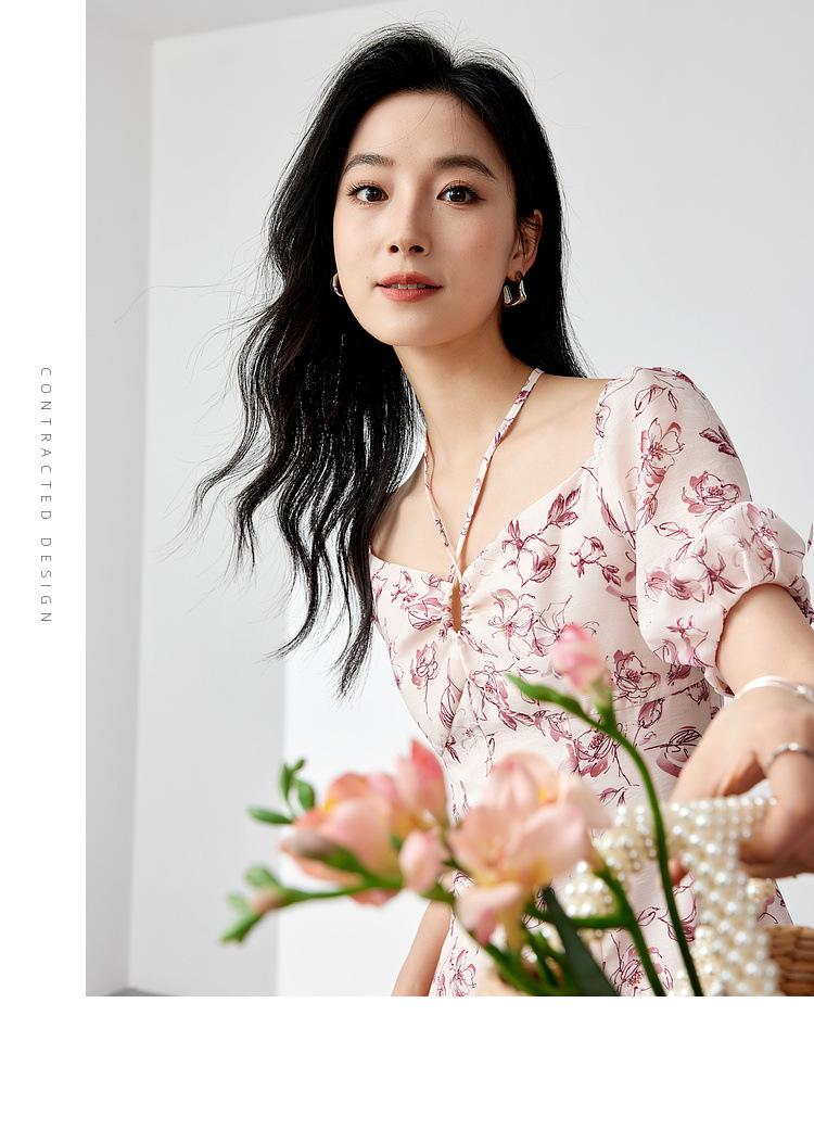Vestido elegante informal de cintura alta con estampado de moda de manga corta y cuello colgante para mujer de Zhen Xi DP291
