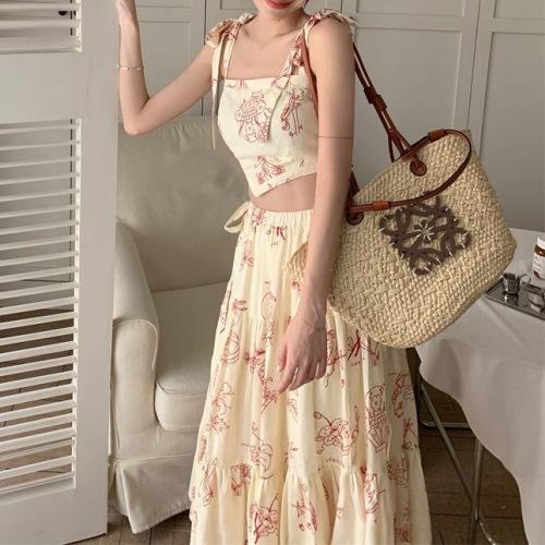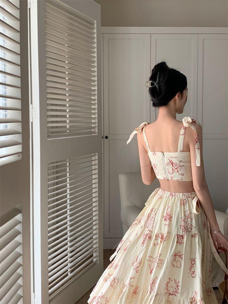 Traje Retro Camisola Estampada para Mujer 2025 Verano Estilo Coreano Falda Slim de Cintura Alta Falda Midi Set de Dos Piezas