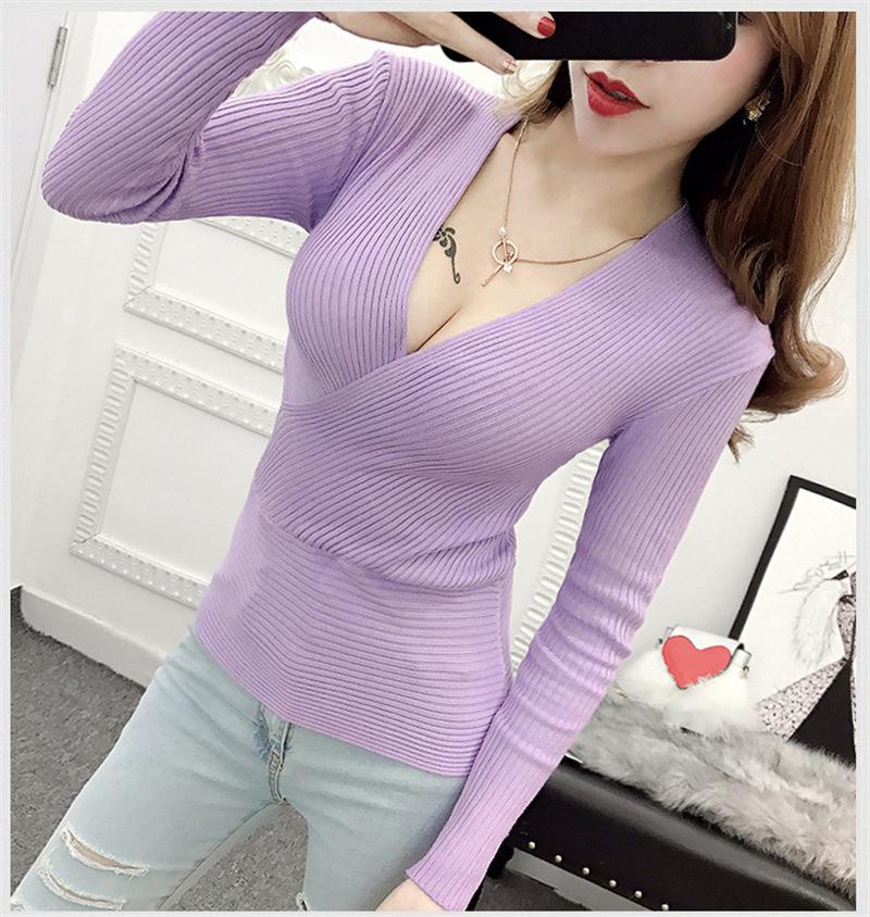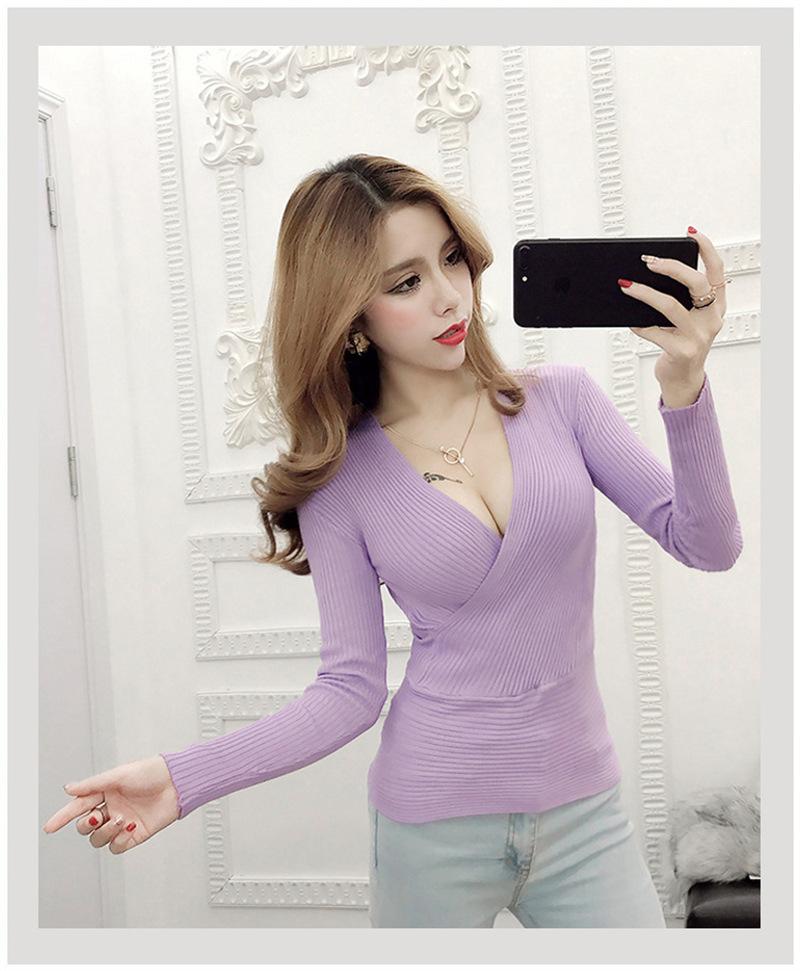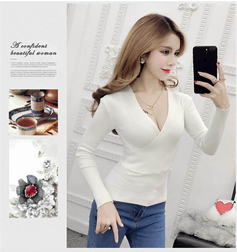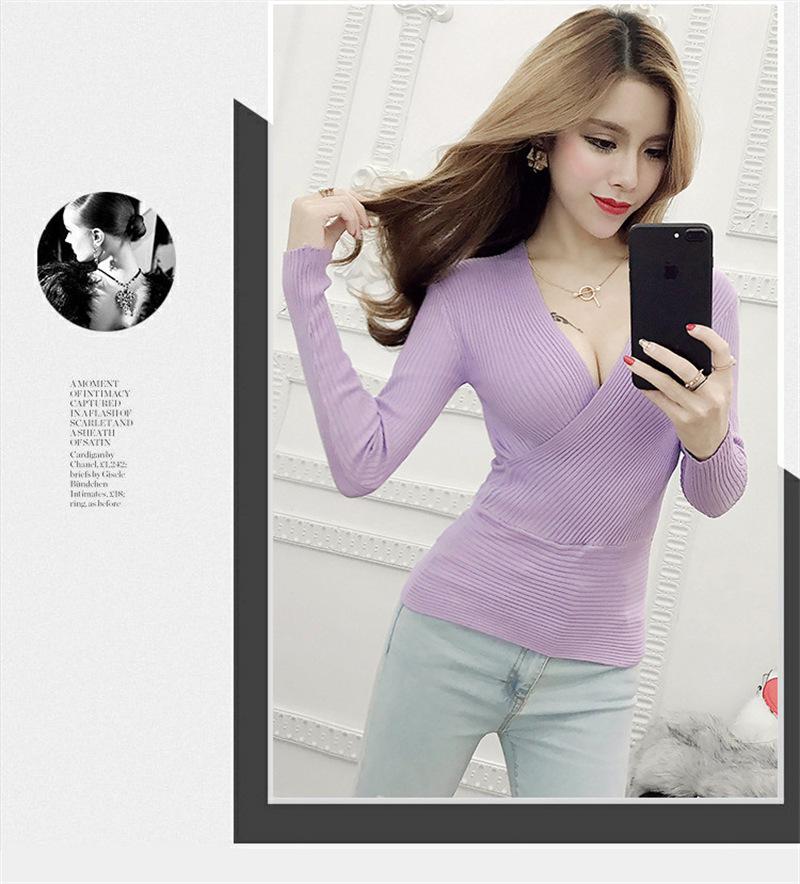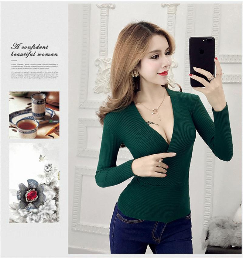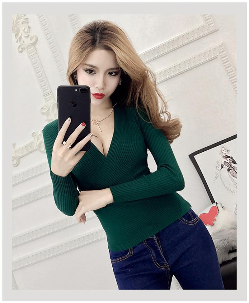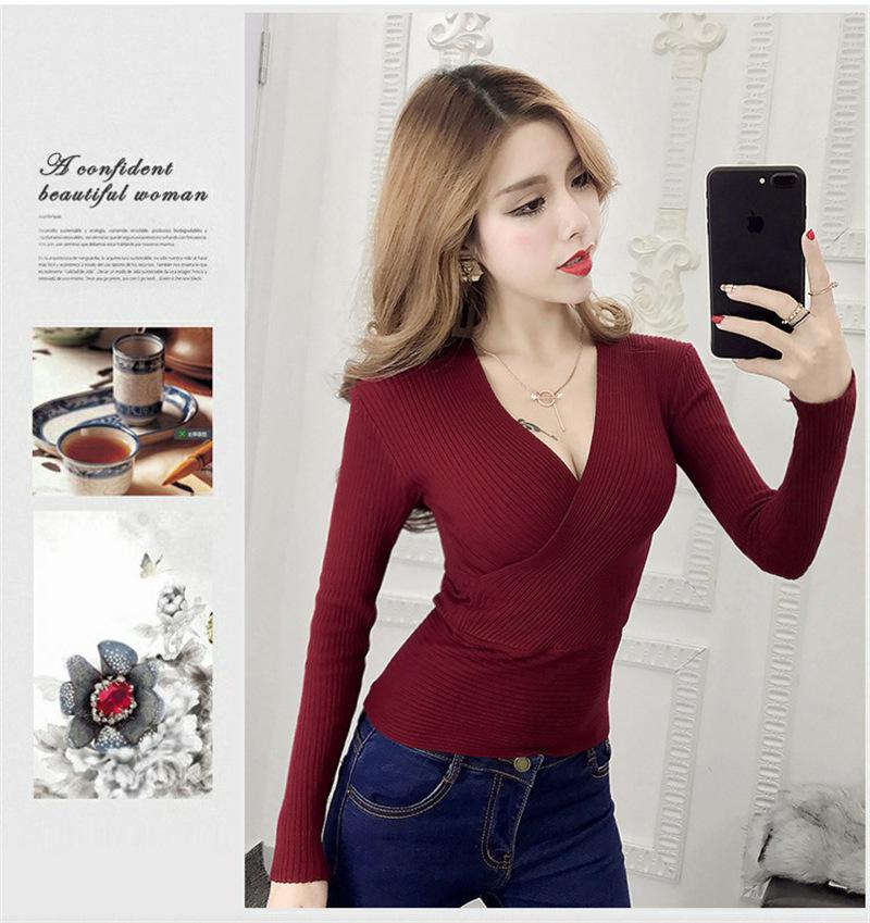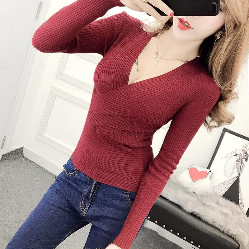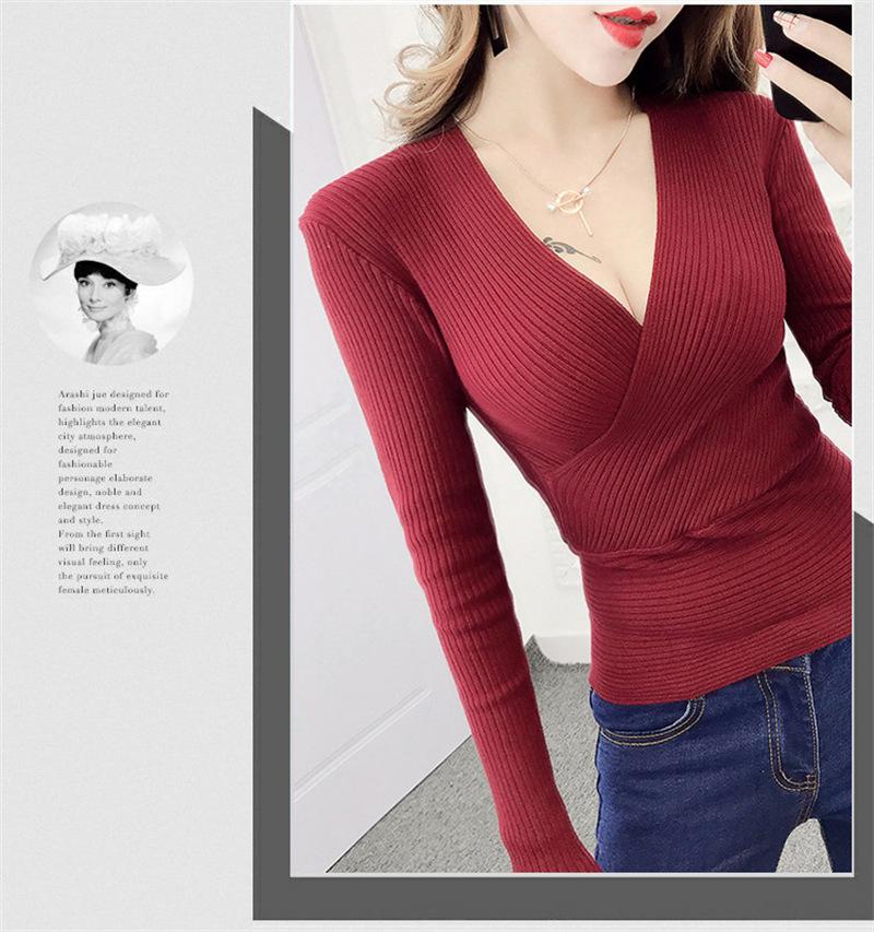 Suéter de punto de manga larga ajustado y escotado con cuello en V cruzado de color sólido sexy para otoño e invierno para mujer