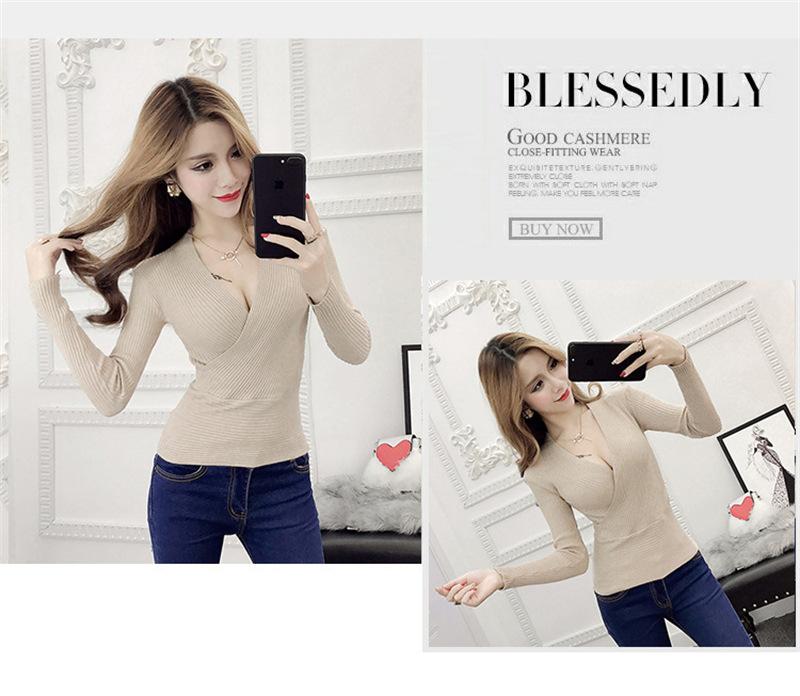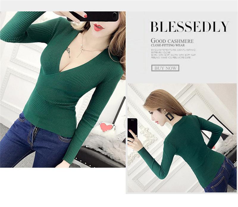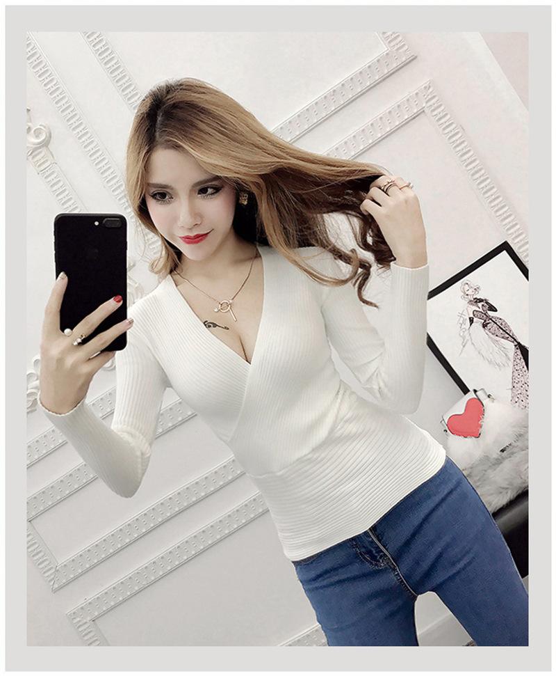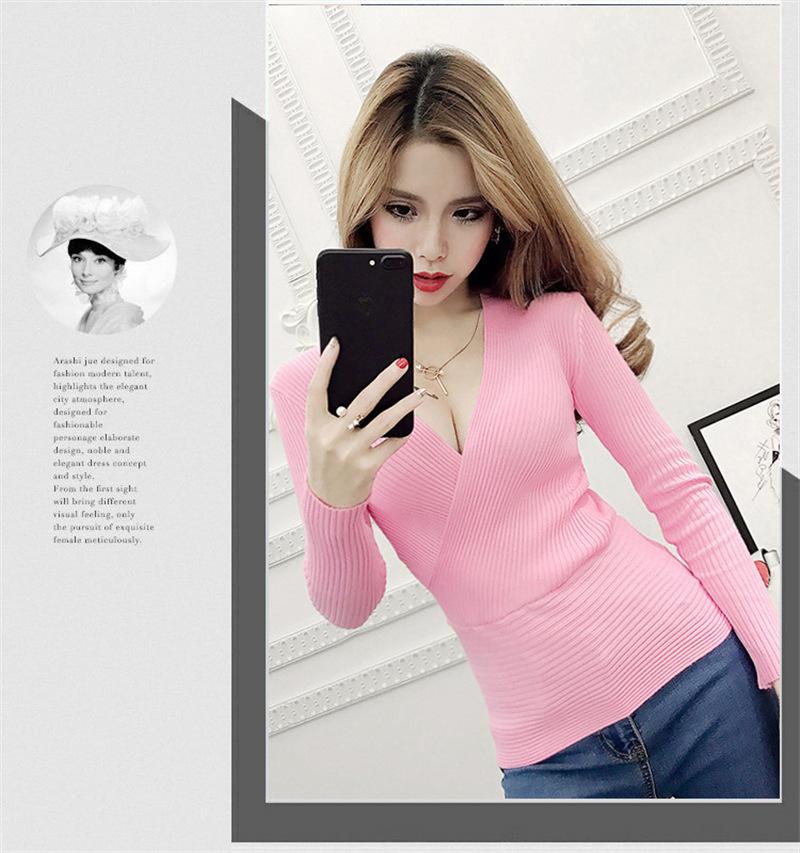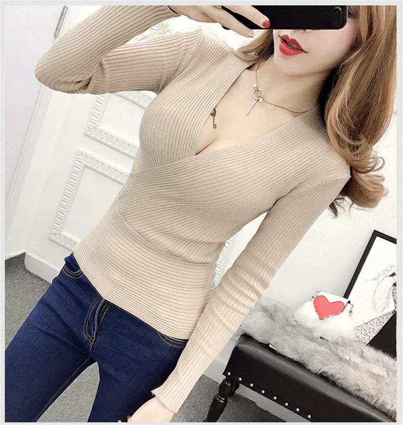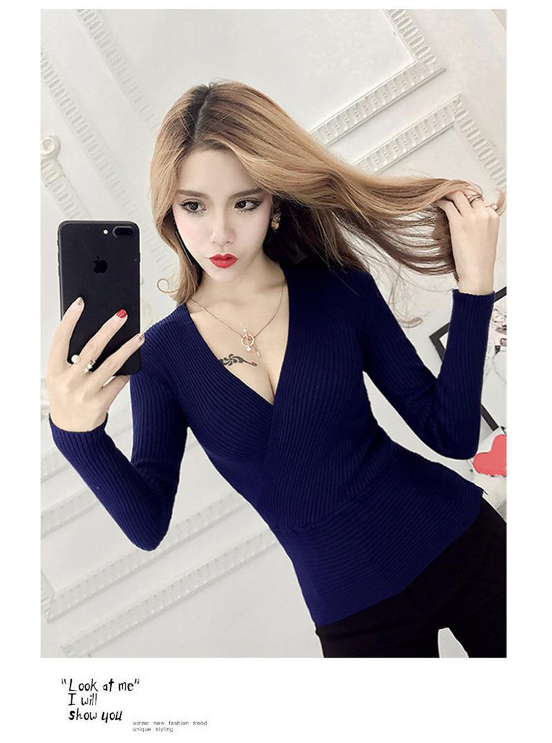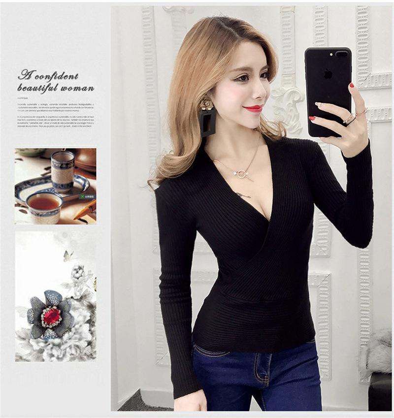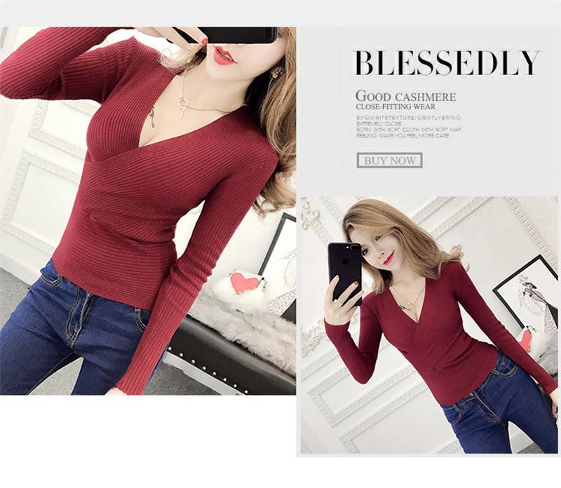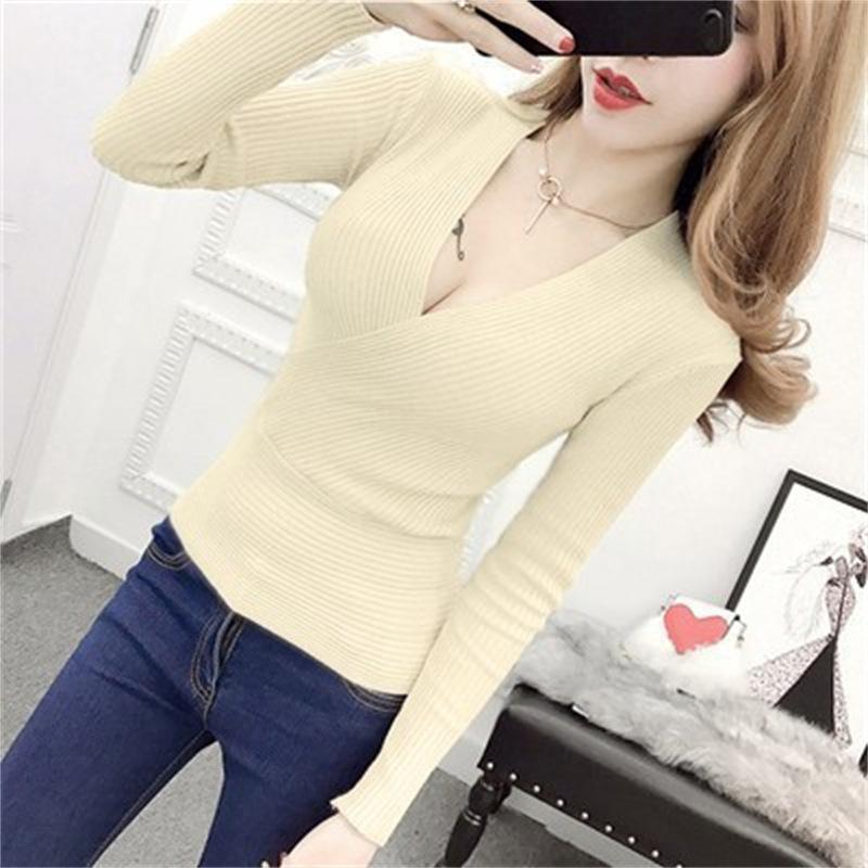 Suéter de punto de manga larga ajustado y escotado con cuello en V cruzado de color sólido sexy para otoño e invierno para mujer