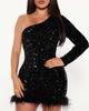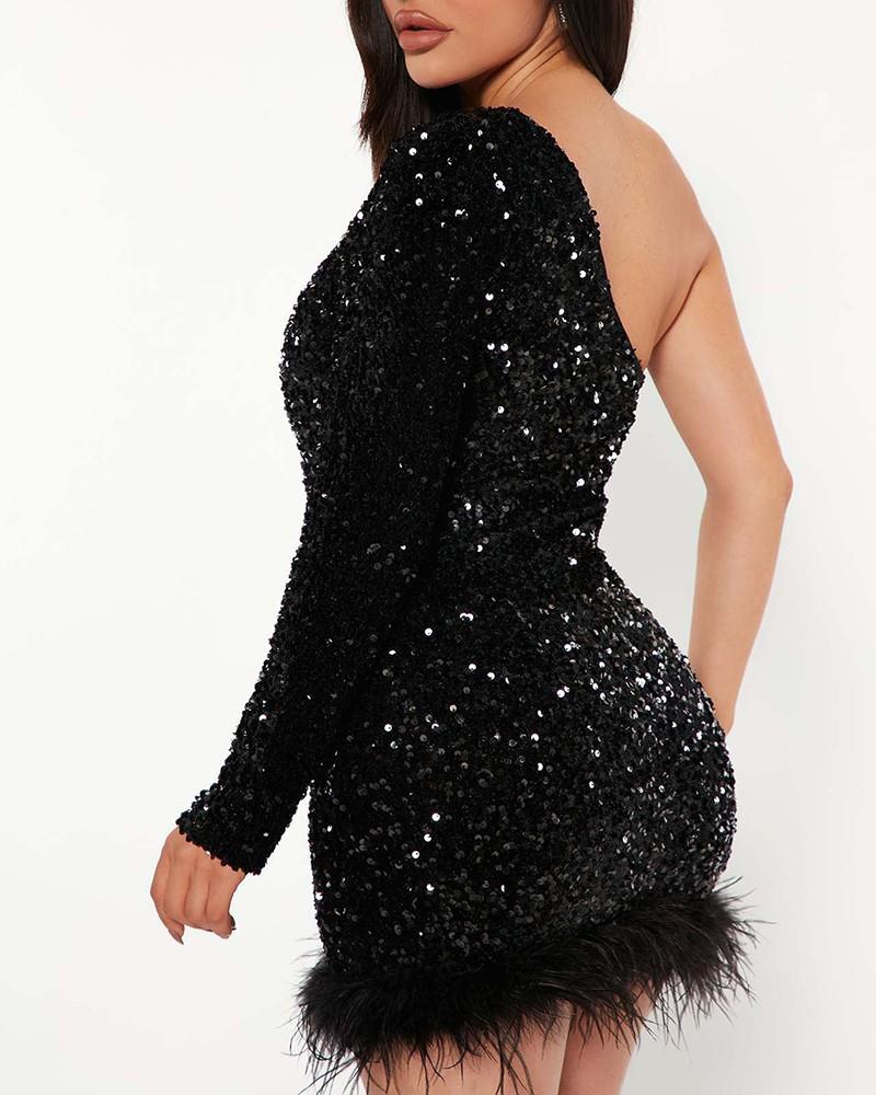 Primavera 2025 Nuevo Transfronterizo Un Hombro Hombro Descubierto Lentejuelas Falda Midi Hombro Inclinado Sexy Moderno Pluma Vestido de Noche