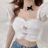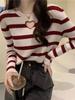 Camisola de punto calado con cuello cuadrado para mujer, nueva camiseta de verano de manga corta con diseño dulce y rayas adelgazantes.