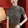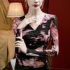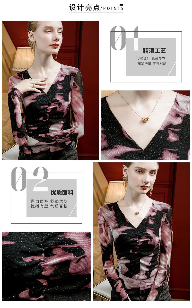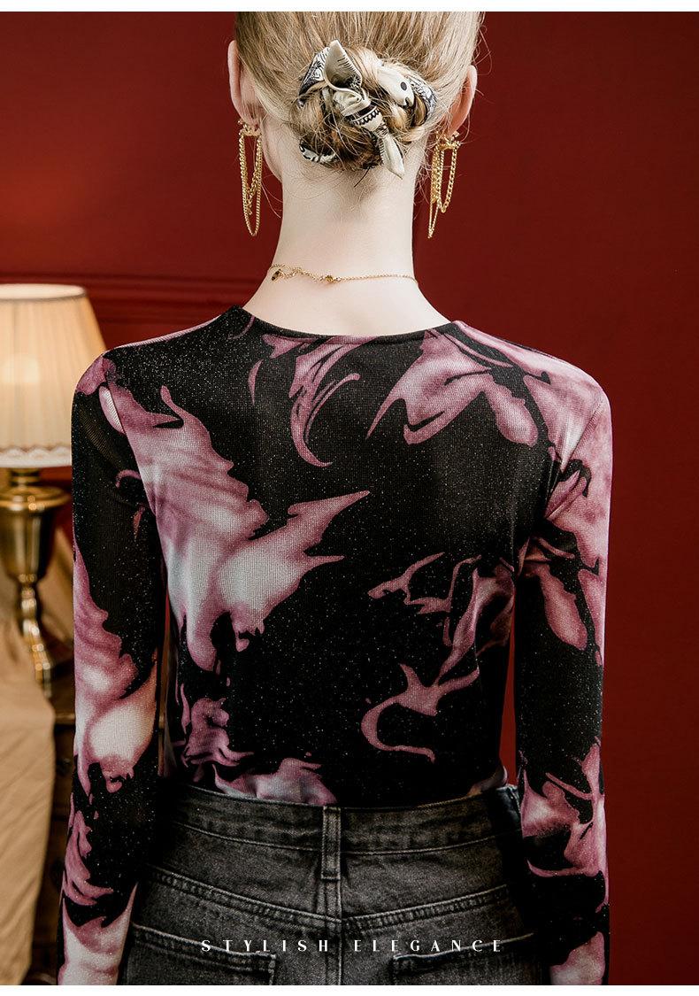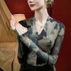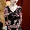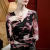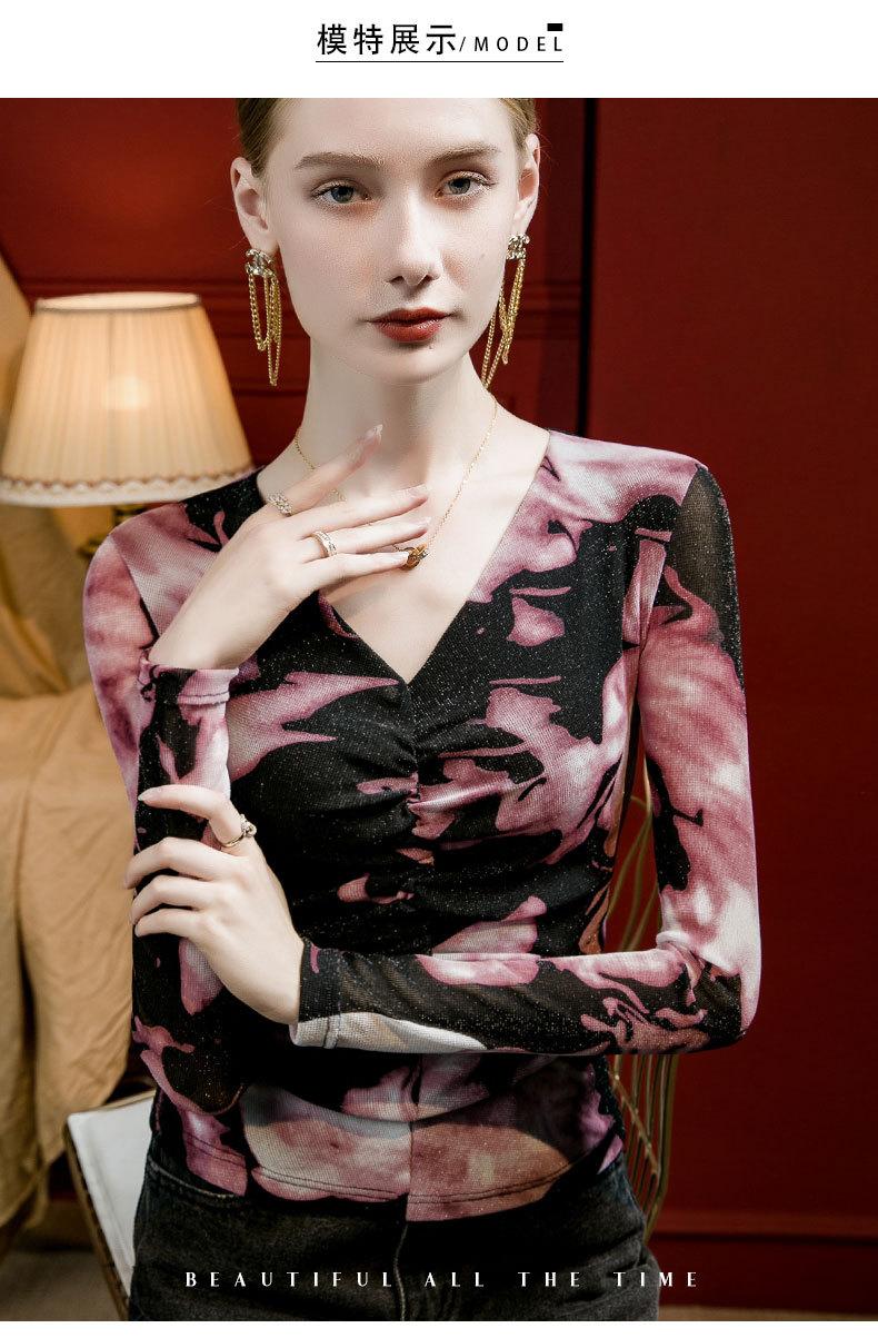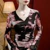 Camiseta básica de malla con cuello en V estampado tie-dye para mujer, plisada, ajustada, estilo nuevo de otoño 2023, interior de seda brillante, camisa pequeña estilo occidental