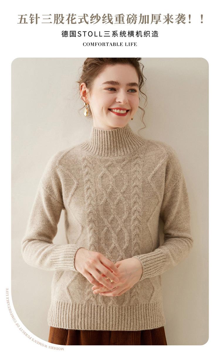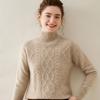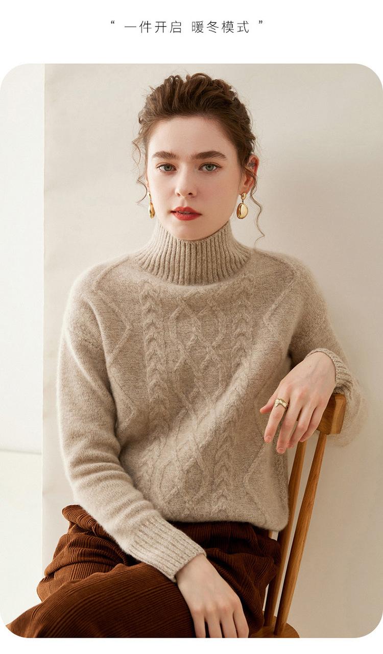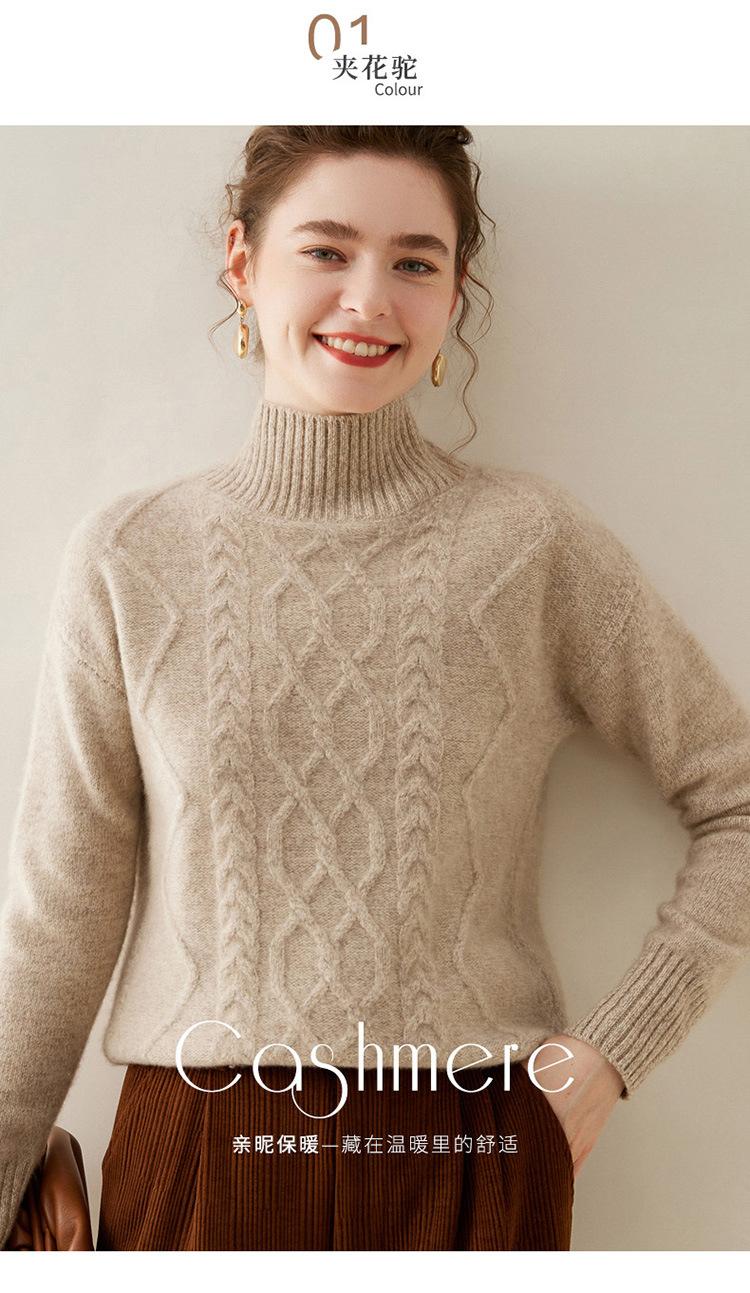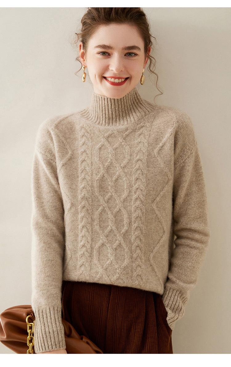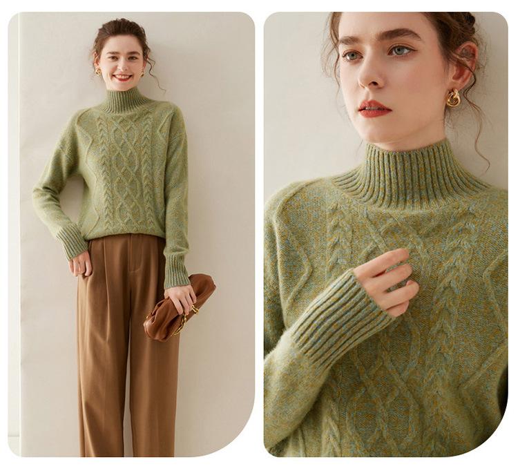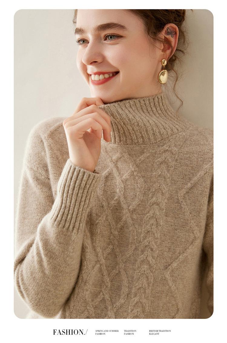 Suéter de cachemira de cuello alto para mujer, otoño e invierno de 2023, manga larga, flor en la cabeza, suéter de cachemira con giro en arena, combinable con todo.
