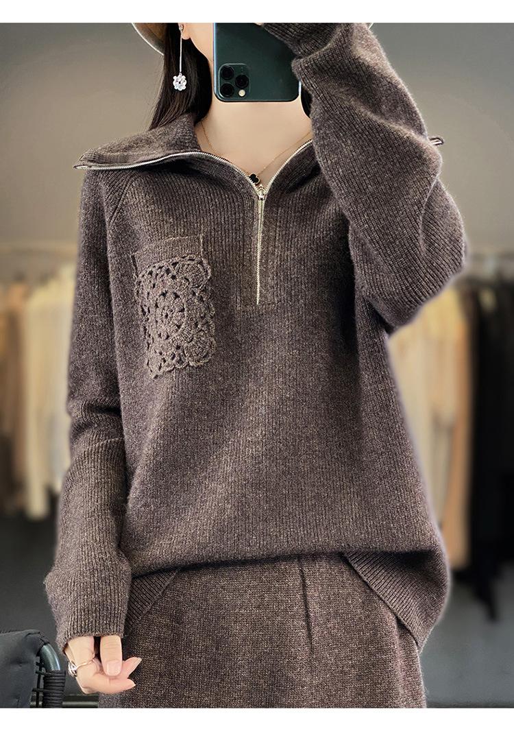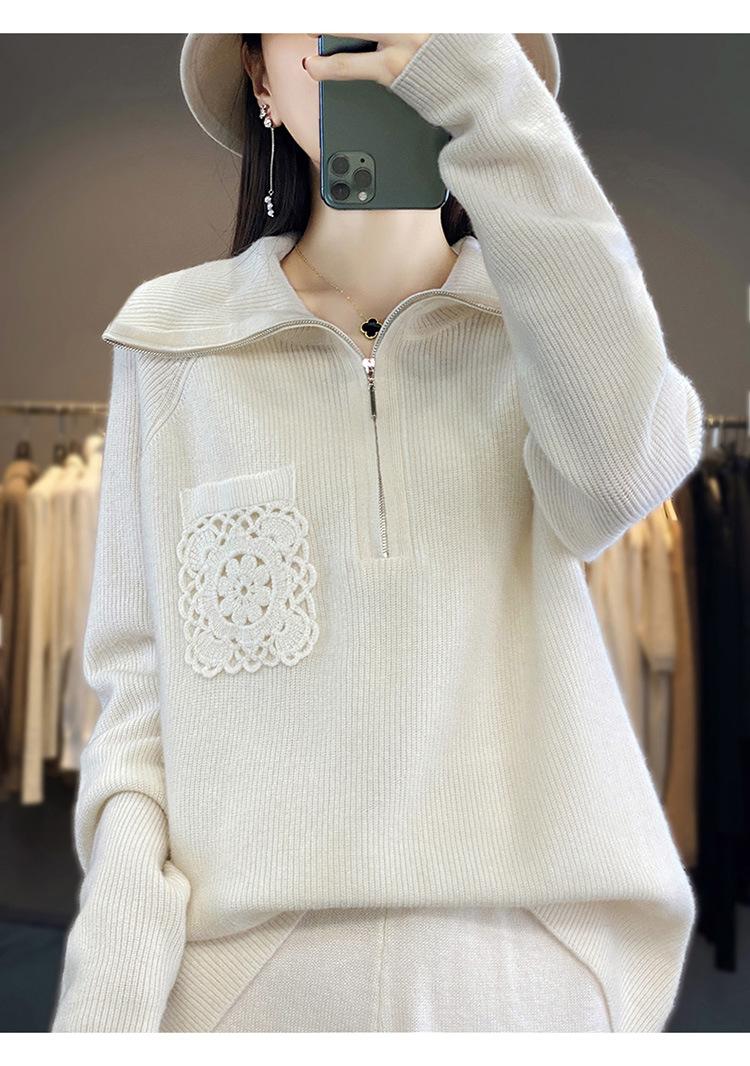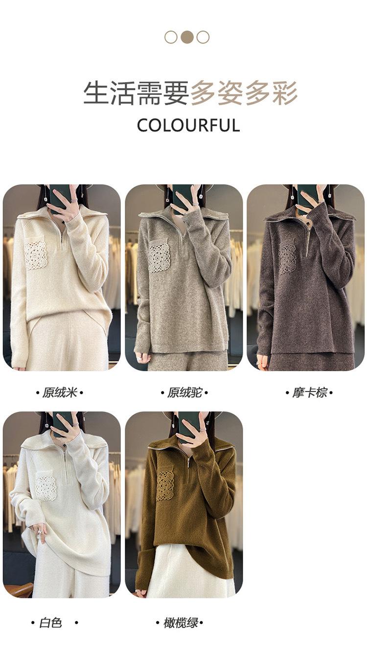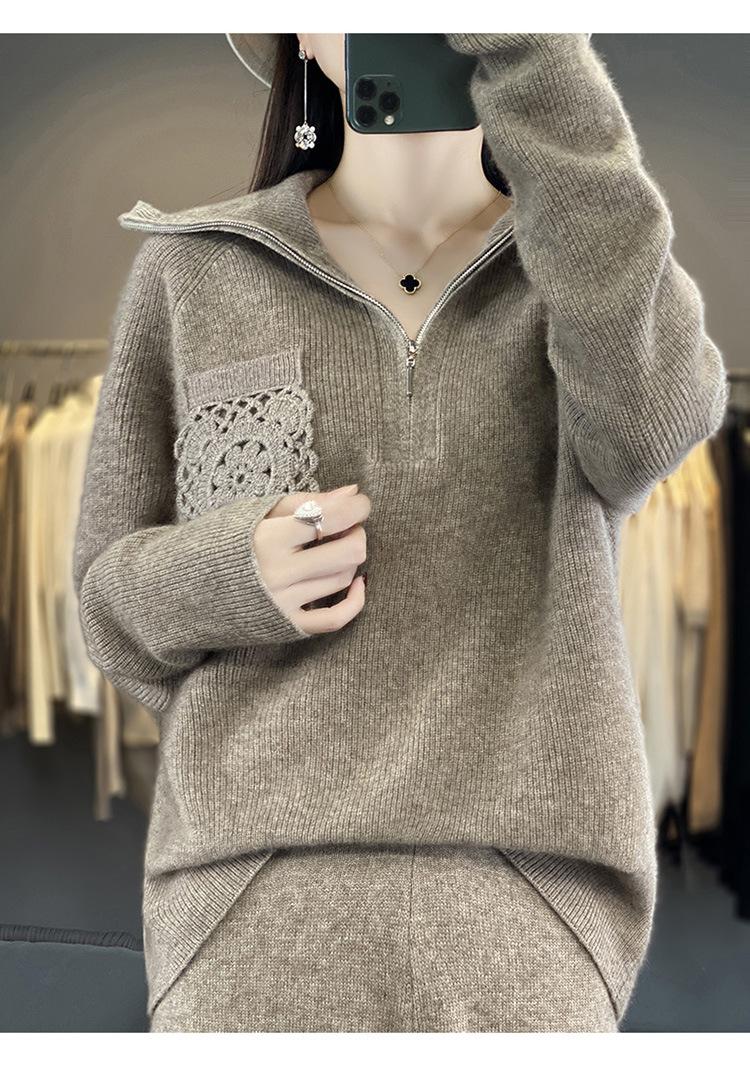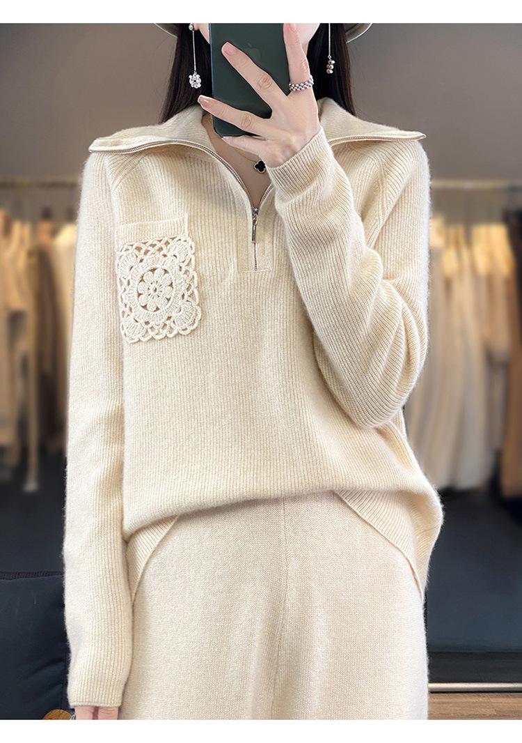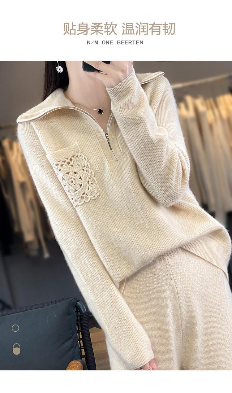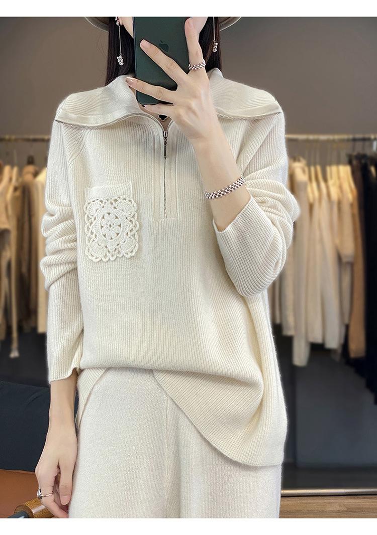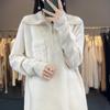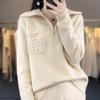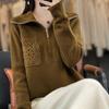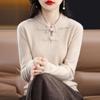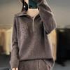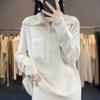 100% Lana Pura Otoño e Invierno 2025 Nuevo Camiseta de Fondo de Punto Cálida Corta Suelta con Solapa Abierta y Media Cremallera para Mujer