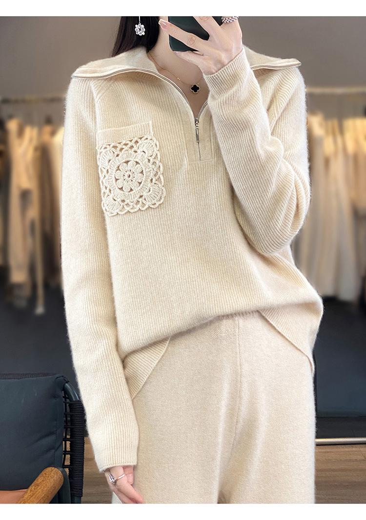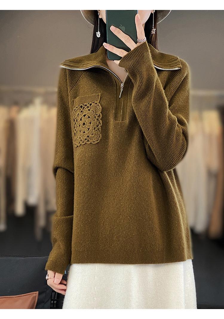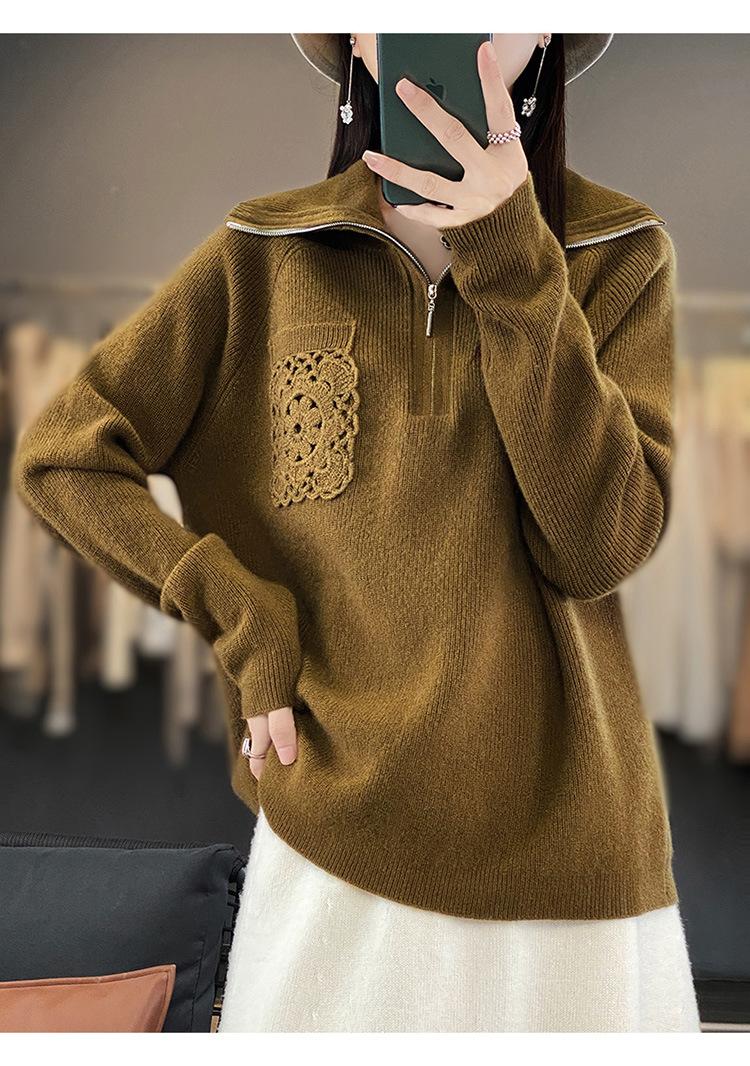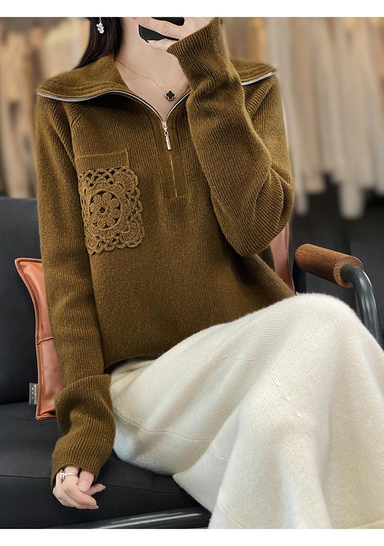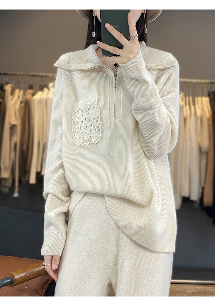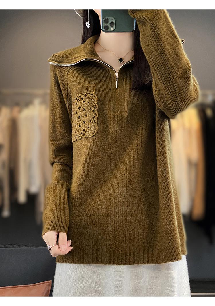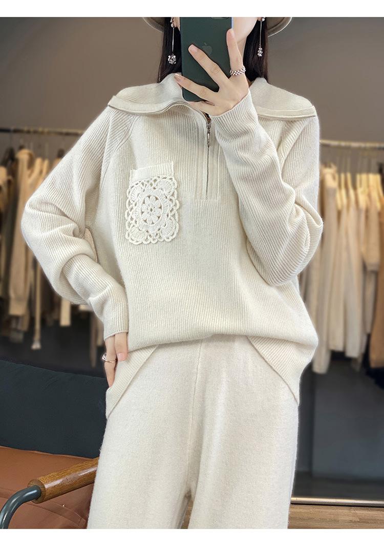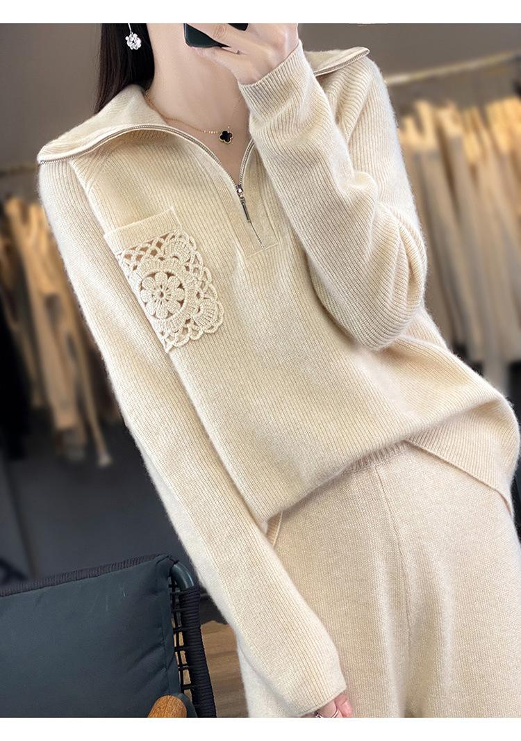 100% Lana Pura Otoño e Invierno 2025 Nuevo Camiseta de Fondo de Punto Cálida Corta Suelta con Solapa Abierta y Media Cremallera para Mujer