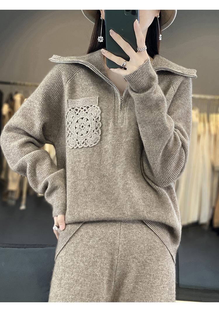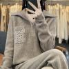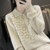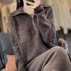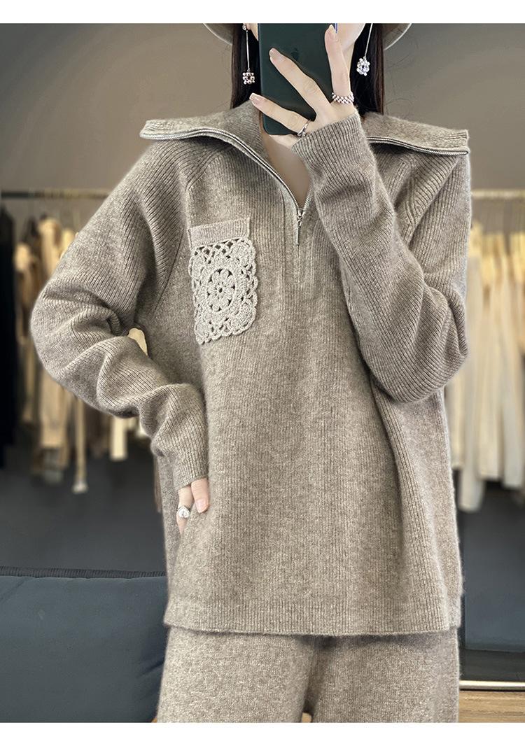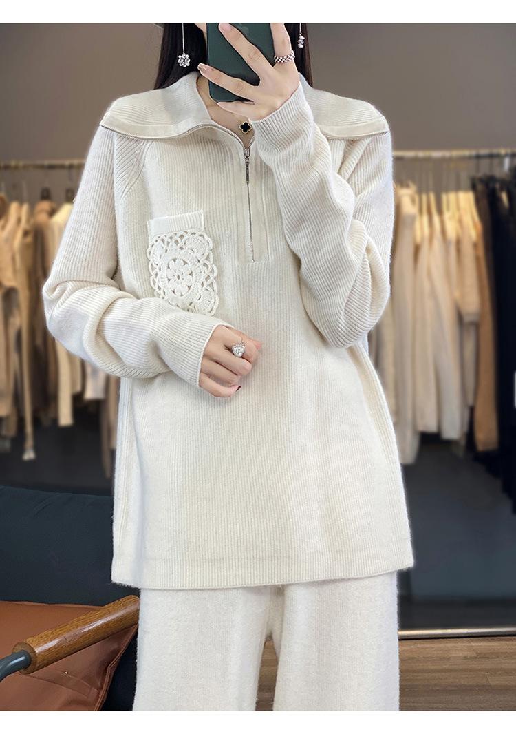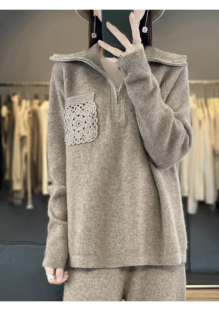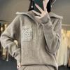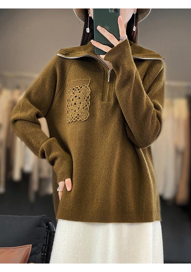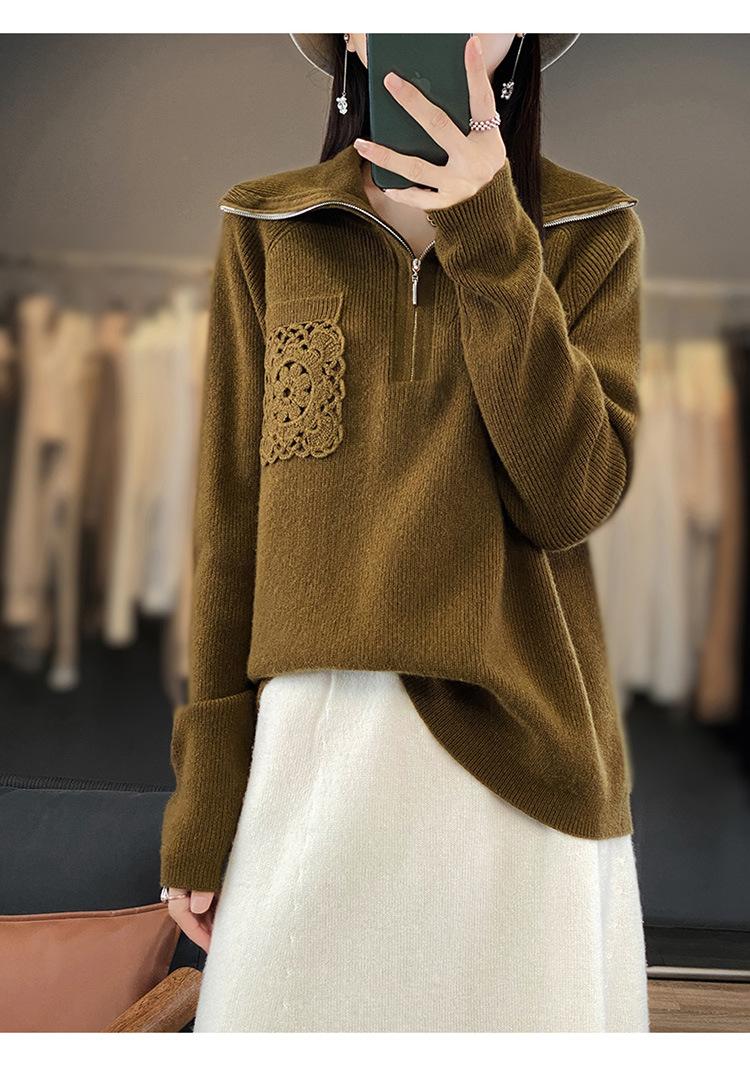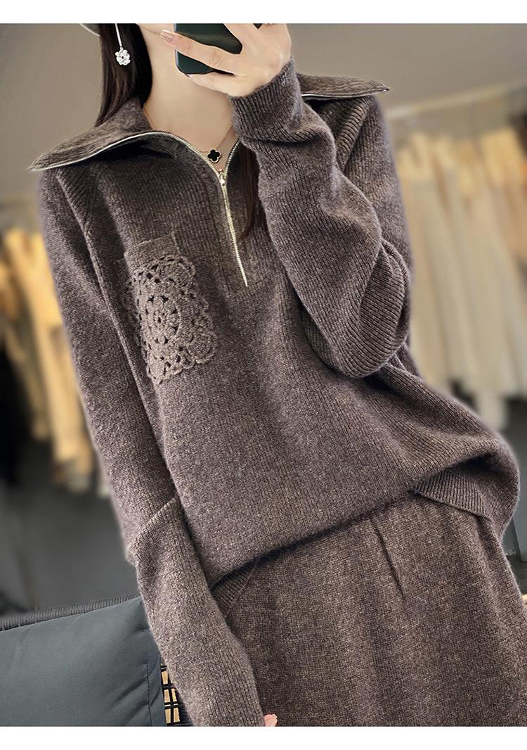 100% Lana Pura Otoño e Invierno 2025 Nuevo Camiseta de Fondo de Punto Cálida Corta Suelta con Solapa Abierta y Media Cremallera para Mujer