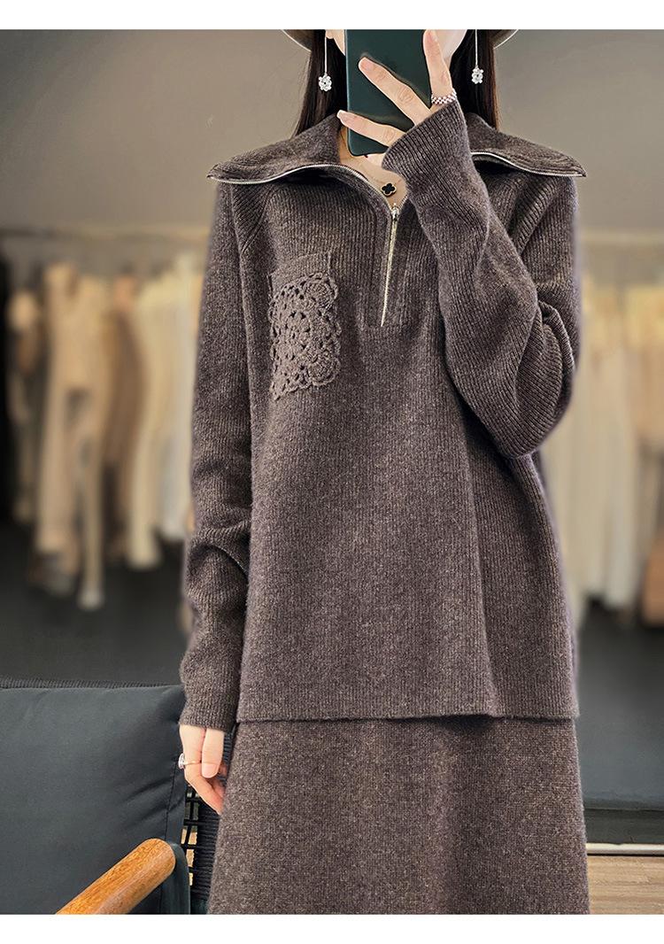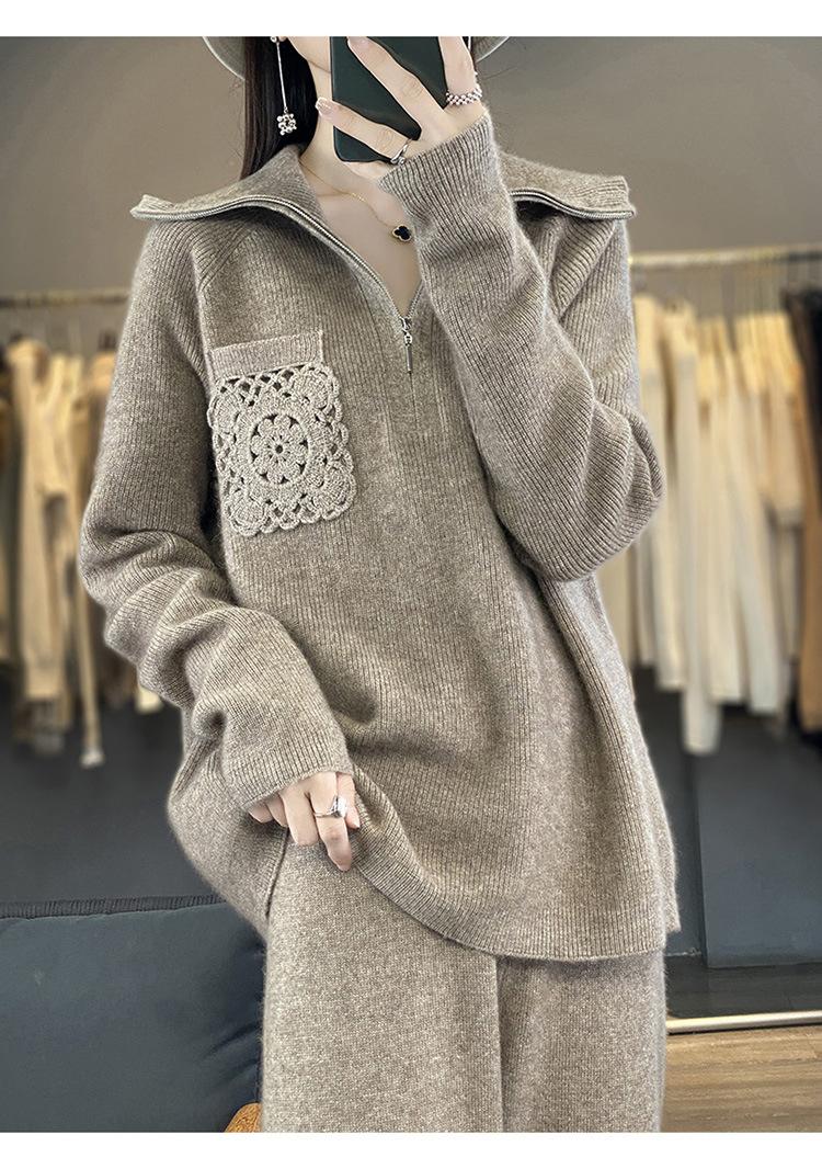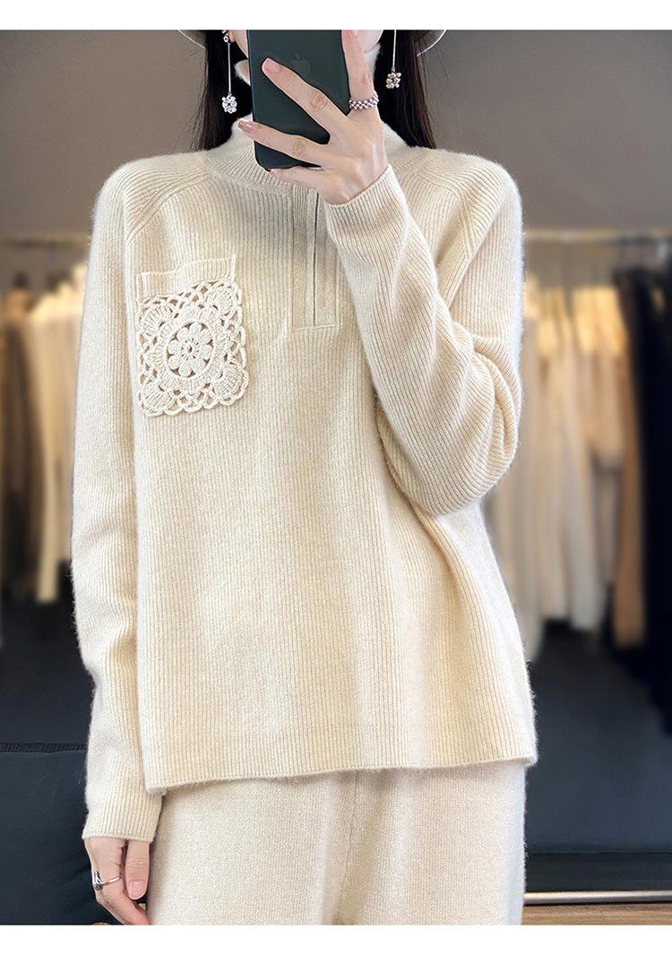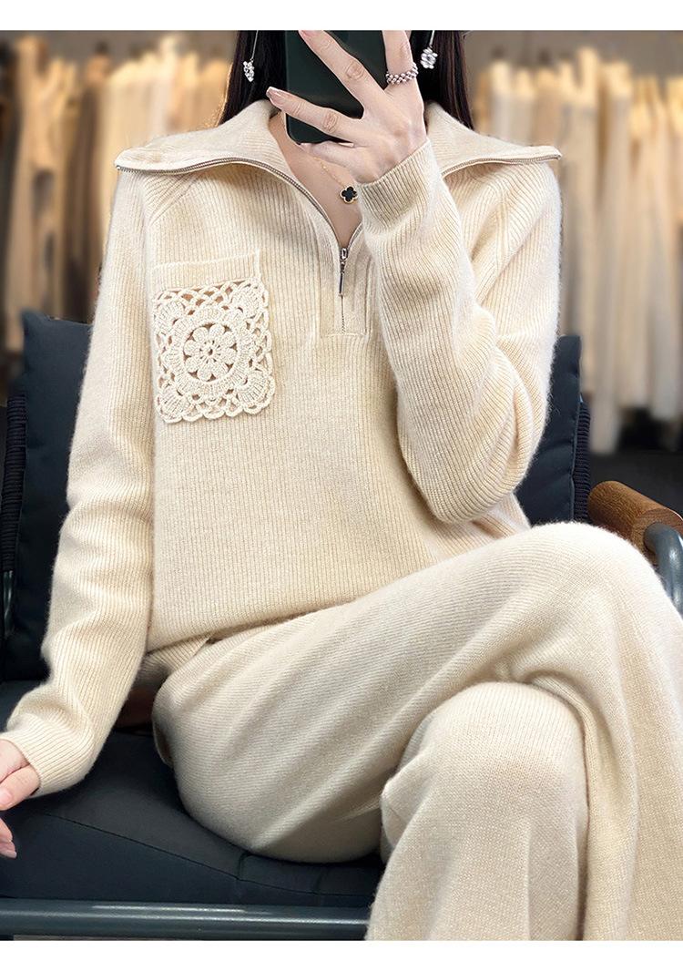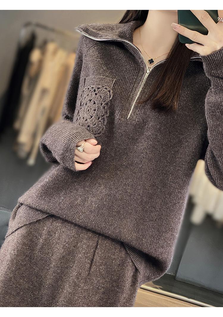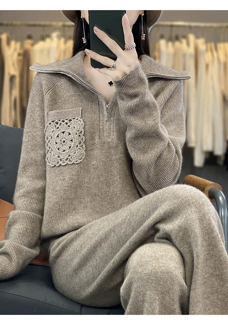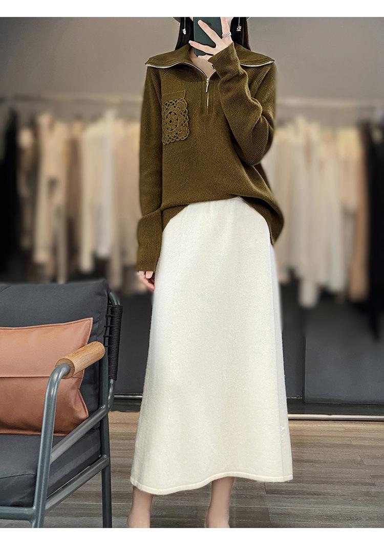 100% Lana Pura Otoño e Invierno 2025 Nuevo Camiseta de Fondo de Punto Cálida Corta Suelta con Solapa Abierta y Media Cremallera para Mujer