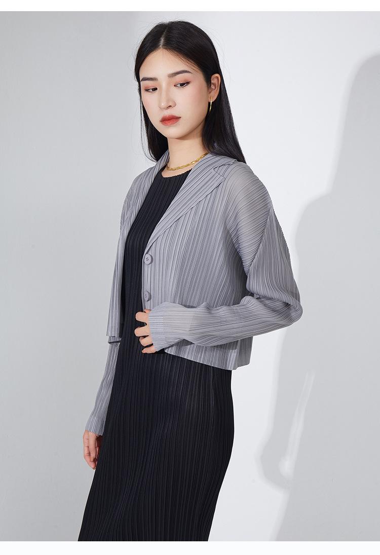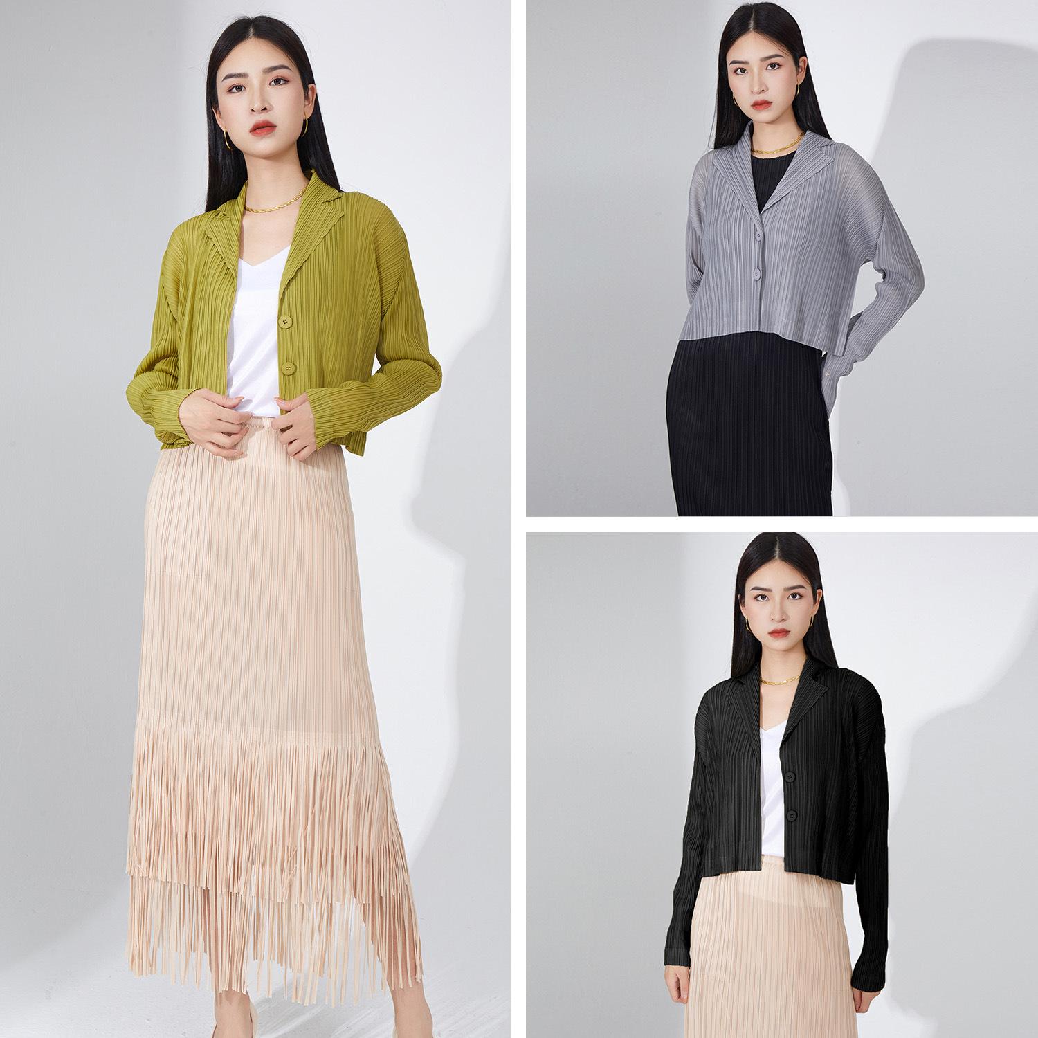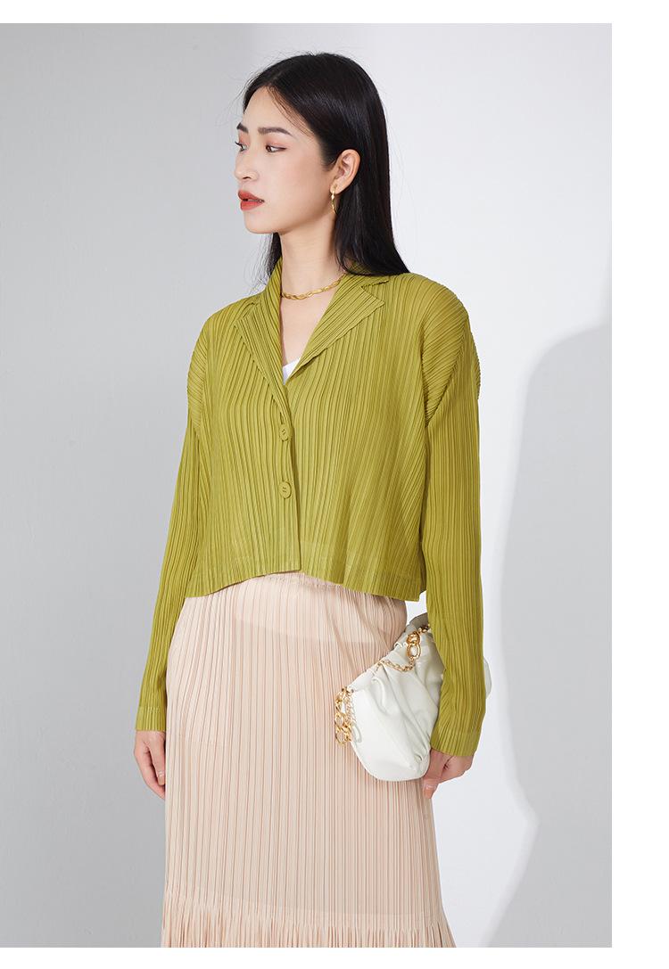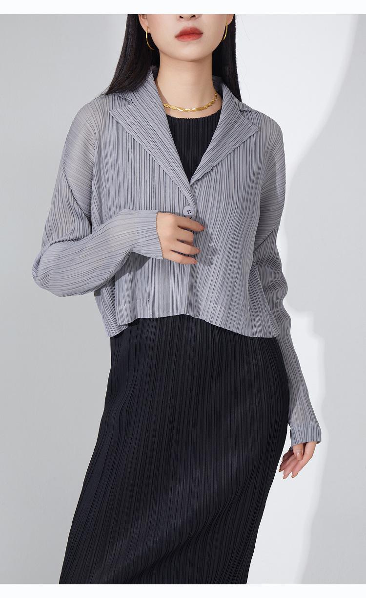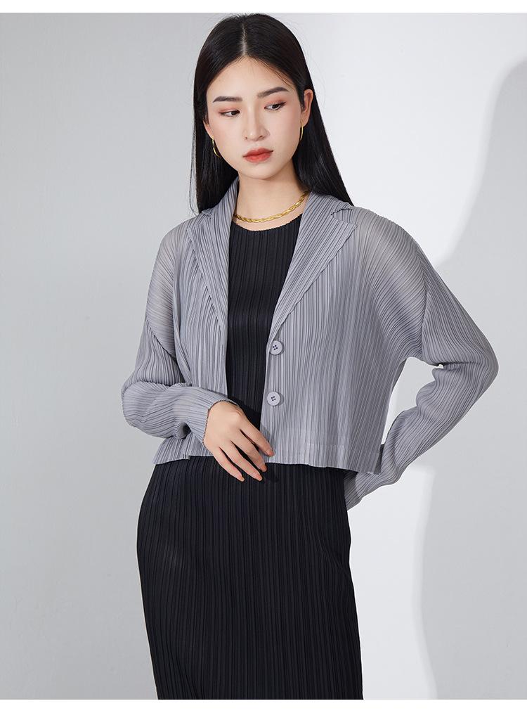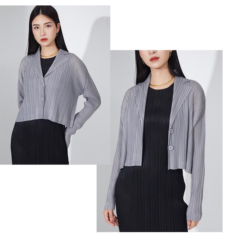 Abrigo de traje plisado informal y holgado para mujer, corto, de otoño, con hebilla de color liso, manga larga, cárdigan, top de traje pequeño