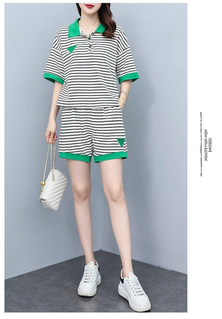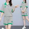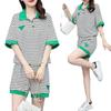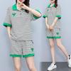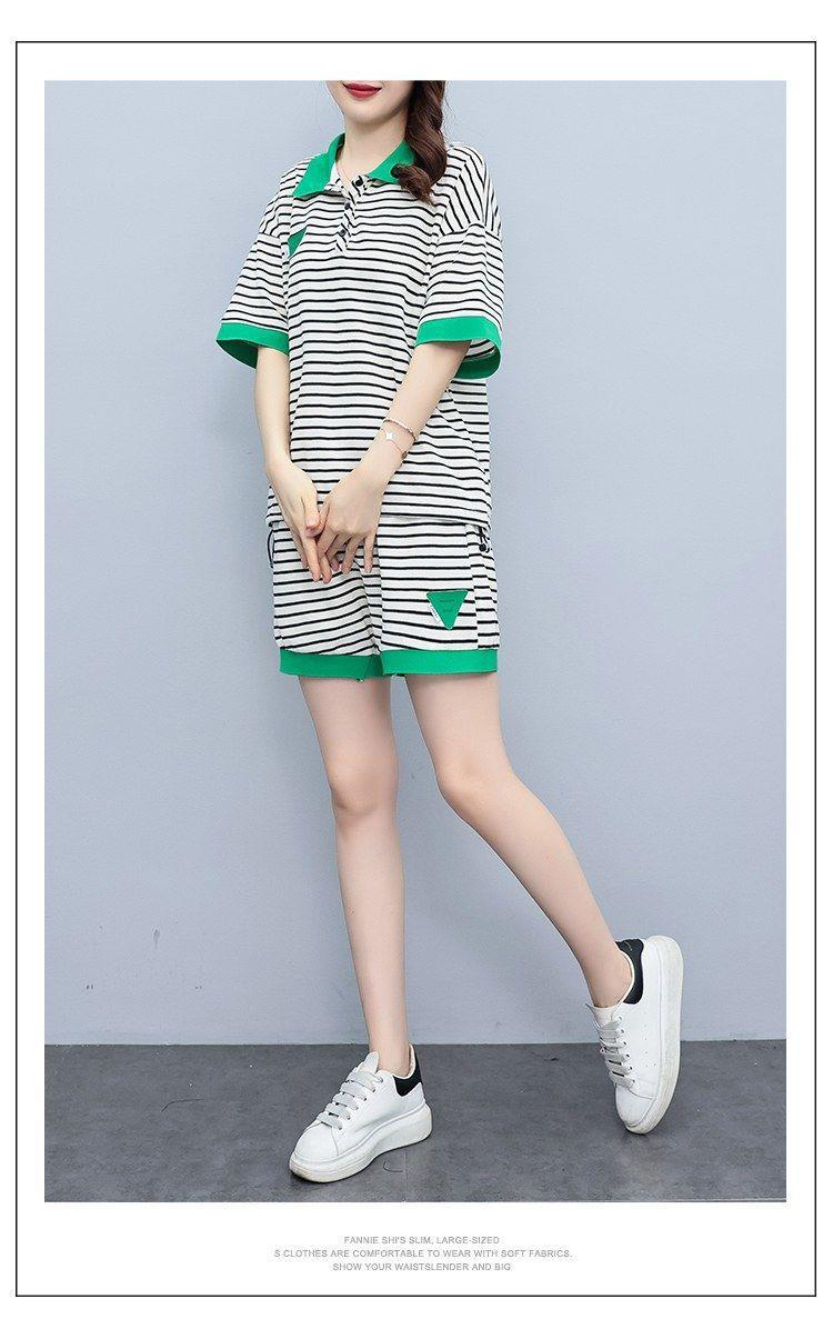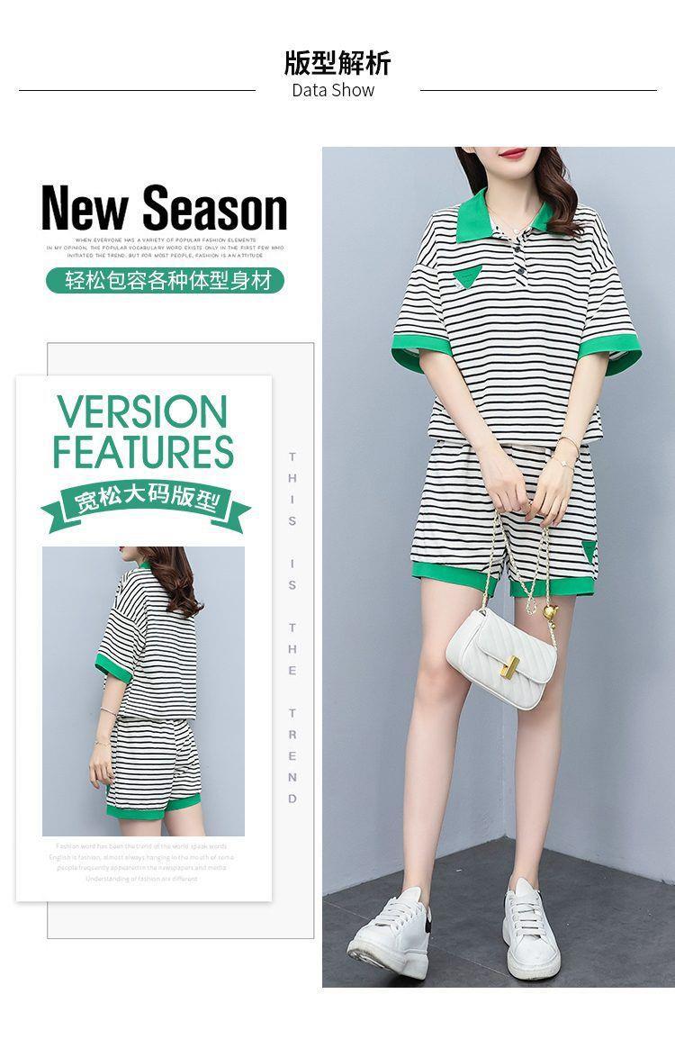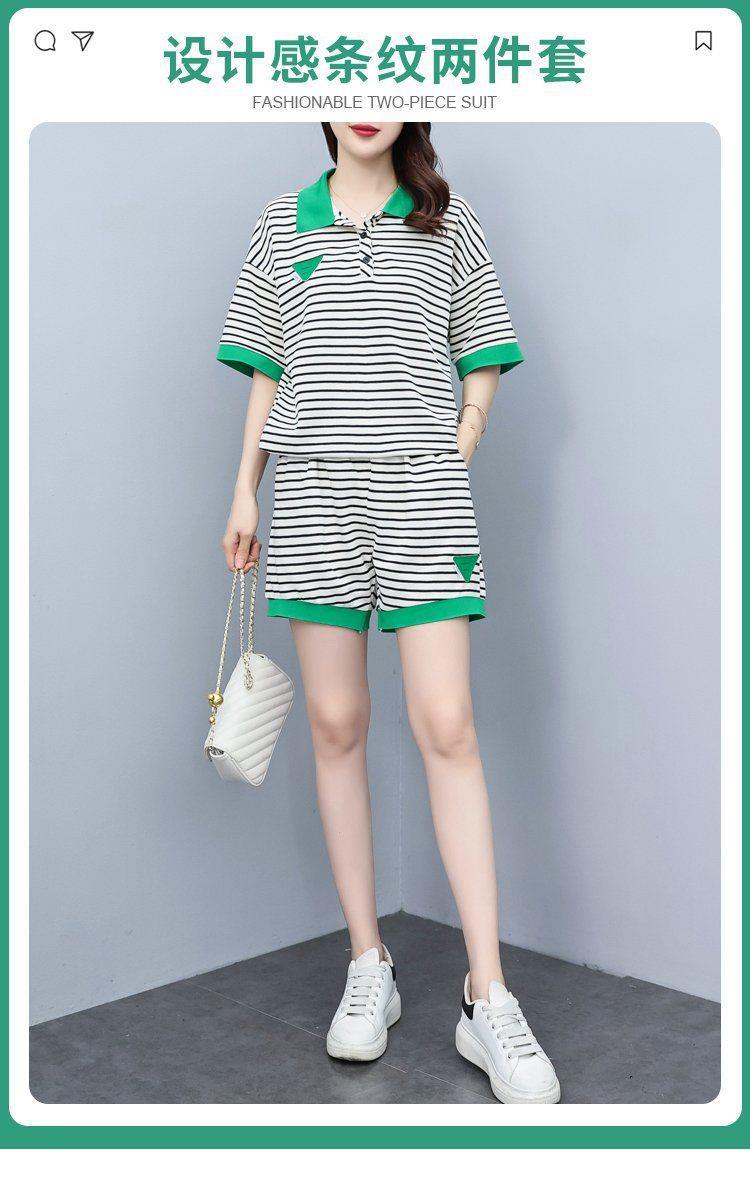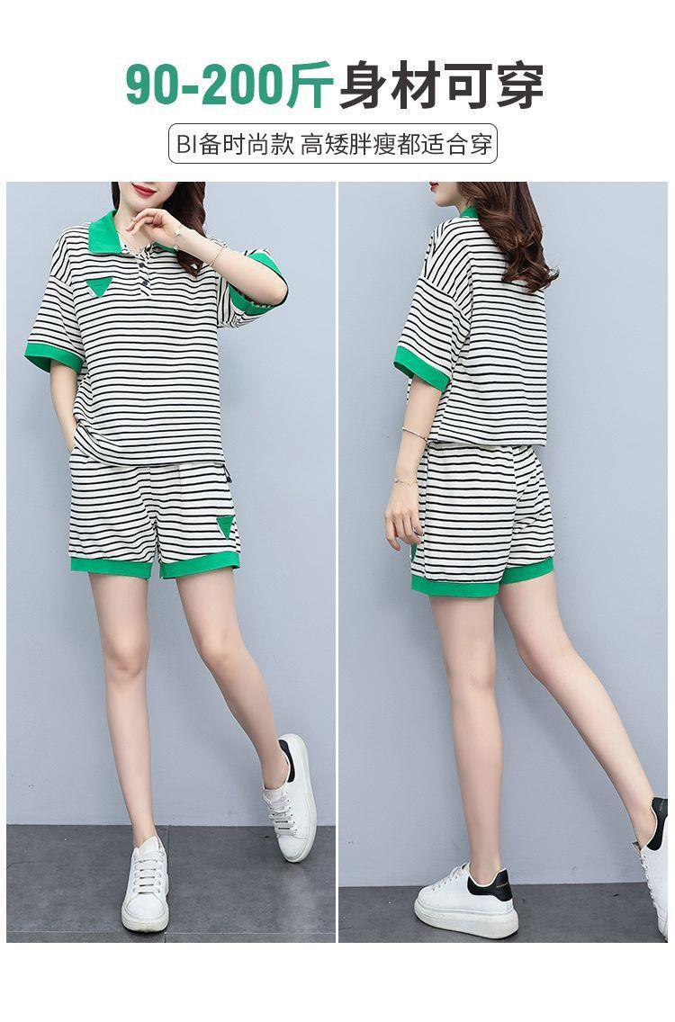 Traje de manga corta para mujer, estilo europeo y americano, talla grande, 200 Jin, camisa polo holgada a rayas, pantalones cortos, traje de dos piezas