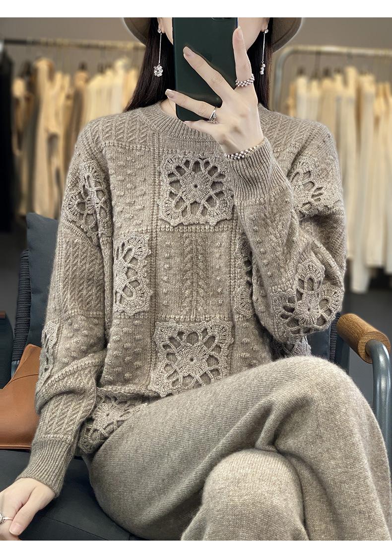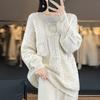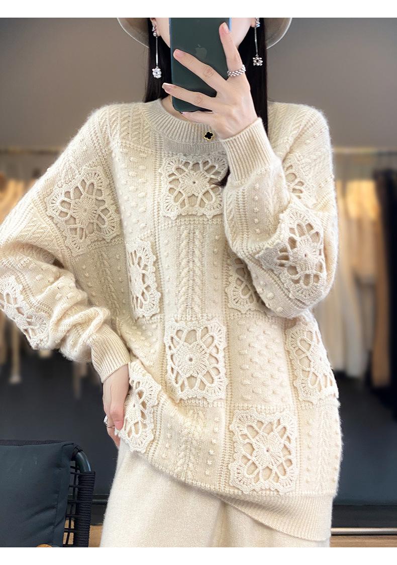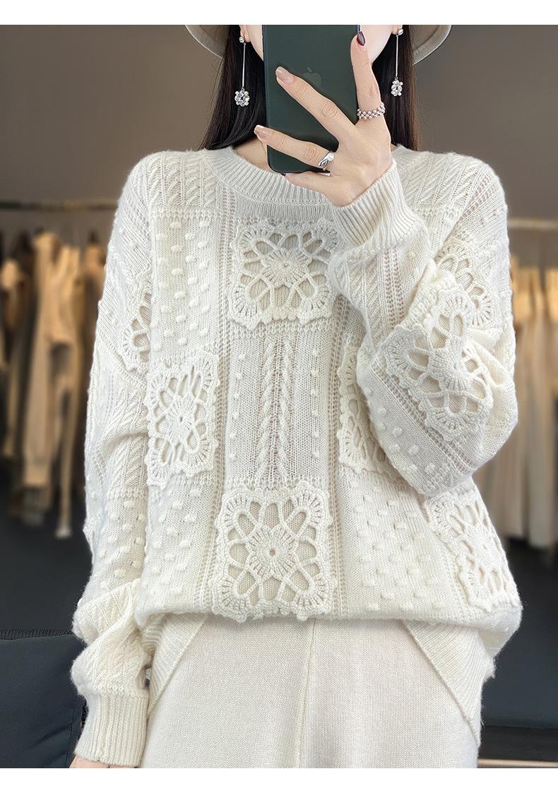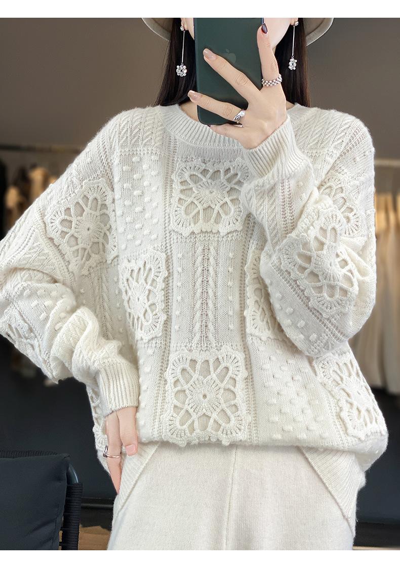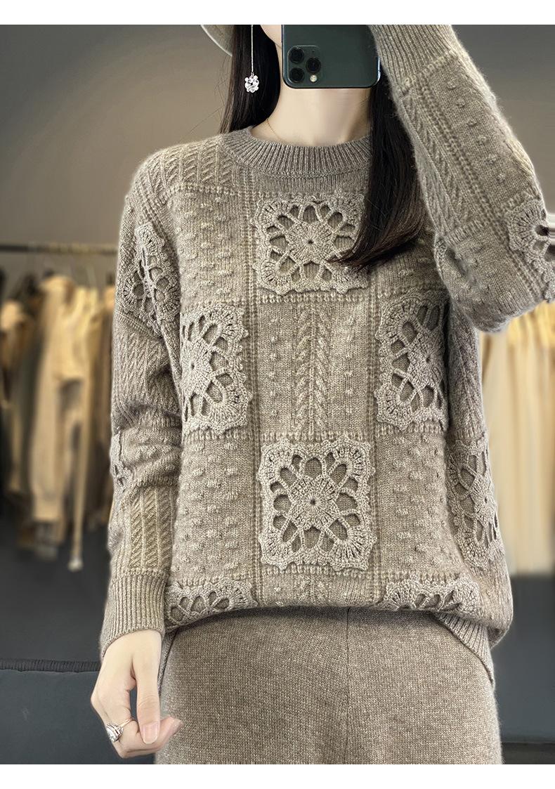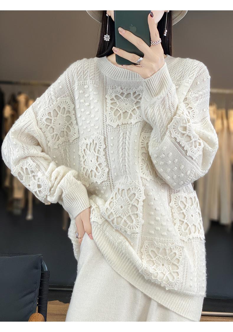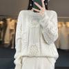 Suéter de lana pura para mujer, cuello redondo, hecho a mano, tejido a crochet, holgado, estilo perezoso, camisa de punto grueso, de moda