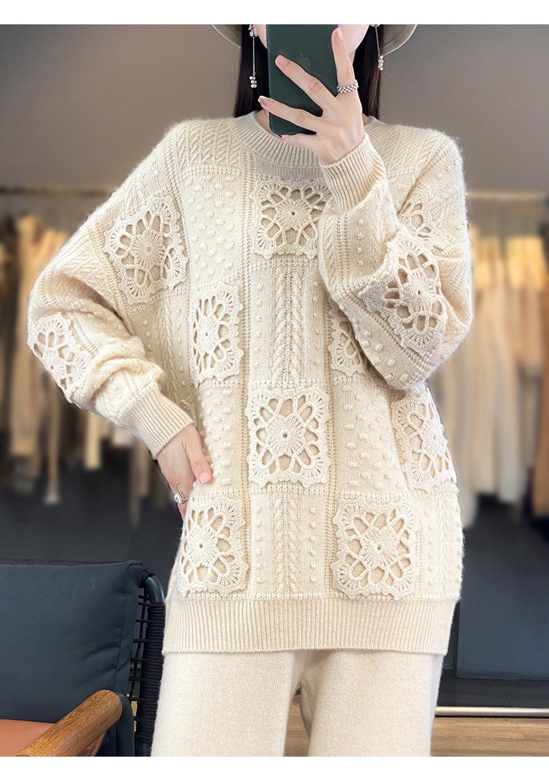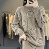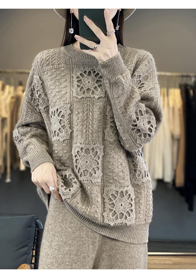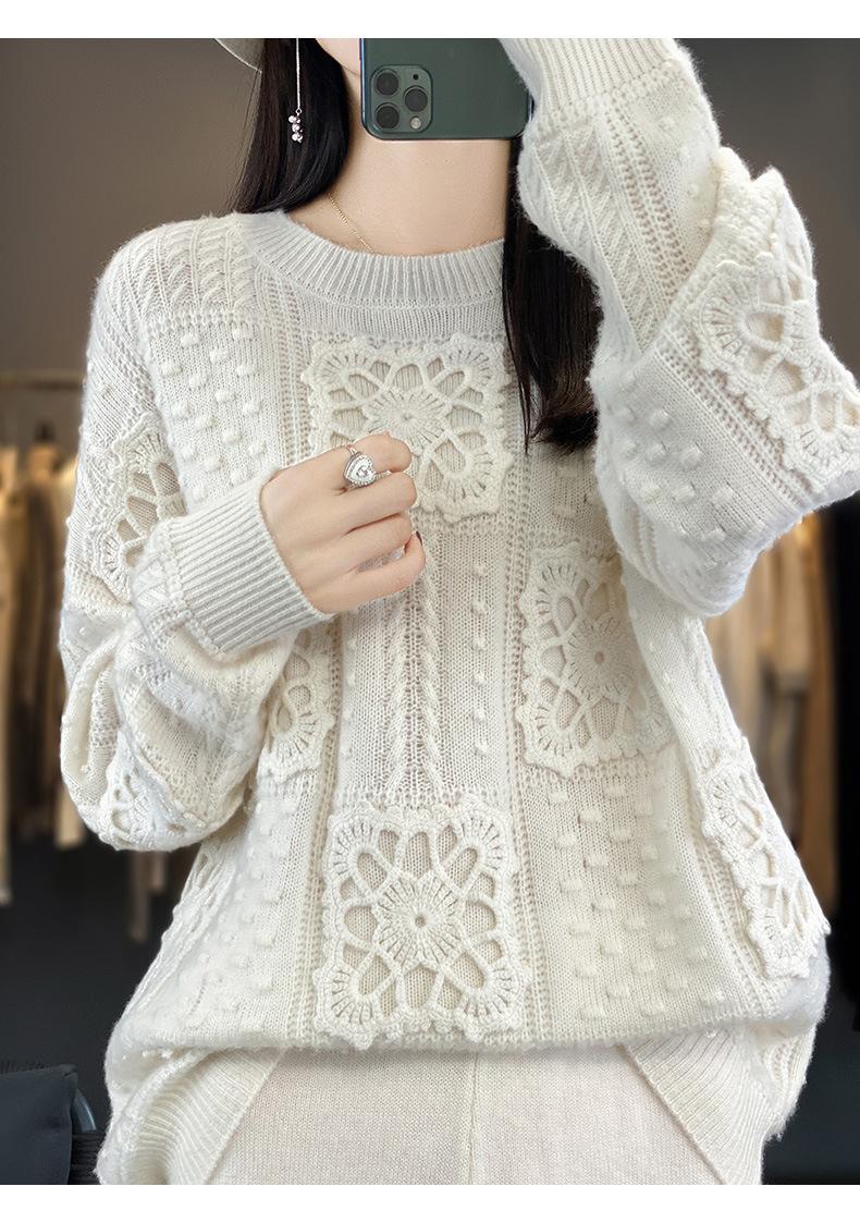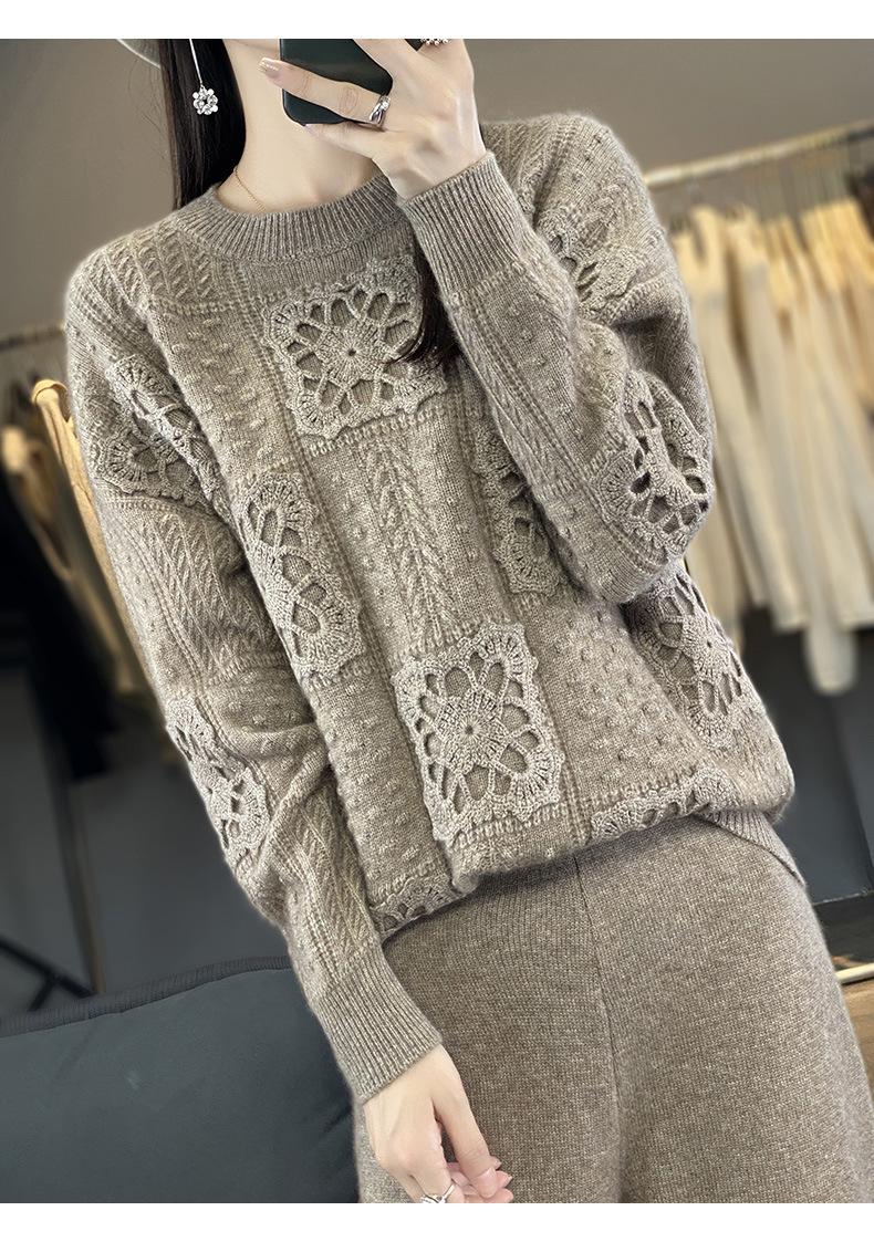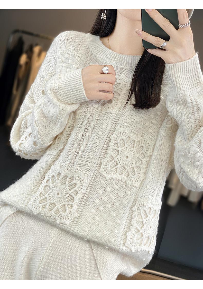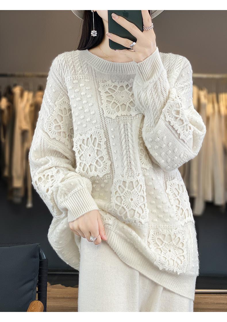Suéter de lana pura para mujer, cuello redondo, hecho a mano, tejido a crochet, holgado, estilo perezoso, camisa de punto grueso, de moda