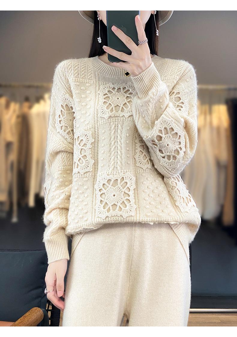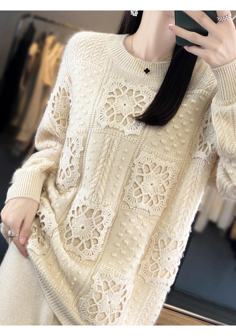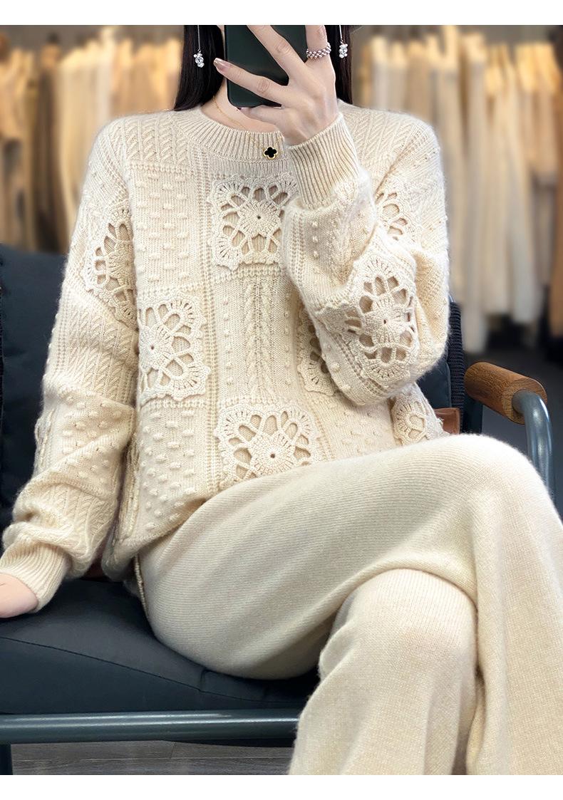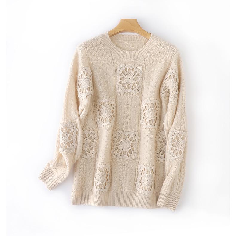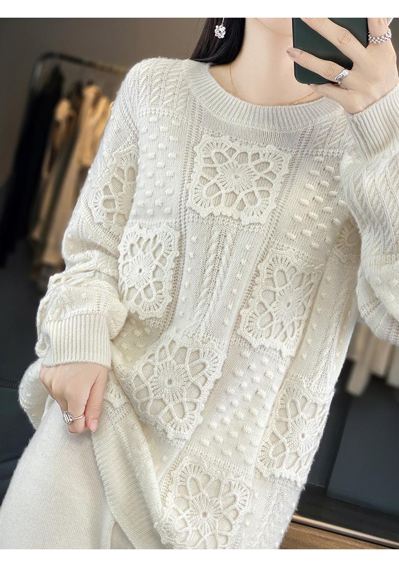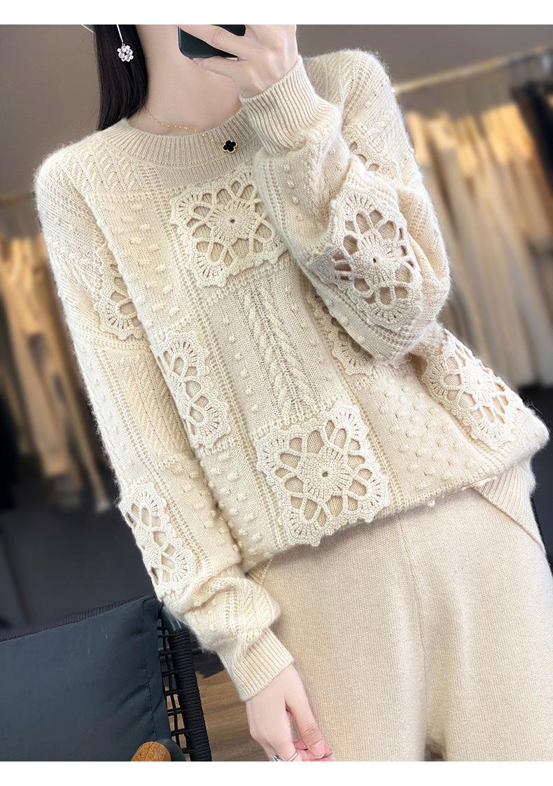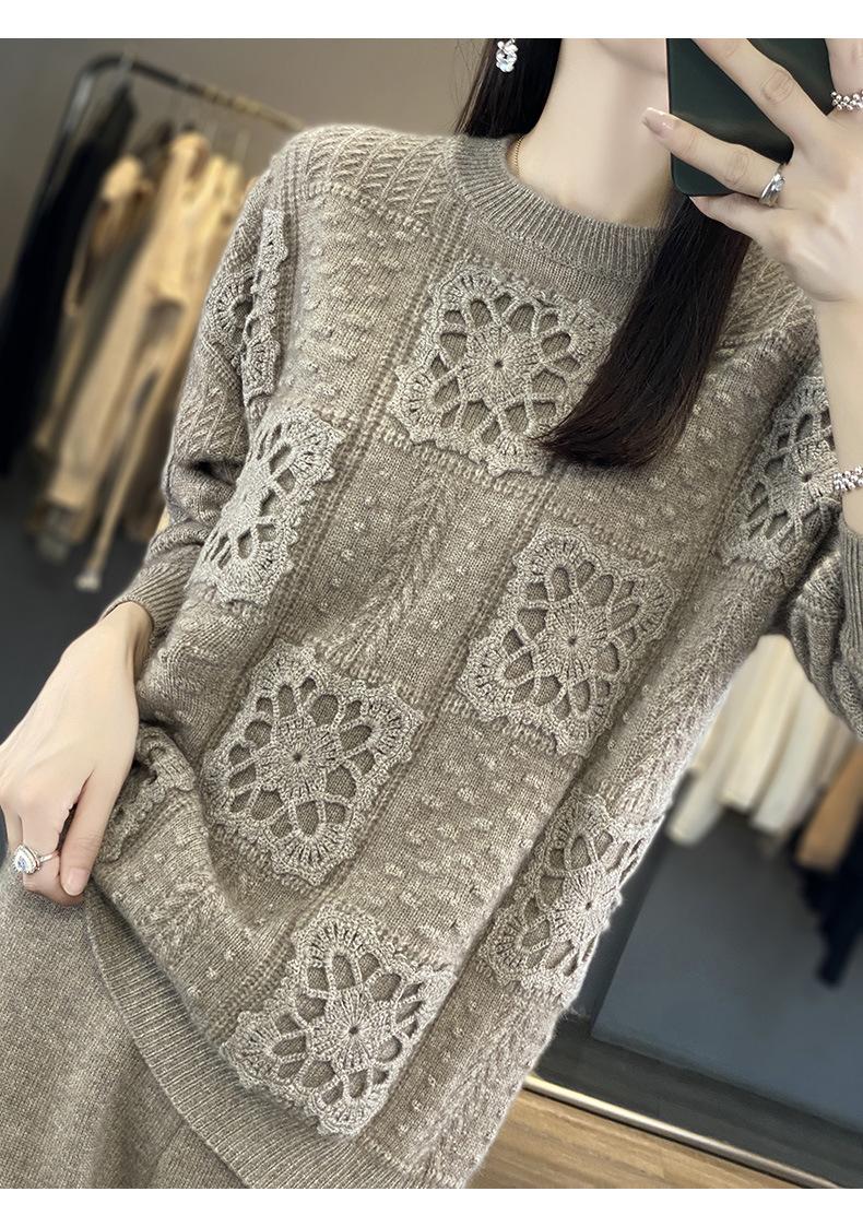 Suéter de lana pura para mujer, cuello redondo, hecho a mano, tejido a crochet, holgado, estilo perezoso, camisa de punto grueso, de moda