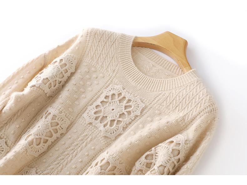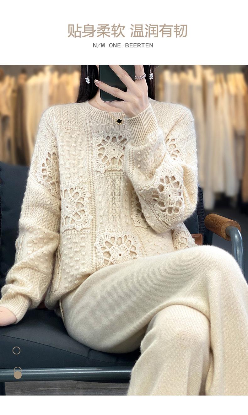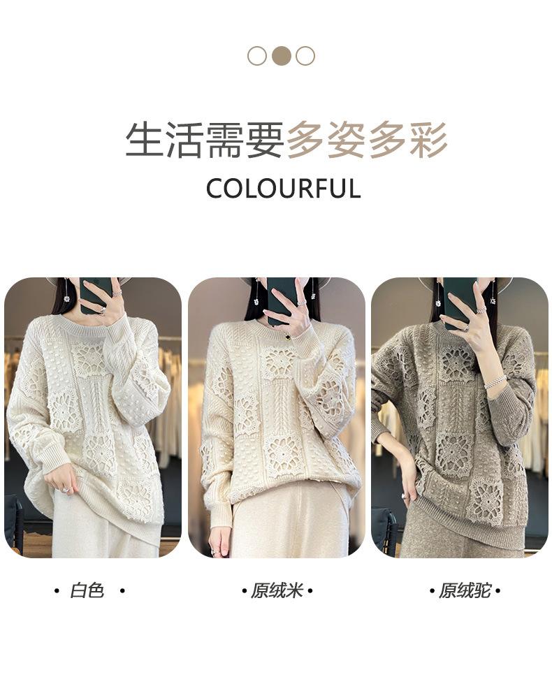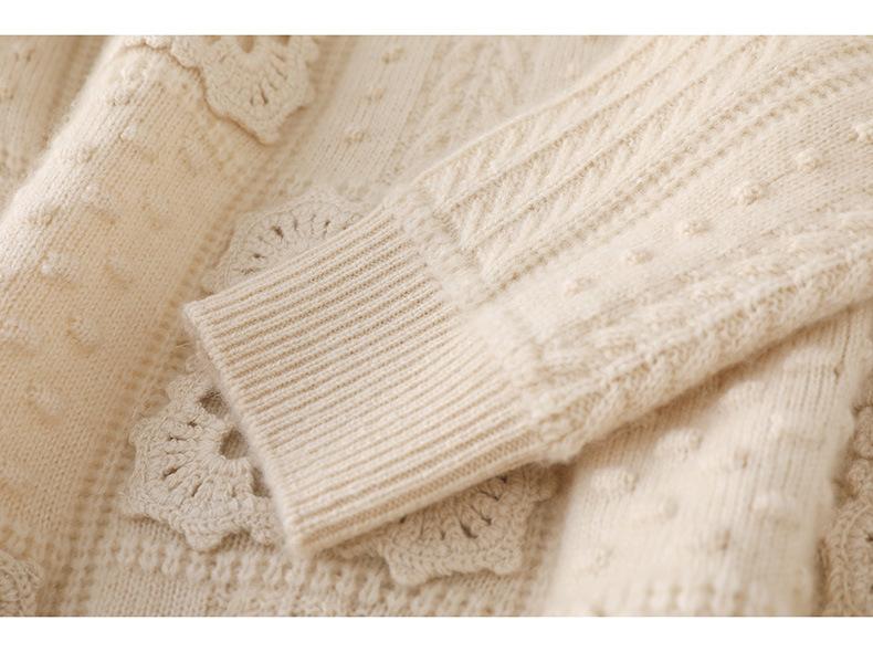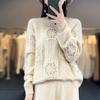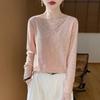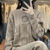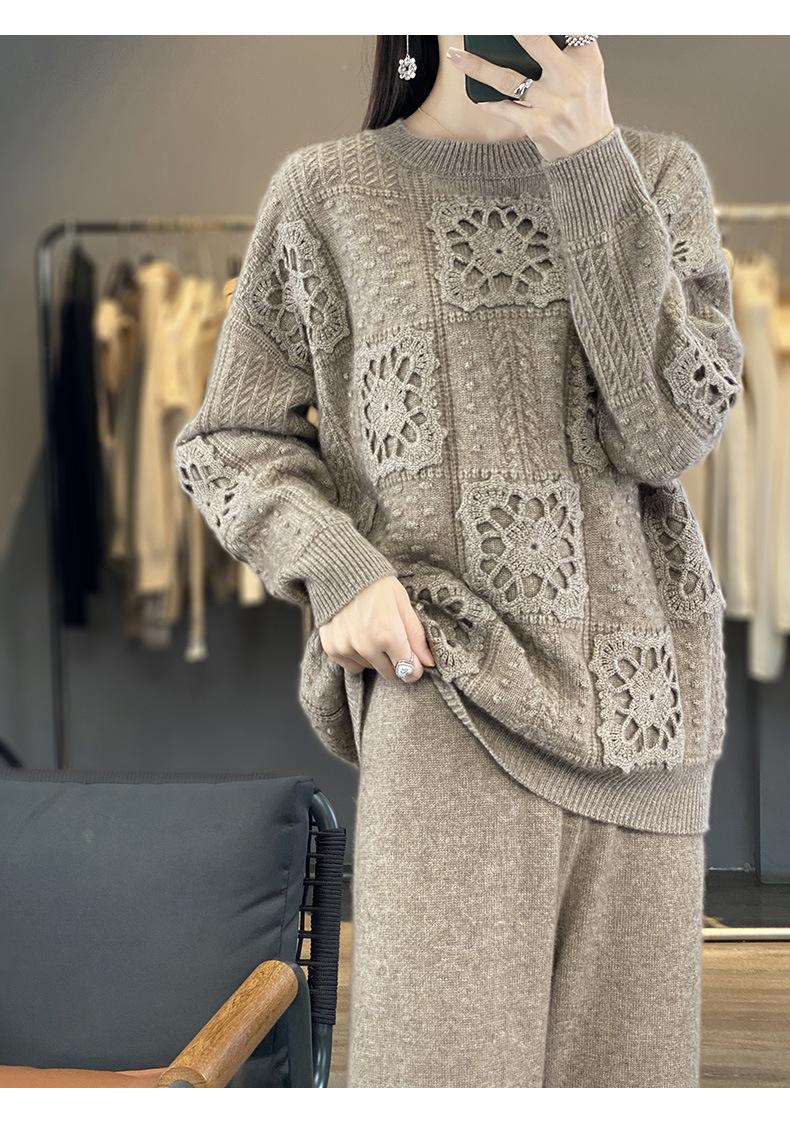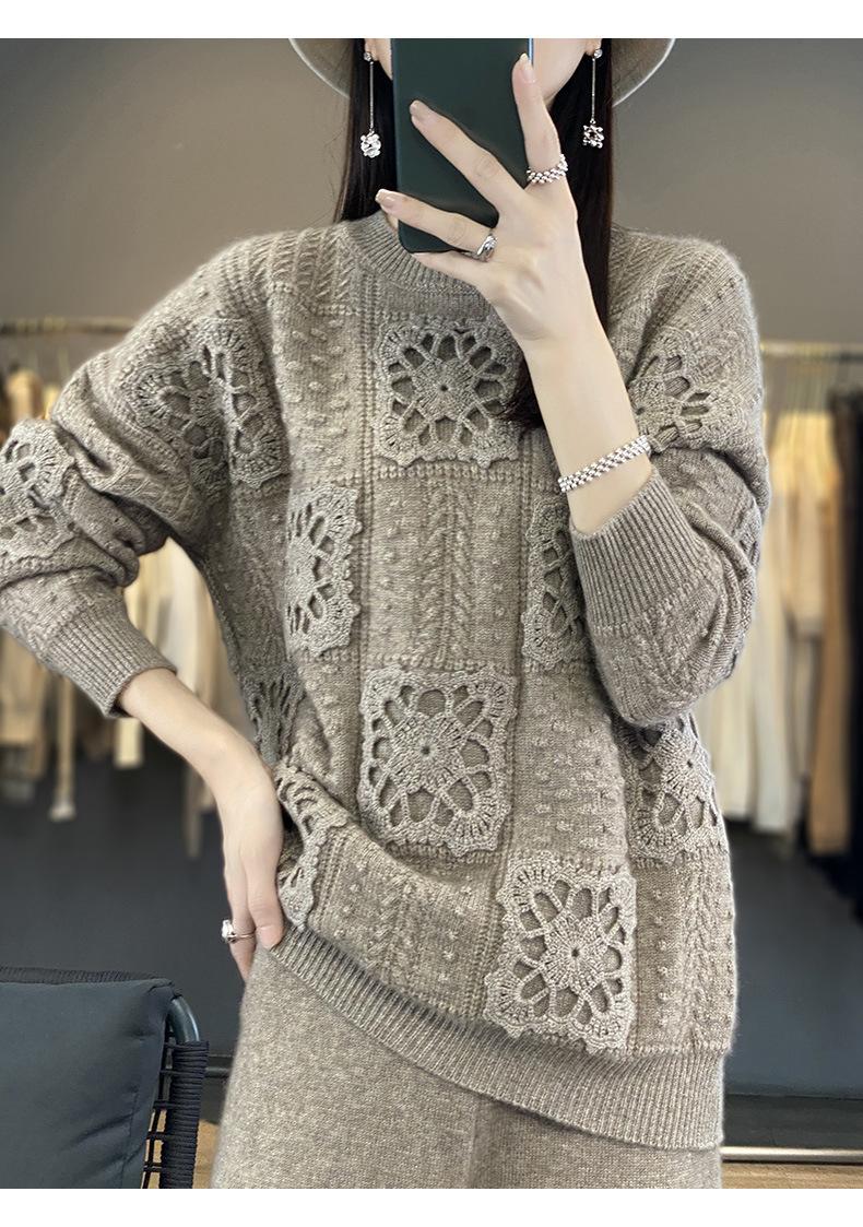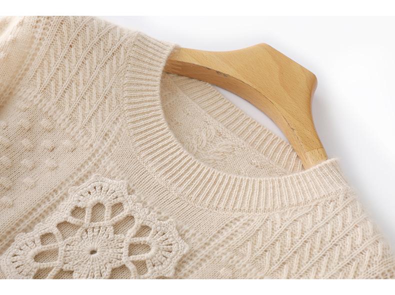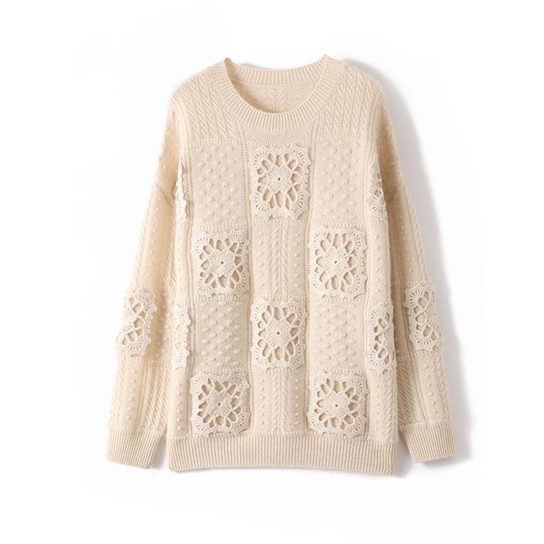 Suéter de lana pura para mujer, cuello redondo, hecho a mano, tejido a crochet, holgado, estilo perezoso, camisa de punto grueso, de moda