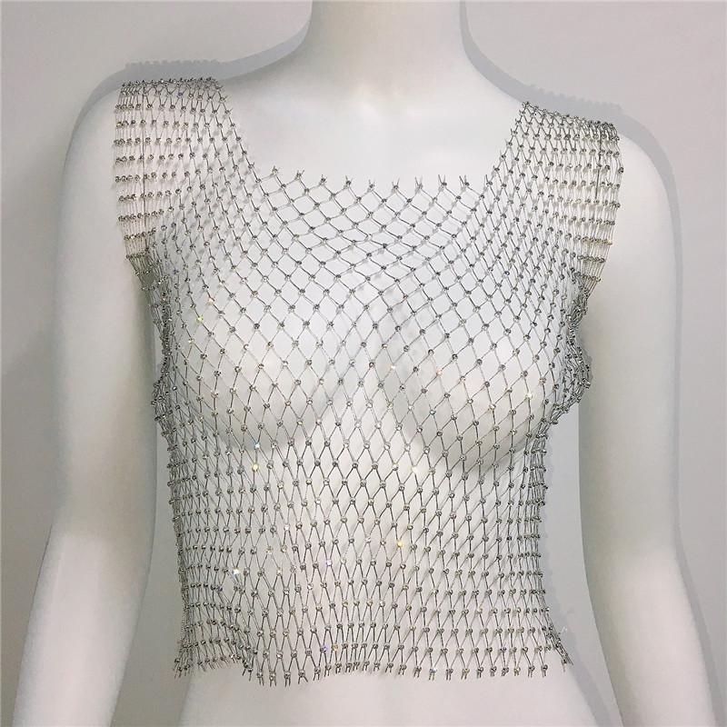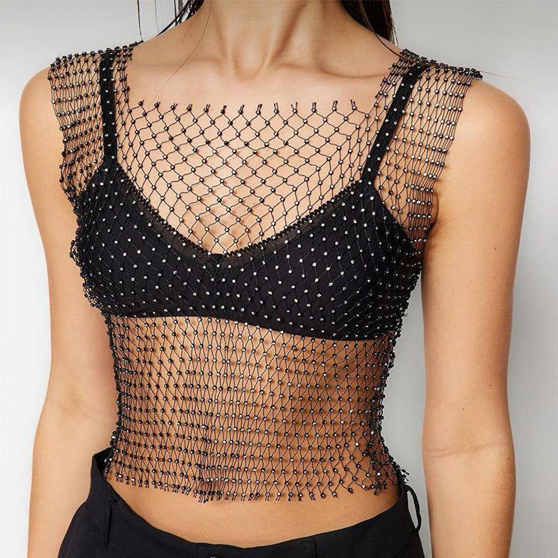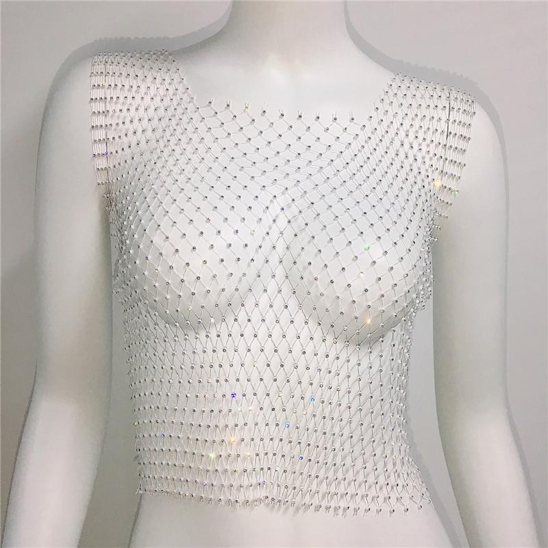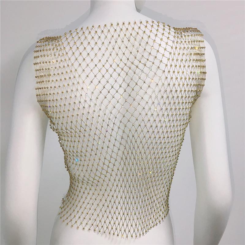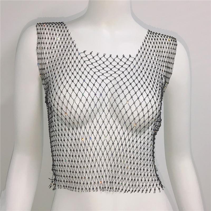 Conjunto de Belleza PU Chaleco Transfronterizo Europeo y Americano Sexy Top de Red con Pedrería Chaleco de Malla Popular con Diamantes de Imitación para Mujer de Amazon