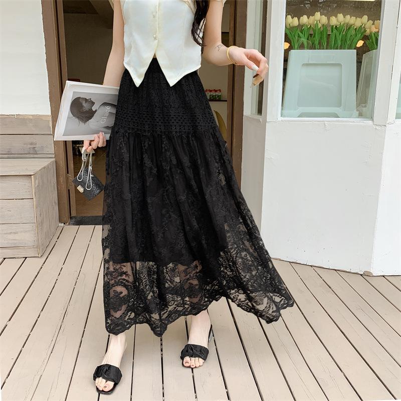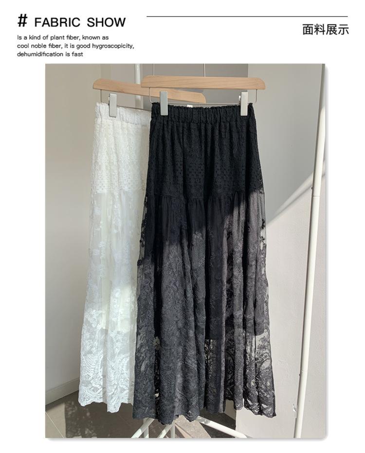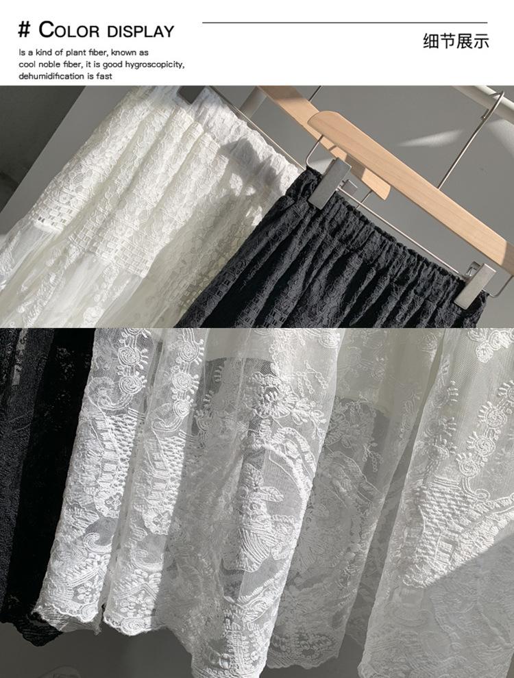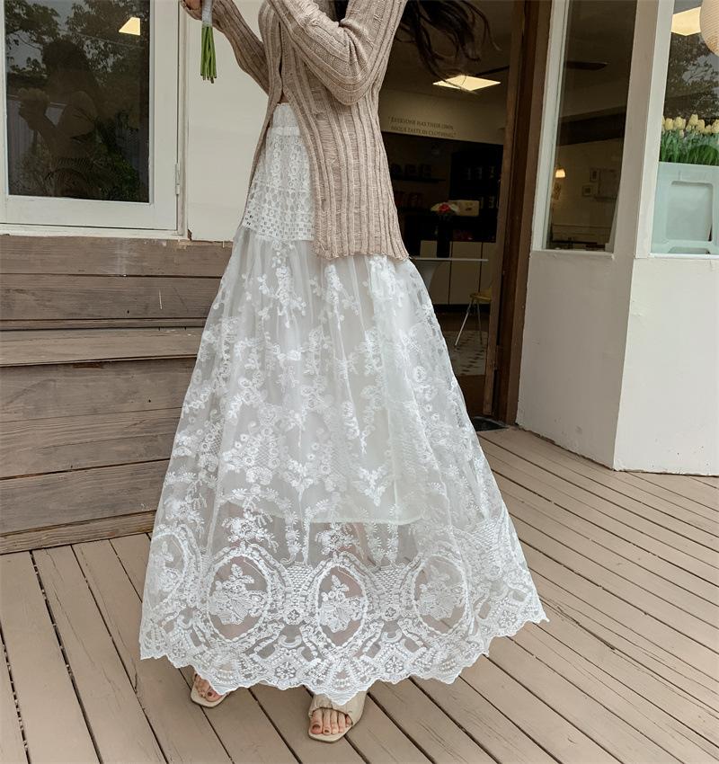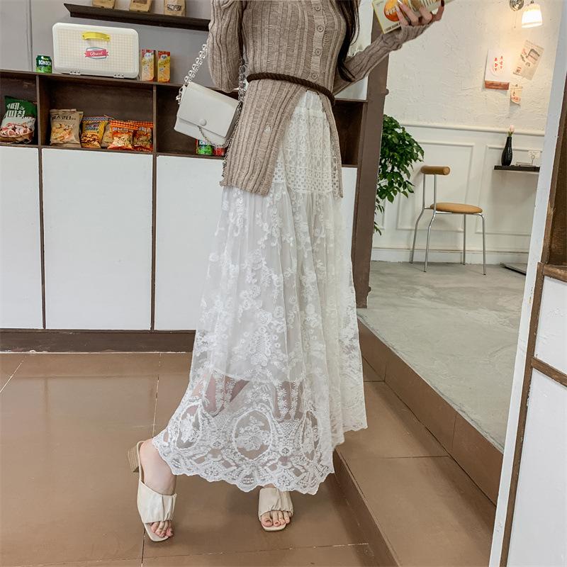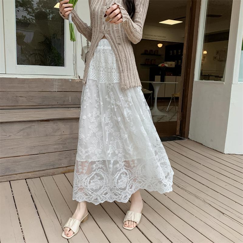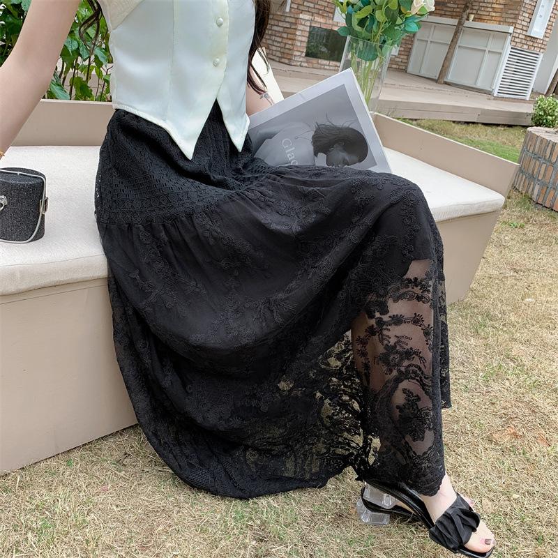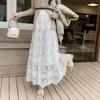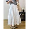 Falda de cintura alta de encaje blanco estilo francés para mujer, primavera/verano 2024, falda de corte A, falda tipo paraguas, falda elegante de longitud media y gran vuelo.