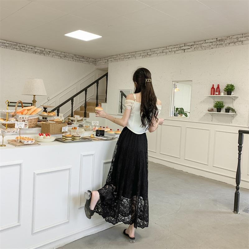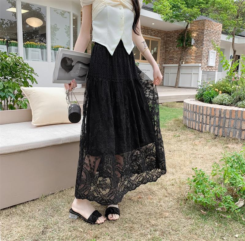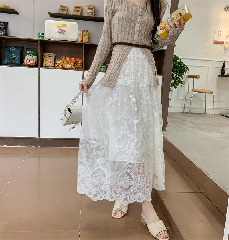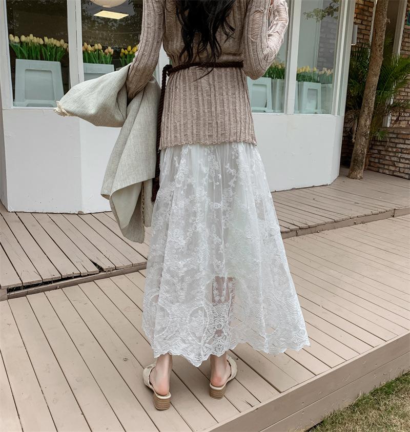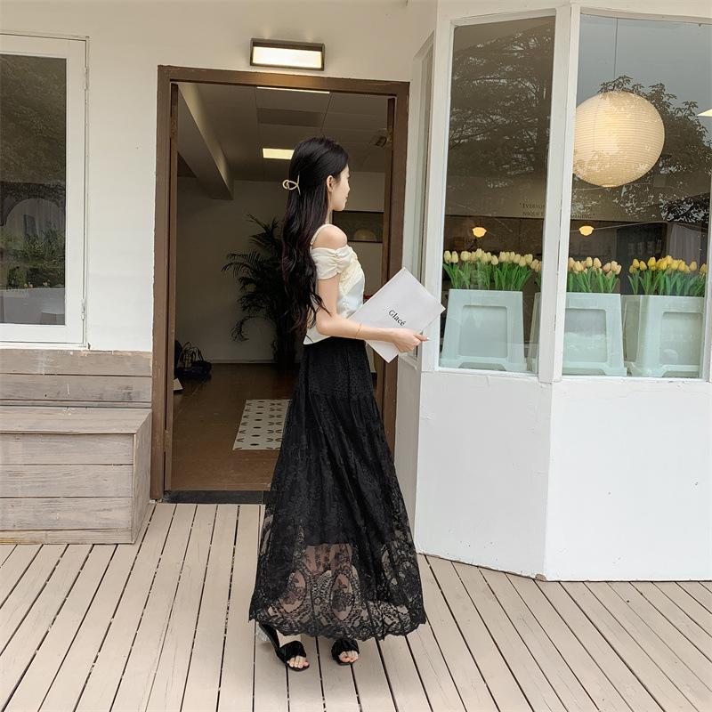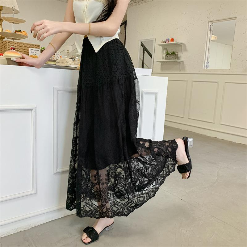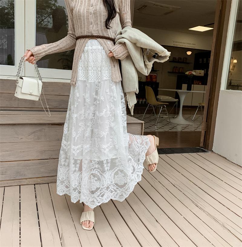 Falda de cintura alta de encaje blanco estilo francés para mujer, primavera/verano 2024, falda de corte A, falda tipo paraguas, falda elegante de longitud media y gran vuelo.